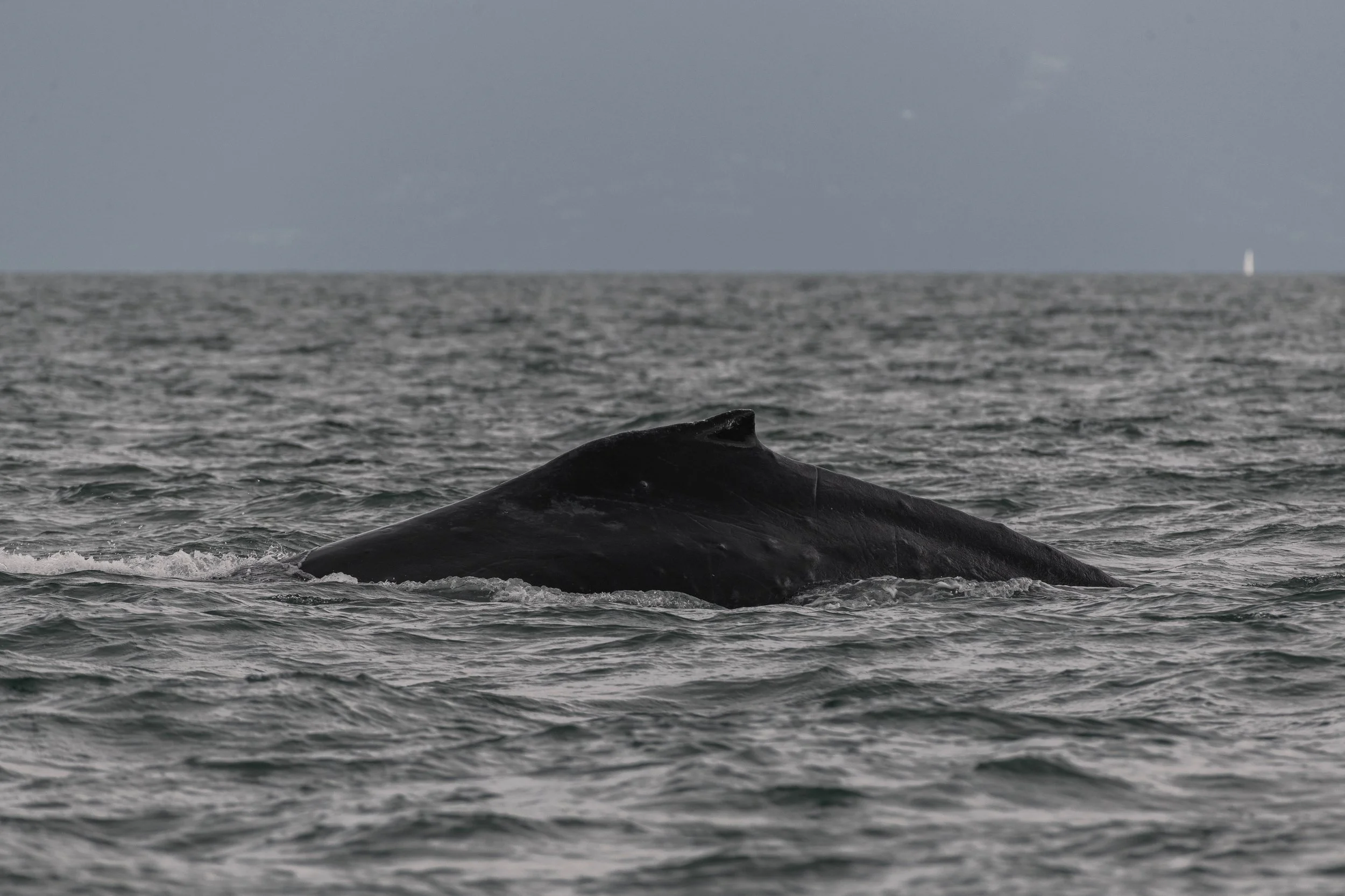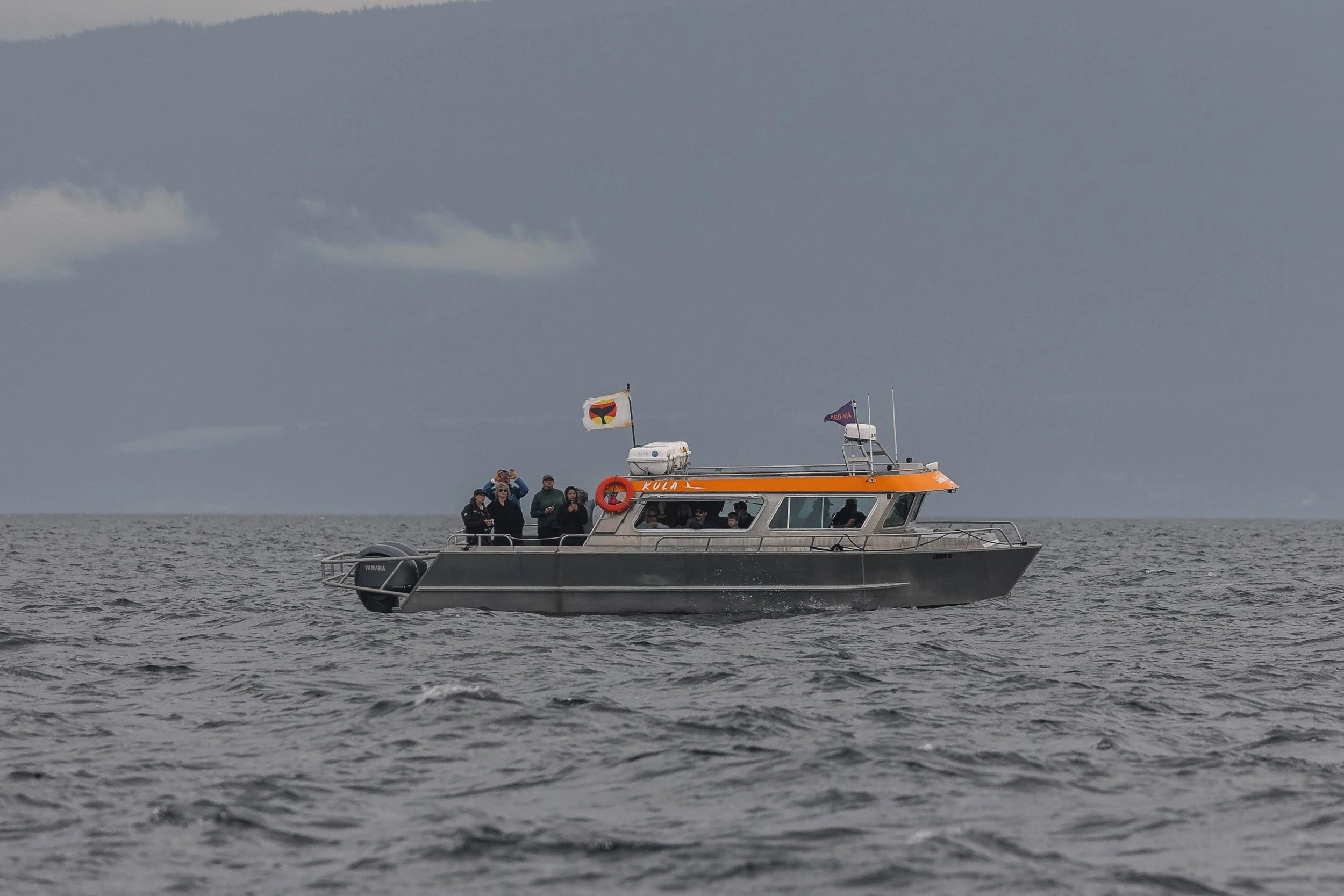 While it’s always exciting to get some wildlife before the tour starts, we were excited to continue onto the water to see what else was in store for us today. It didn’t take too long before we spotted our first whale of the day, a humpback whale named Barge Boy (KEX0078)! Barge Boy seemed to be resting at the surface, gently exhaling and inhaling before dipping just below the water without lifting their tail. This behaviour, known as logging, thanks to the resemblance a sleeping humpback whale has to a log on the water, is one of the more common ways to see these whales sleeping. Whales sleep in a special way, since they need to stay somewhat alert, since each breath that they take is something the whales need to think about. This means that part of their brain needs to stay active, and only half gets to rest at a time, alternating sides with little power naps throughout the day. The great thing about a sleeping whale is that they spend a ton of time at the surface, since they aren’t going for the deep feeding dives that we usually see from the whales. After spending some time with the sleepy Barge Boy, we continued on our search.