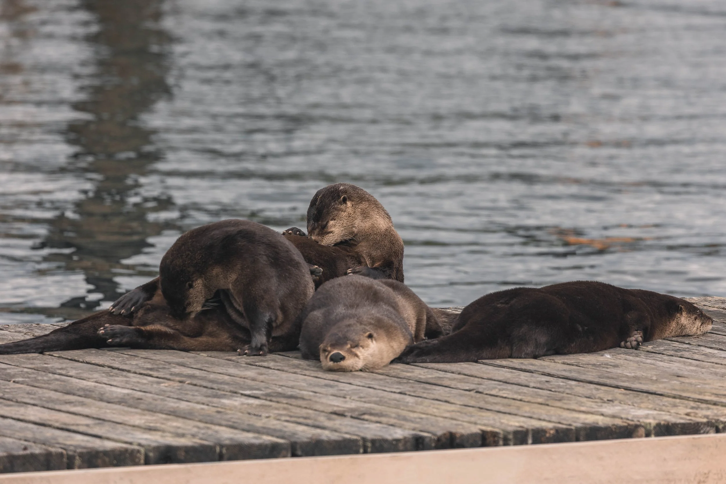 A cuddle puddle of River Otters on the dock. Photo by Jordan Robinson.