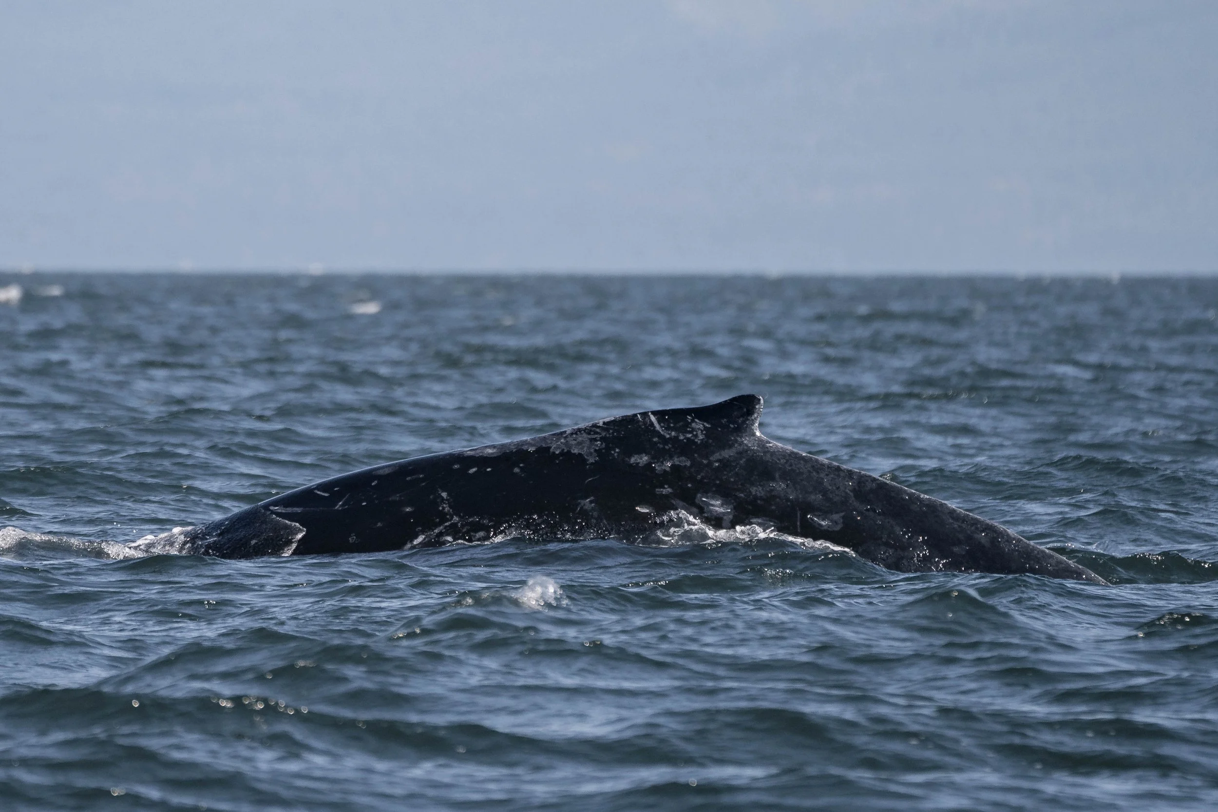 Our first humpback was being a bit fluke-shy as we observed them. Usually, we try to obtain a clear photo of the underside of their tails to compare with our catalogues and confirm their identities. For this whale, though, we had to be a bit more creative. Using a combination of their dorsal fin and the side angle of their fluke shots, we were able to confirm them as Seltzer (BCY1274). Seltzer is a relatively new whale to our area, with their first confirmed sighting being in 2021. Unlike orca, humpbacks do not have any particular physical qualities that change as they age, causing us to label most larger whales as ‘adults’ without a defined birth year. On top of this, humpbacks show minimal sexual dimorphism, so most of the time, we don’t know if they are male or female. Typically, humpbacks remain an unknown gender unless we spot them with a calf (then we assume they are female) or if they are spotted tail lobbing/breaching at such an angle that we can get a photo of the underside of their peduncle (the muscular section that connects the fluke to the body). Here, there is a tiny ‘bump’ known as the hemispherical lobe. While scientists are still unsure what this bump does, they do know that it is only found in females - much more subtle than the massive dorsal fins of orca males vs the small dorsal fins of orca females!