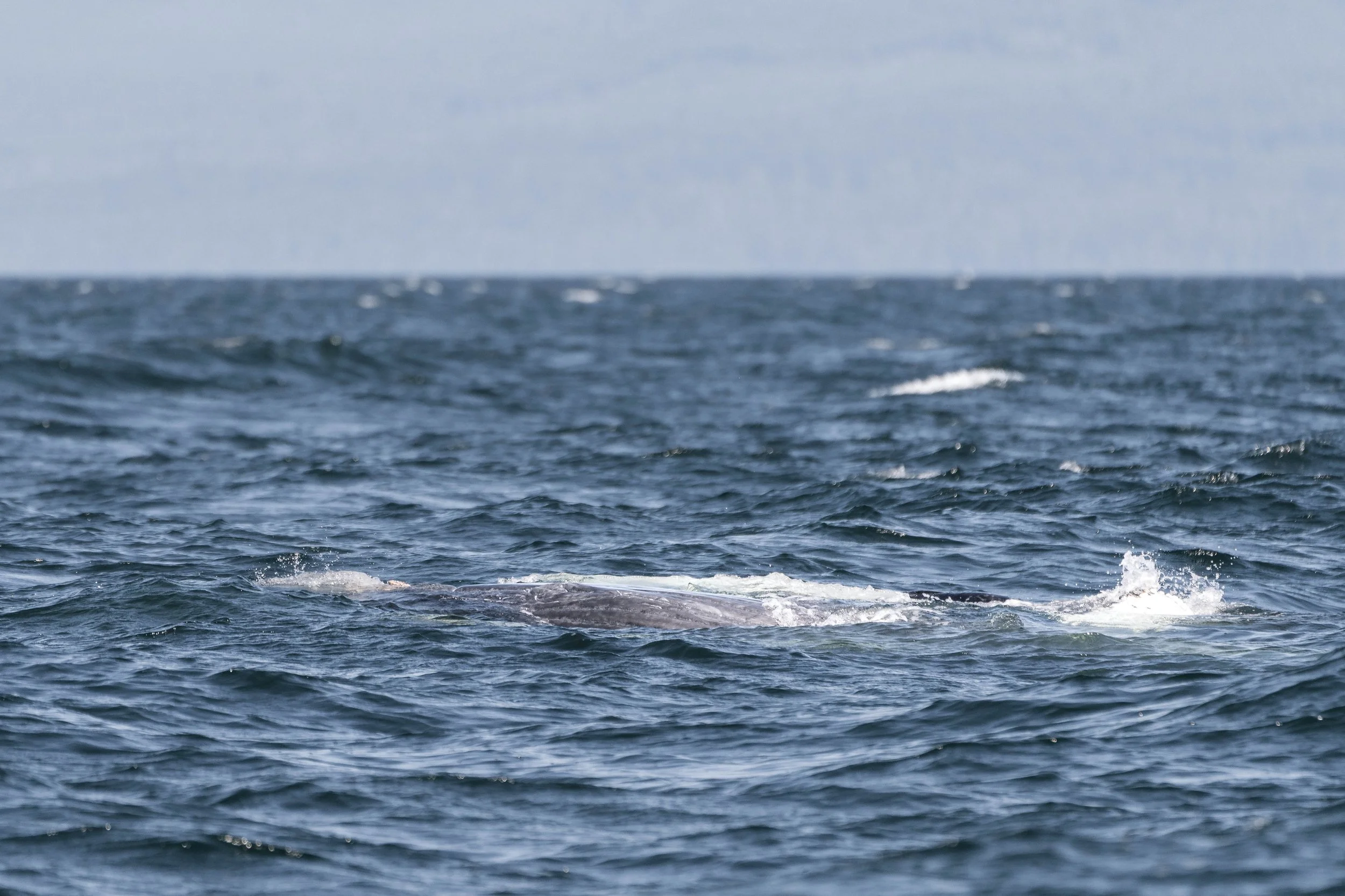 This display of acrobatics must have burned off a lot of energy as the activity died down and we got to enjoy some tranquil time with the humpbacks before we left. Valiant’s calf was tucked in very close beside her and appeared to be rolling on its side, leading us to believe they may have been feeding from mom towards the end of our encounter. In order to feed, humpback babies will use their rostrum to nuzzle mom’s belly beside her mammary slits, prompting her to release milk into the water. Due to the high krill content of a humpback’s diet, their milk is actually pink! The milk of the Humpback Whales is also incredibly rich in fat, so it does not dissipate in the water, allowing the calf to then channel it into their mouth. As a comparison, human milk has a fat content of 3-5% whereas Humpback Whale milk has a fat content of a whopping 35-50%. This high-calorie milk means humpback calves can gain over 100lb in weight in a single day! We left our duo to their snuggles and began our search anew with the knowledge that we likely wouldn’t be able to top our wonderful encounter with these whales.