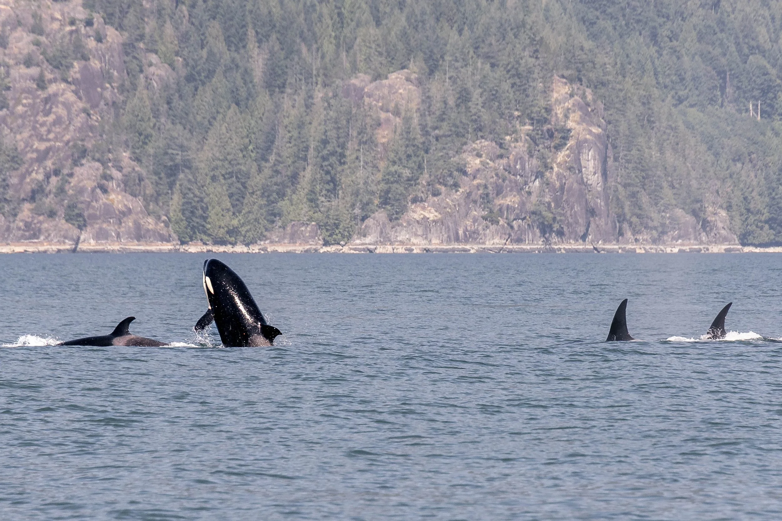 Along the shoreline of Anvil Island, a flurry of activity was visible. Upon approach, we began to make out the unmistakable dorsal fins of orcas. Before we knew it, more and more dorsal fins were popping up! Transient Killer Whales typically travel in matrilines (a group consisting of a mom and her children), but occasionally, multiple matrilines will gather together to socialize. We got to work identifying the group and were able to recognize three different families, consisting of a combined total of 14 whales: