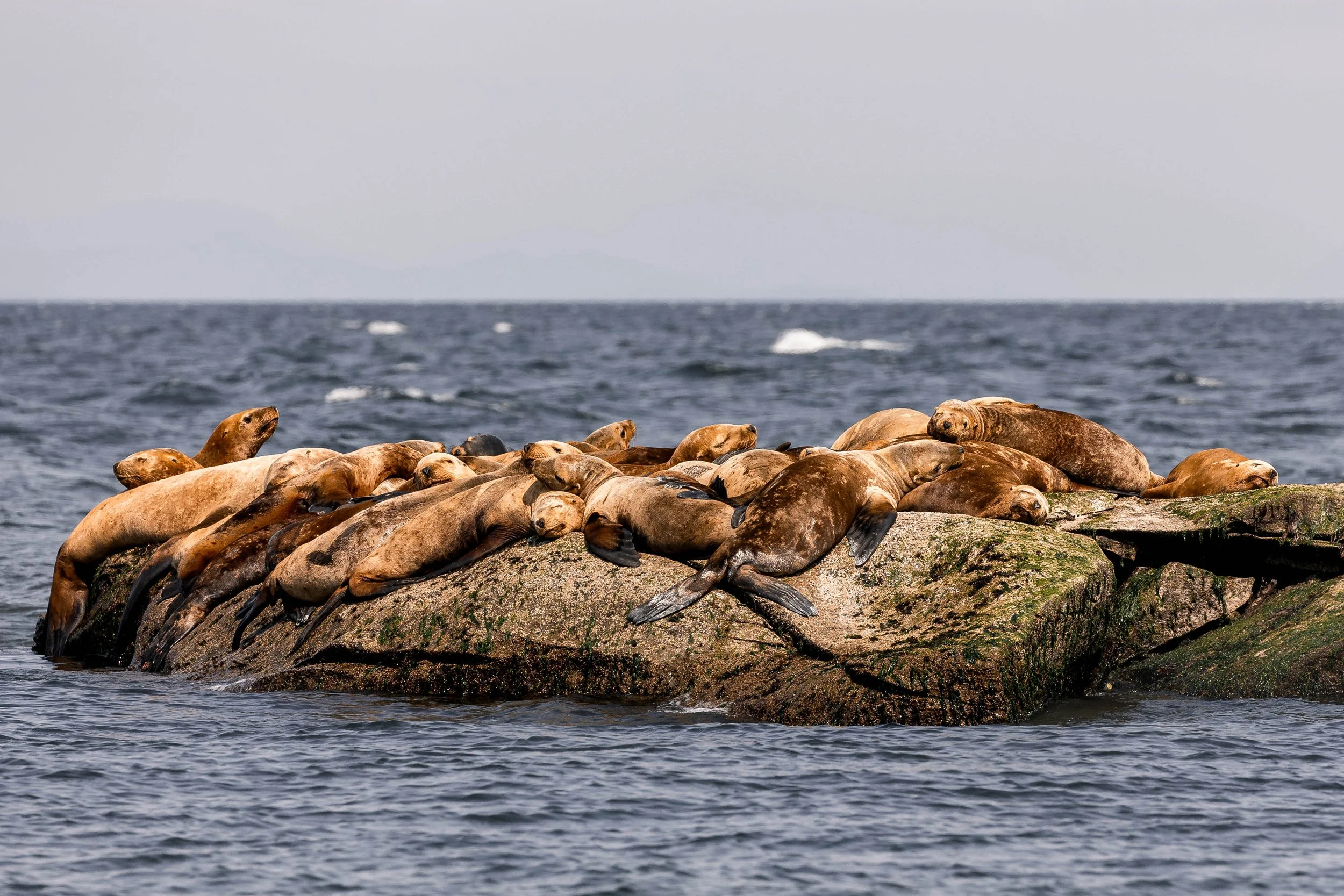 Once our time with the orca was up, we said our goodbyes and began the journey across the Strait once more. The fun wasn’t over for the day, though, and we headed out to start searching for more wildlife. The boats headed over to Stinky Rocks, a rocky island group located on the edge of the Strait. Here, several pinnipeds like to haul out, stretch, and sunbathe. Our Steller Sea Lions could be seen dogpiled together at the tip of the islands, slumbering away and enjoying the sunshine. Nearby, the Harbour Seals were also busy napping, nestled up out of the surf on a bed of kelp. Now, into September, these animals are taking full advantage of any nice weather we have, as soon we will have nothing but cold and cloudy skies!