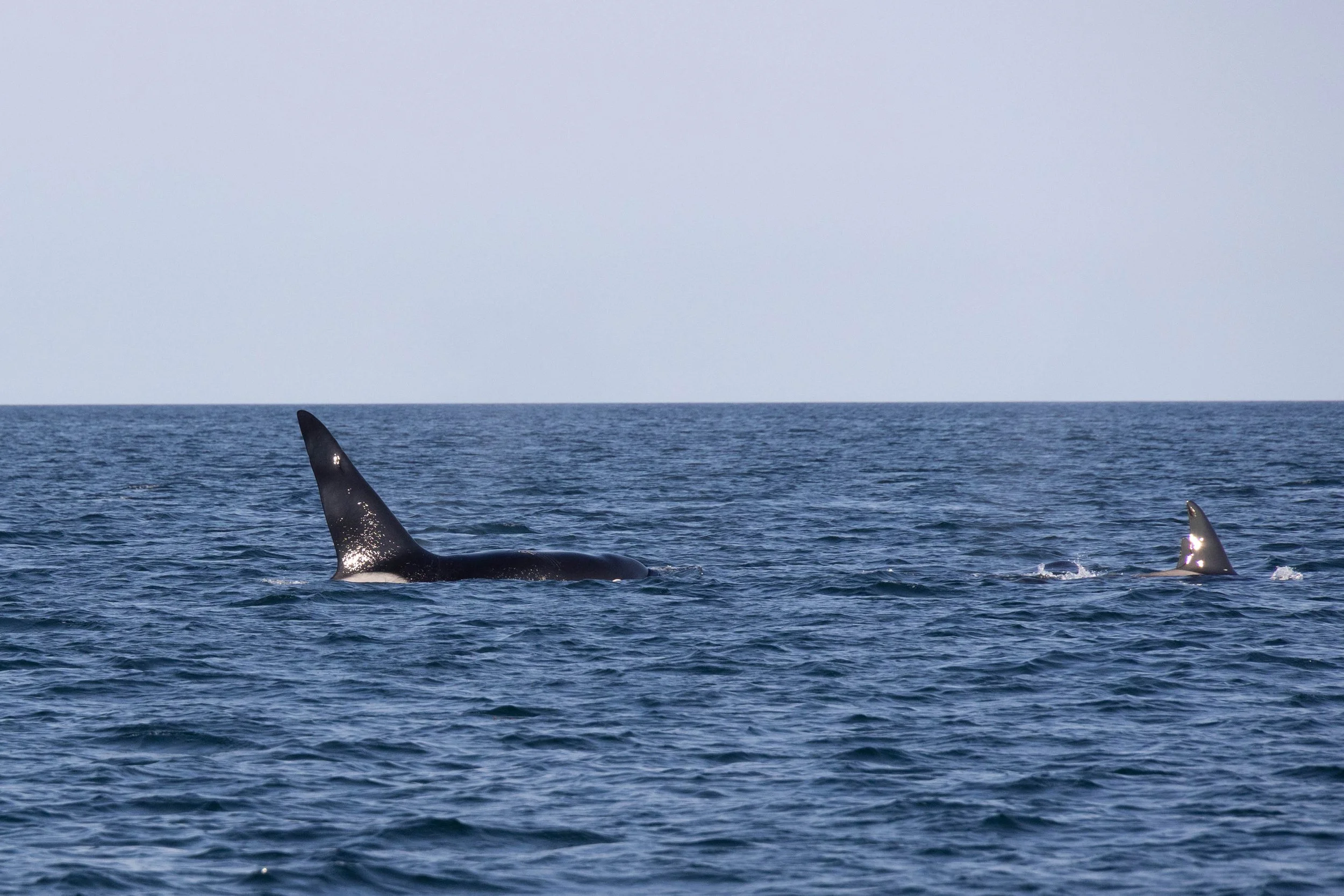 T019 Nootka surfacing just behind T059A1. Photo by Cheyenne Brewster.