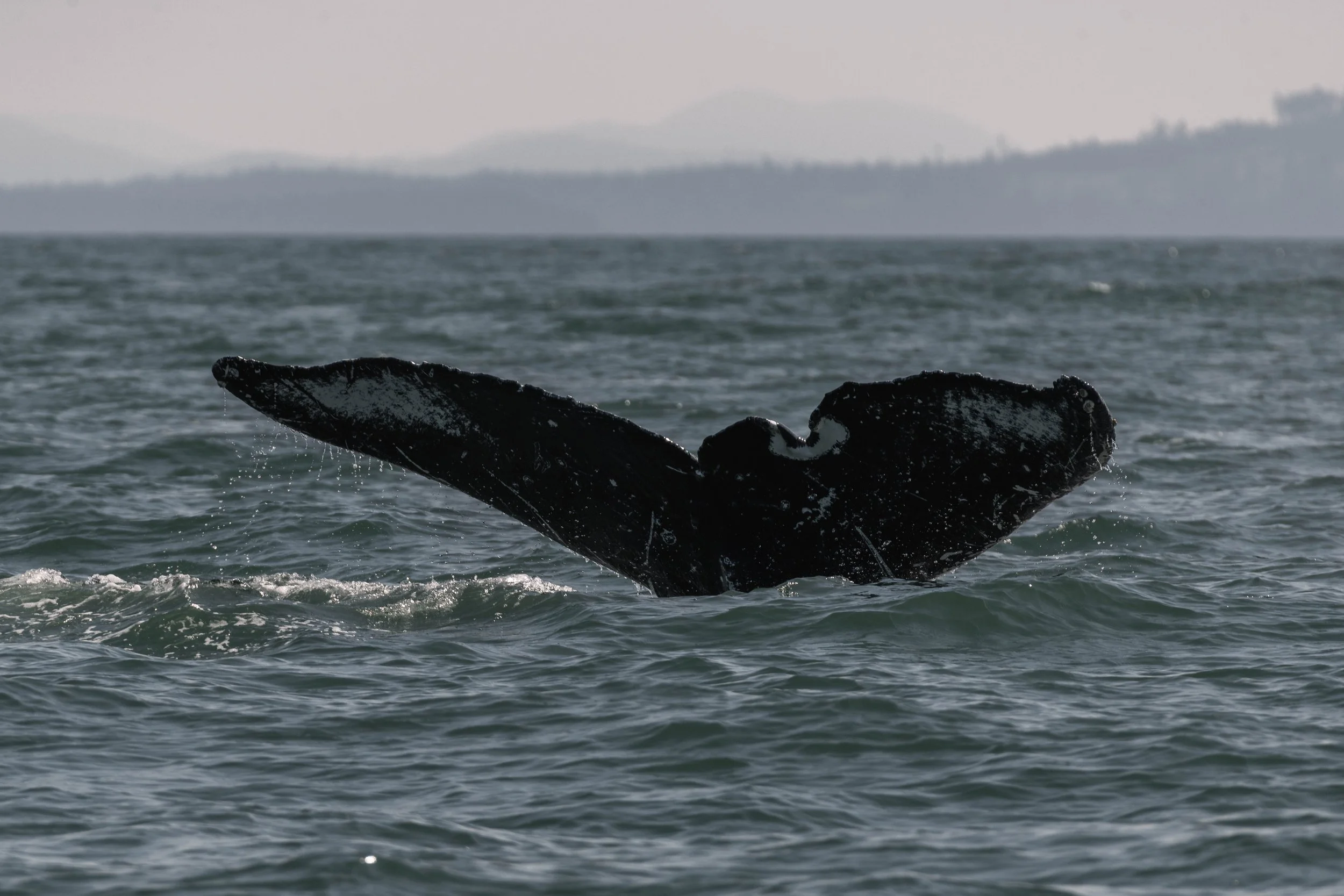 From there, we pushed out into the Strait of Georgia, where our search quickly paid off: our first humpback of the day! It was none other than Beak (BCX1606), a familiar visitor to the area. Beak was busy feeding, diving with powerful fluke lifts as he searched the depths for krill and small schooling fish. Humpbacks aren’t just incredible to watch; they also play an essential role in the ecosystem. As they feed and dive, they act as “nitrogen pumps,” moving nutrients through the water column that fuel plankton growth and help sustain the food web.