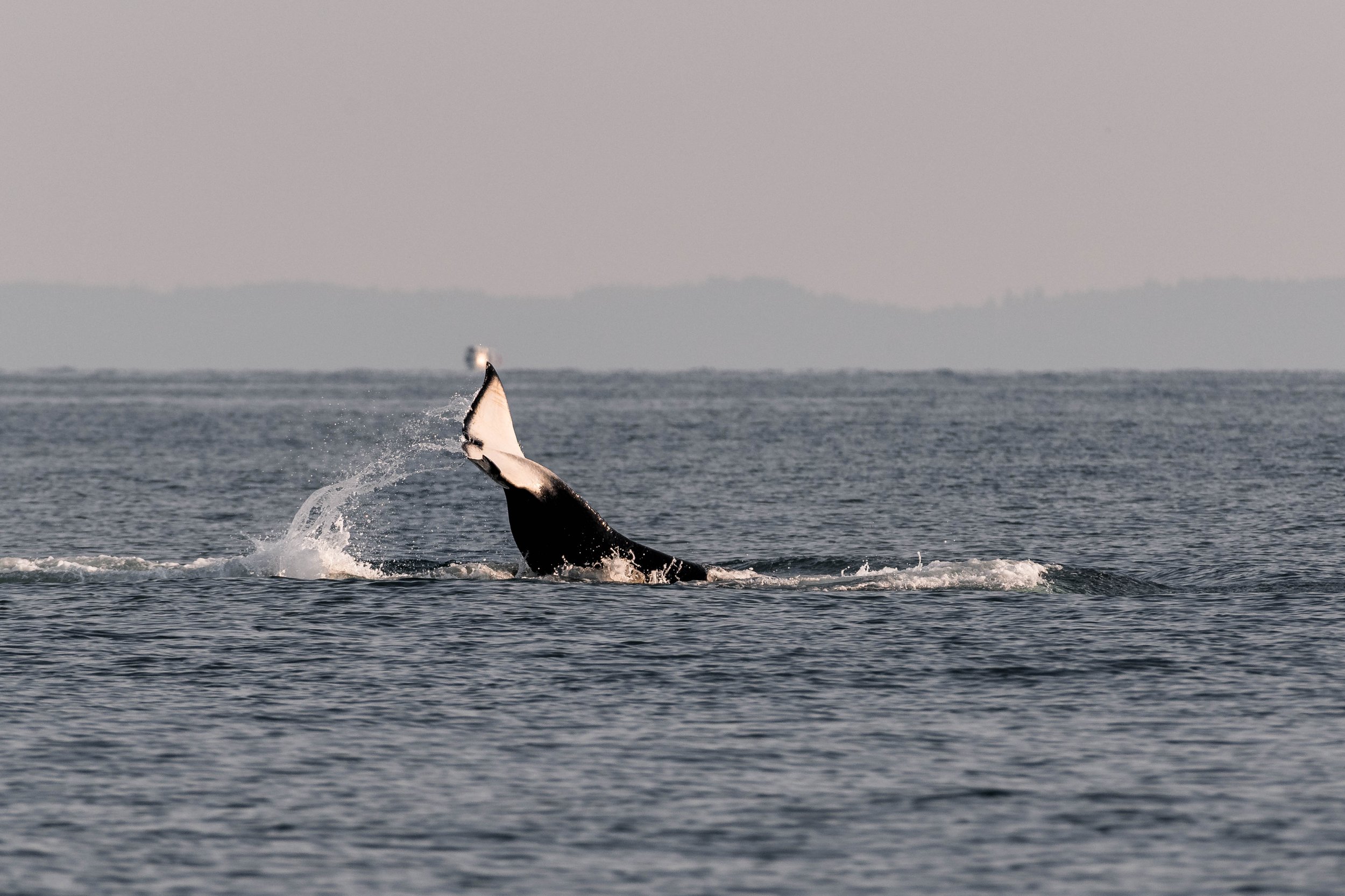 The evening’s adventures were not over quite yet, though, as after leaving the White Islets behind, a little humpback was spotted nearby! This individual was travelling along, and was fluking (bringing their tail up and out of the water) very shallowly as we observed them. Although we always wish for a nice high fluke from the humpbacks to make our lives easier, we were able to work with these more shallow flukes to get enough detail for an ID: this whale was Maite (KEY0049)! Maite is a younger whale, being born to a more northern whale, Nick, back in 2022. It was great to see Maite, since we only usually get these sightings as they pass through on their way north and back south.