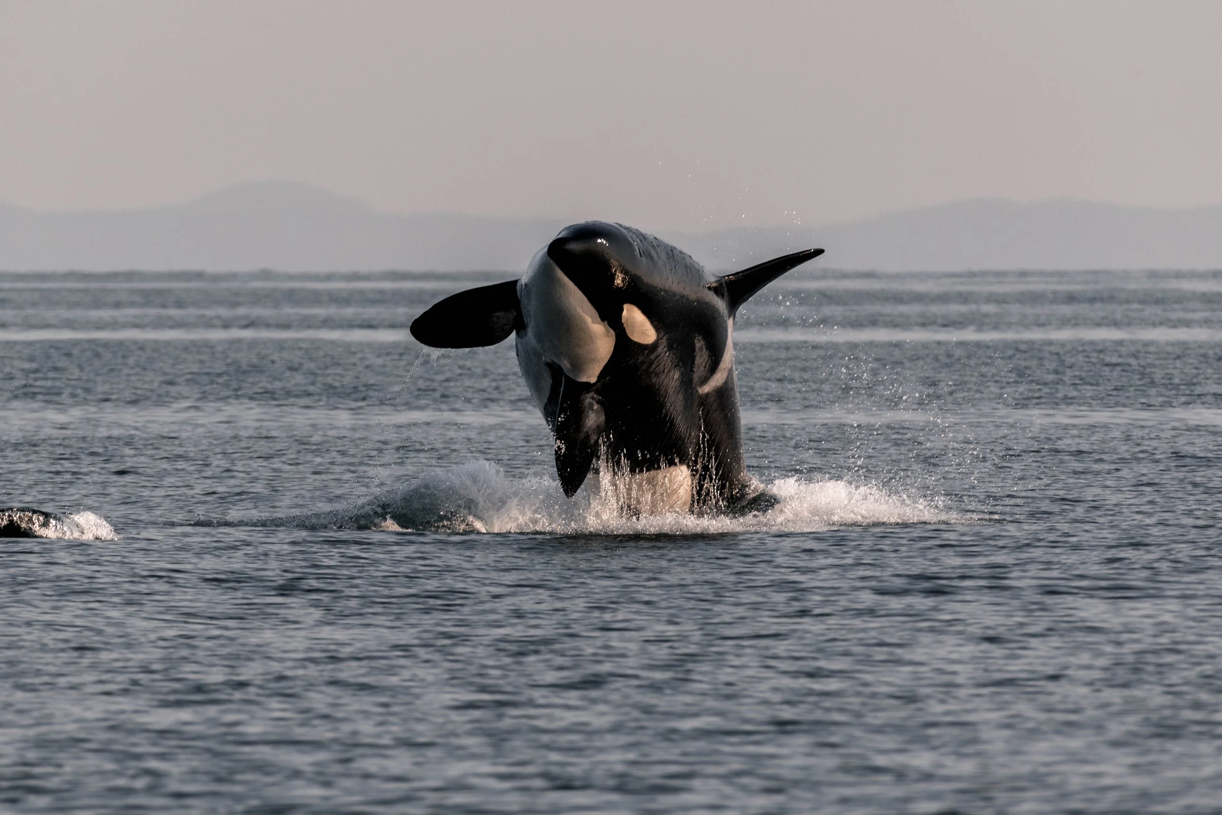 We headed out into the Strait this afternoon, eager to see what we could find in the sea today. After hearing about an orca sighting near Vancouver, we ventured across the Strait, our eyes peeled for the telltale signs of whales on the horizon. The seas were perfectly calm, resulting in a quick and easy crossing. We headed over to Bowen Island, situated in the mouth of Howe Sound. Off its shore, a pair of huge, towering dorsal fins was cutting through the waters, with several smaller fins popping up around them. Our onboard Naturalists eagerly began snapping photos to confirm the identities of our whales. Using a combination of dorsal fin, saddle patch, and eye patch photos, we confirmed that the T002Cs and T123s were present: