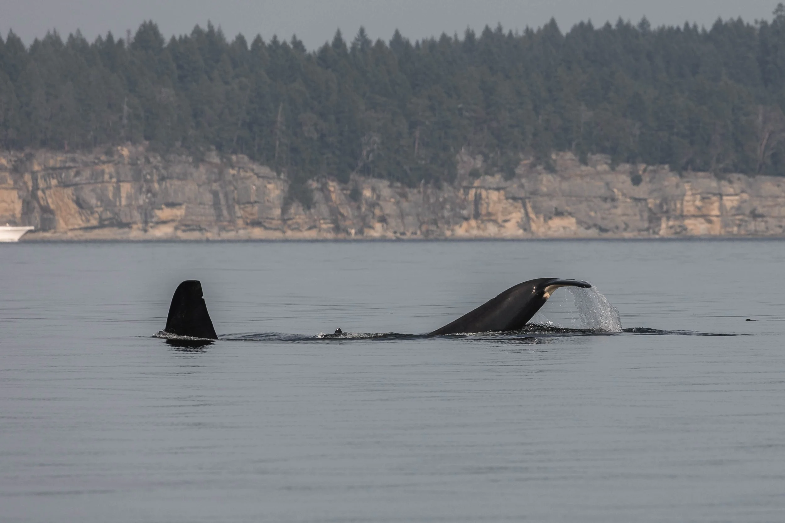 T019B Galiano and T019 Nootka surfacing together. Photo by Hayleigh Hilbert.