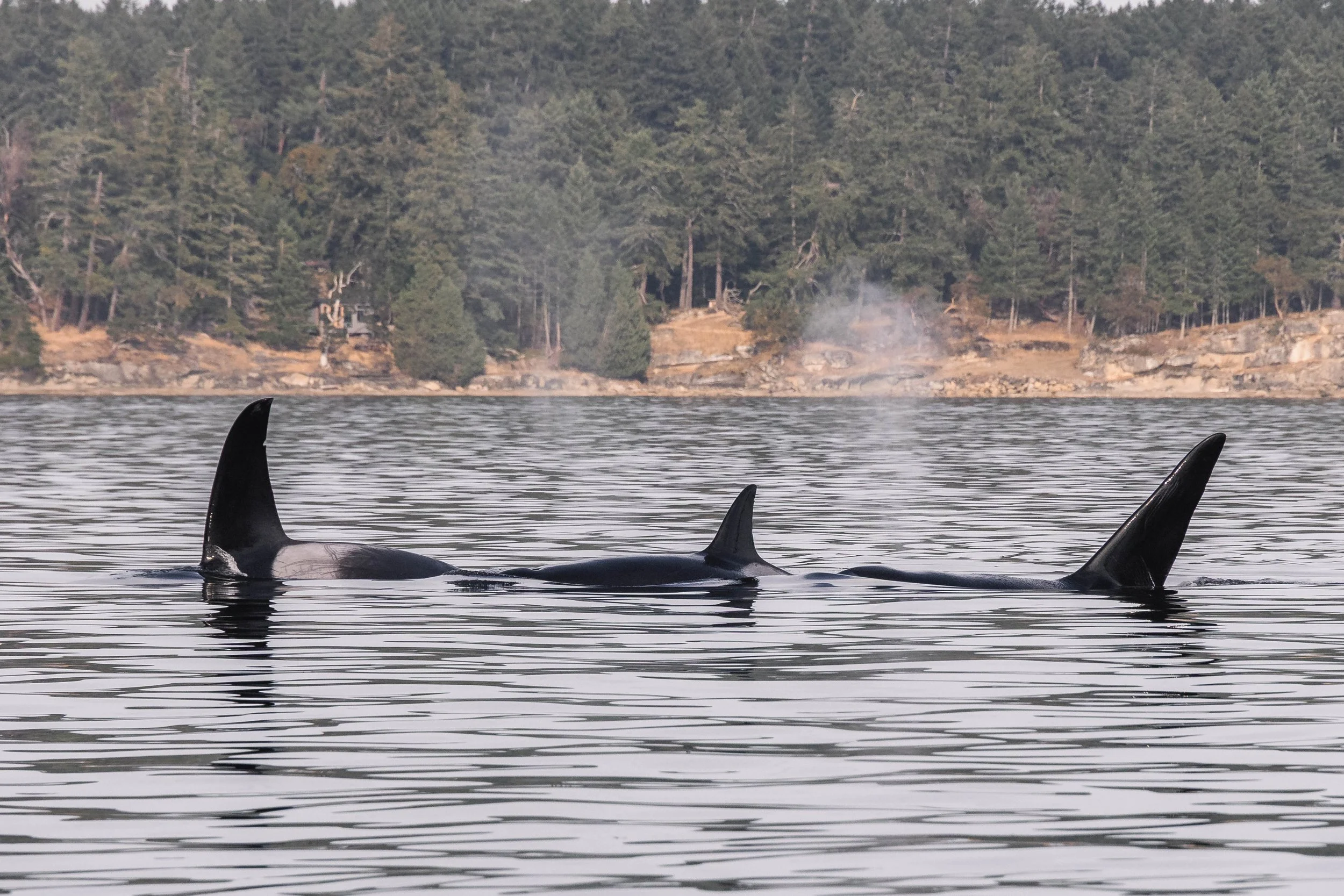 T019B Galiano, T019 Nootka, and T019C Spouter surfacing together. Photo by Vanessa Vereschahen.