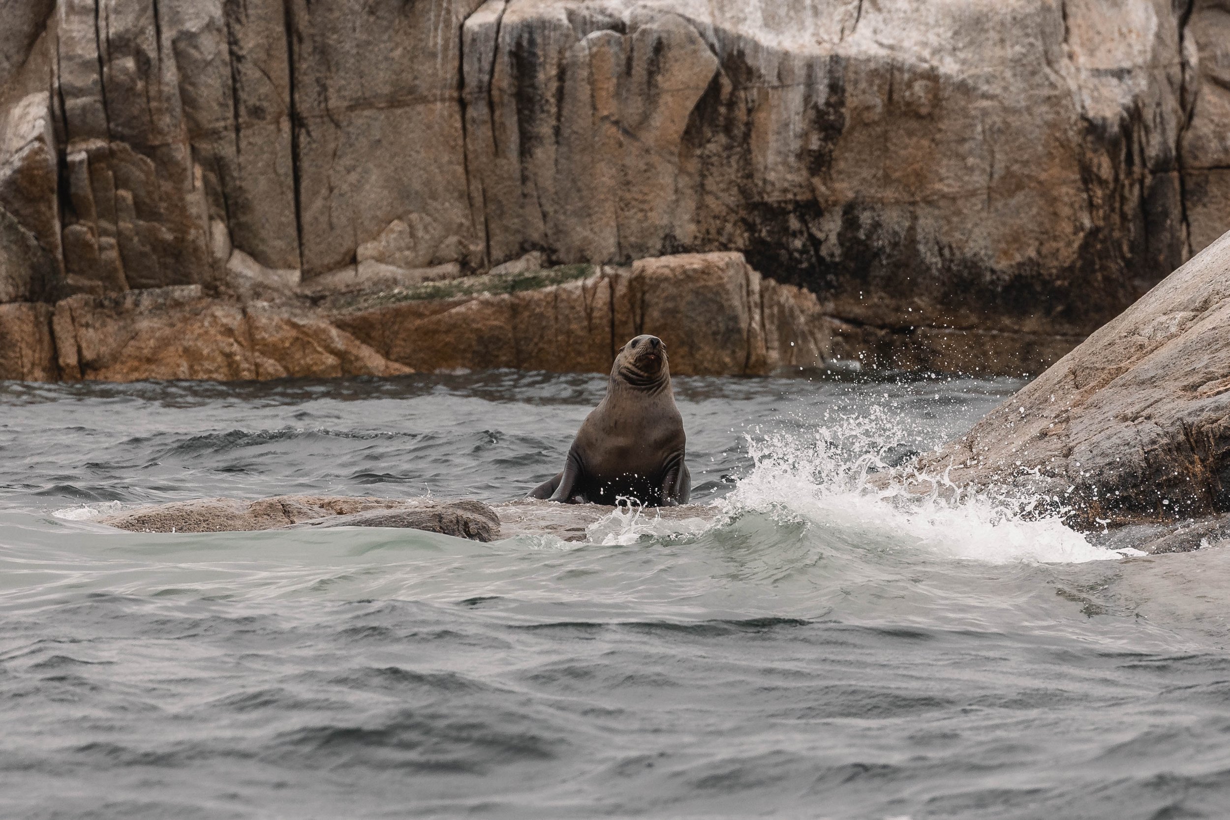 We had this in mind while watching these three travelling together, marvelling at their graceful ability to move through the waves before showing off their massive, 18-foot-wide tails, before dipping below the surface once more. After enjoying our time with these giants, we started to head towards another impressive area: the White Islets. This small, rocky island is located off the Sunshine Coast and is one of our favourite places to visit thanks to the huge diversity of life that spends its time there. Steller Sea Lions congregate in huge colonies, the large males fighting for the best position on the rocks, with the smaller Harbour Seals spending their time lounging on the rocks nearby. There are also shore birds dotting the shoreline, resting or taking time to pick through the surf for food.