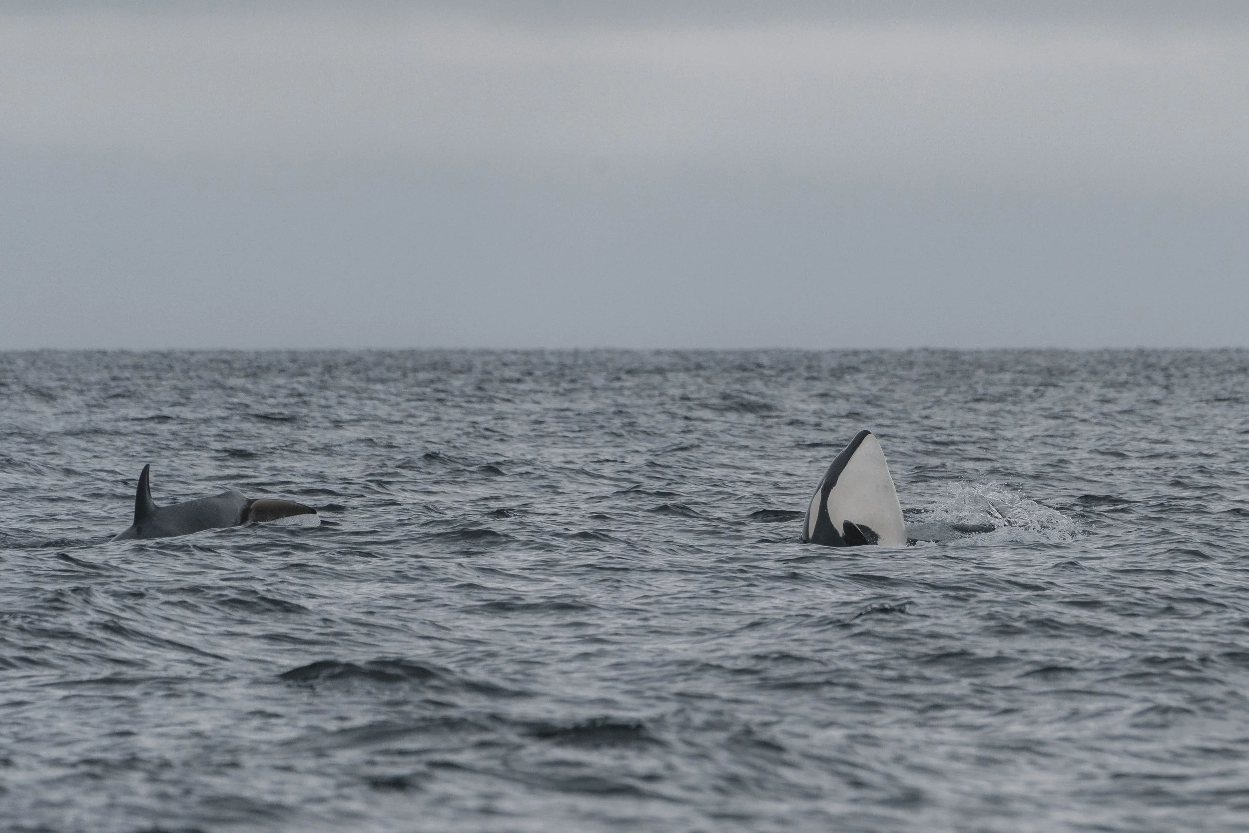 A T-party is a name generally given to any group of Transient orca that are travelling together with more than one pod present. A lot of the time this comes along with a lot of socalizing behaviours like surface activity, vocalizations, and potentially breeding opportunities happening. Orca are incrediably social animals and value their time spent with members outside of their matriarchal pods. Seeing other individuals is usually cause to celebrate! We don’t always see the celebration continue for long after the group meets up, since it’s a lot of energy to be spending, but the expendadure didn’t seem to matter to these whale today, as we saw nearly every surface behaviour you could imagine as we watched. Time and time again we saw the younger whales jumping from the water, all individuals slapping their tails on the surface, swimming forward, backwards, and sideways. It was a lot of fun to watch!