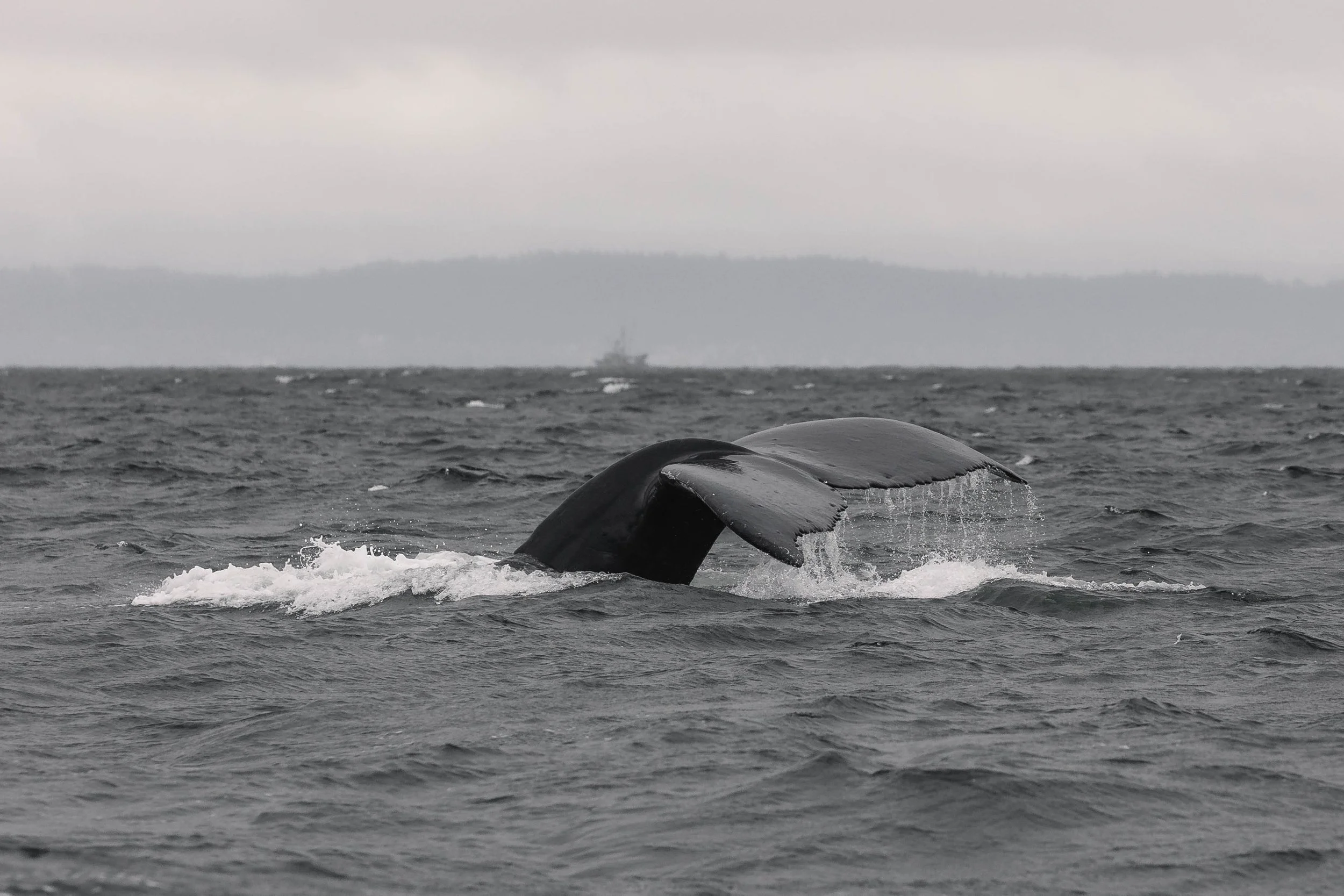 The Strait of Georgia is usually a great spot to find our whales, thanks to the nutrient-rich waters that fill this waterway. Things like islands, banks, and shelves change the flow of the ocean, mixing the water column and contributing to the extraordinary biodiversity we see here. Nutrient influx from the many rivers that drain into the Strait is also important for maintaining this high biodiversity, and interestingly, the animals that inhabit the region are also helping in this process. In particular, the first species that we spotted today, the humpback whales, play a very important part in this delicate balance.