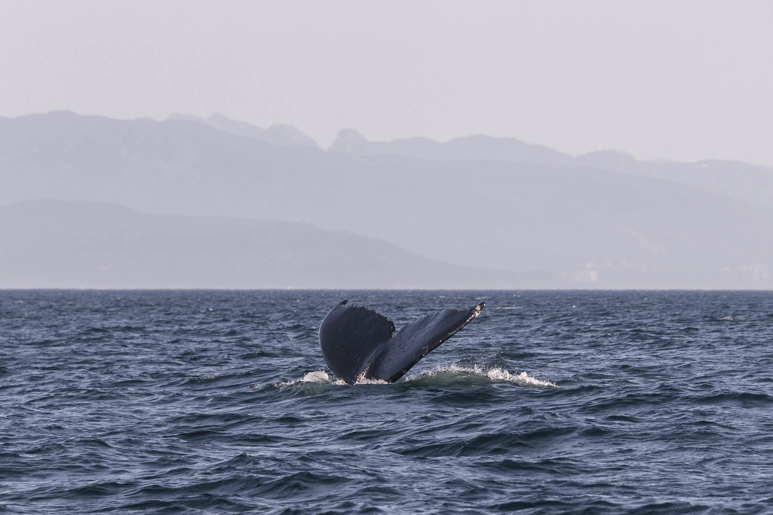 After spending time with this remarkable family, we continued our search across the Strait. Just on the far side of Snake Island, another tall blow rose against the horizon. This time, it belonged to a humpback whale, none other than Twinning (BCX1207). For many years, humpback whales were considered relatively solitary travellers, especially compared to the highly social orca. Recent observations are challenging this assumption. Increasingly, researchers have documented temporary associations between humpbacks, pairings or small groups that can last days, weeks, or even months. The purpose of these associations is still being studied, but they may be related to cooperative feeding or simply social companionship. Today, however, Twinning was travelling alone, surfacing steadily as they made their way through the Strait.