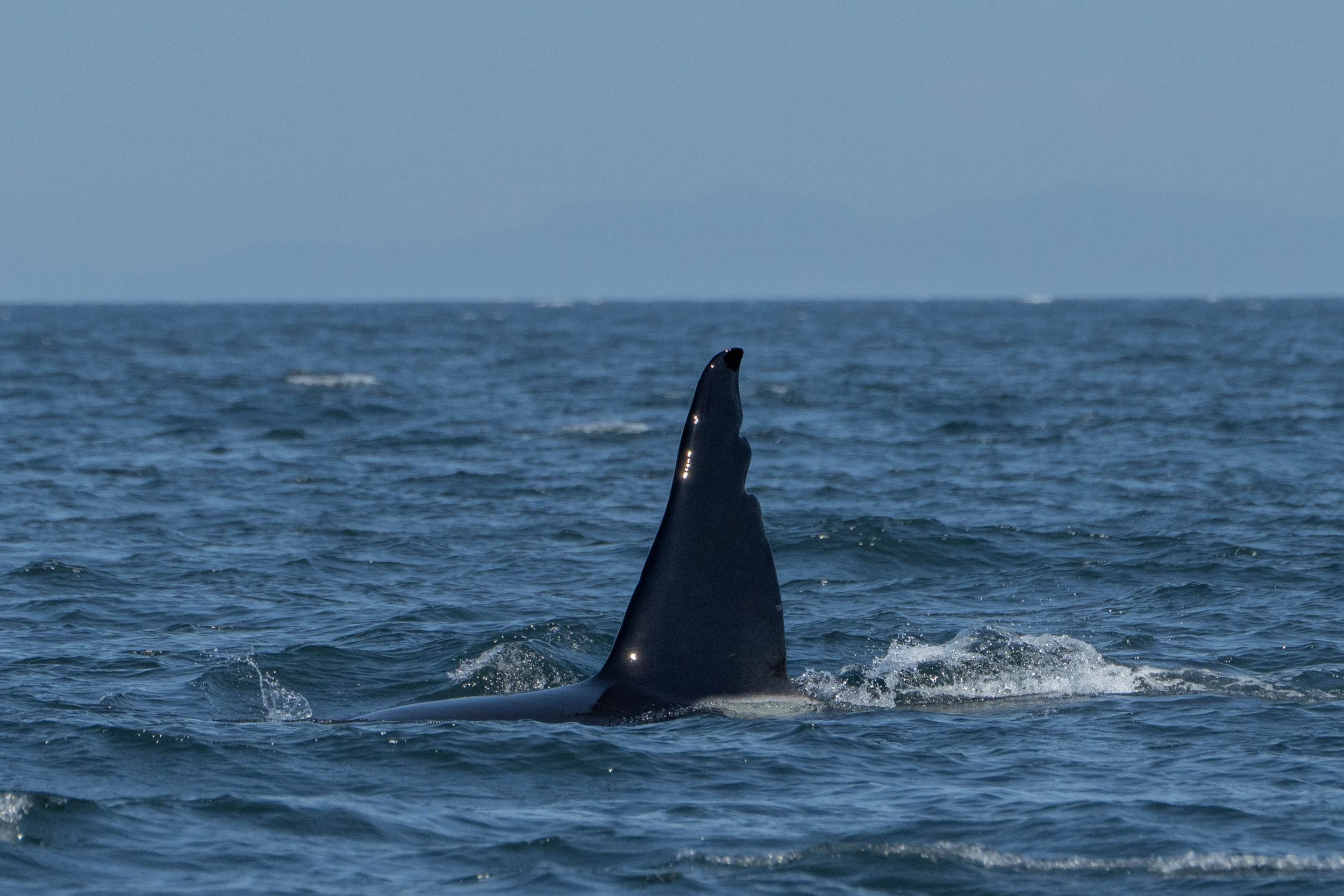 While Chainsaw is an iconic fin here in the Salish Sea, sometimes his mom, Whidbey II, gets forgotten in the fuss, which is a shame. Whidbey II is a fantastic whale, with three known children (T063 Chainsaw, T065A Artemis, and T065B Chunk). The two ladies have dispersed from the rest of the group, but momma’s boy Chainsaw has stuck by Whidbey’s side, which is very common for adult males. Today was no different, and we found these two travelling through the waves together just south of Porlier Pass. Today’s small but mighty pod includes:
