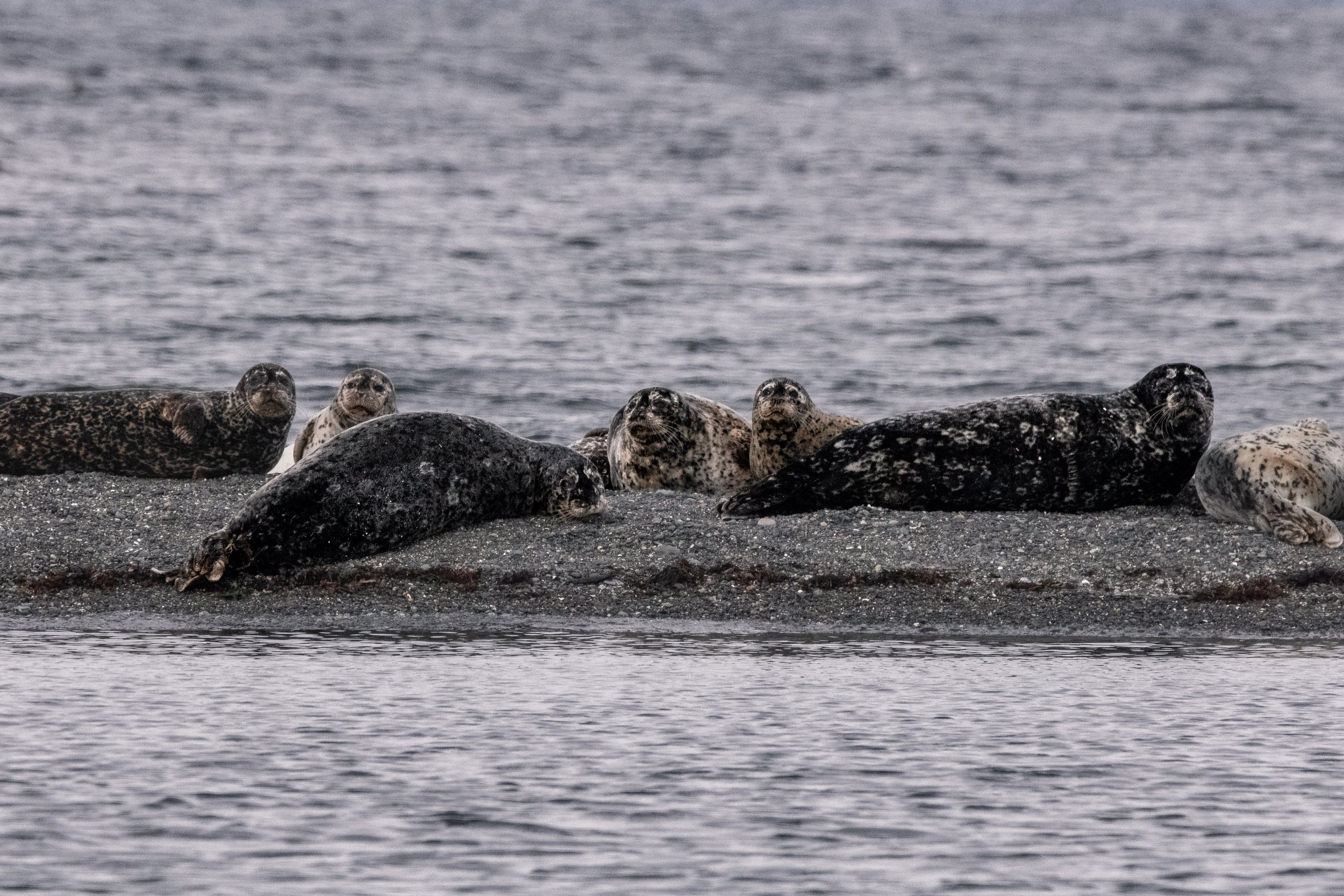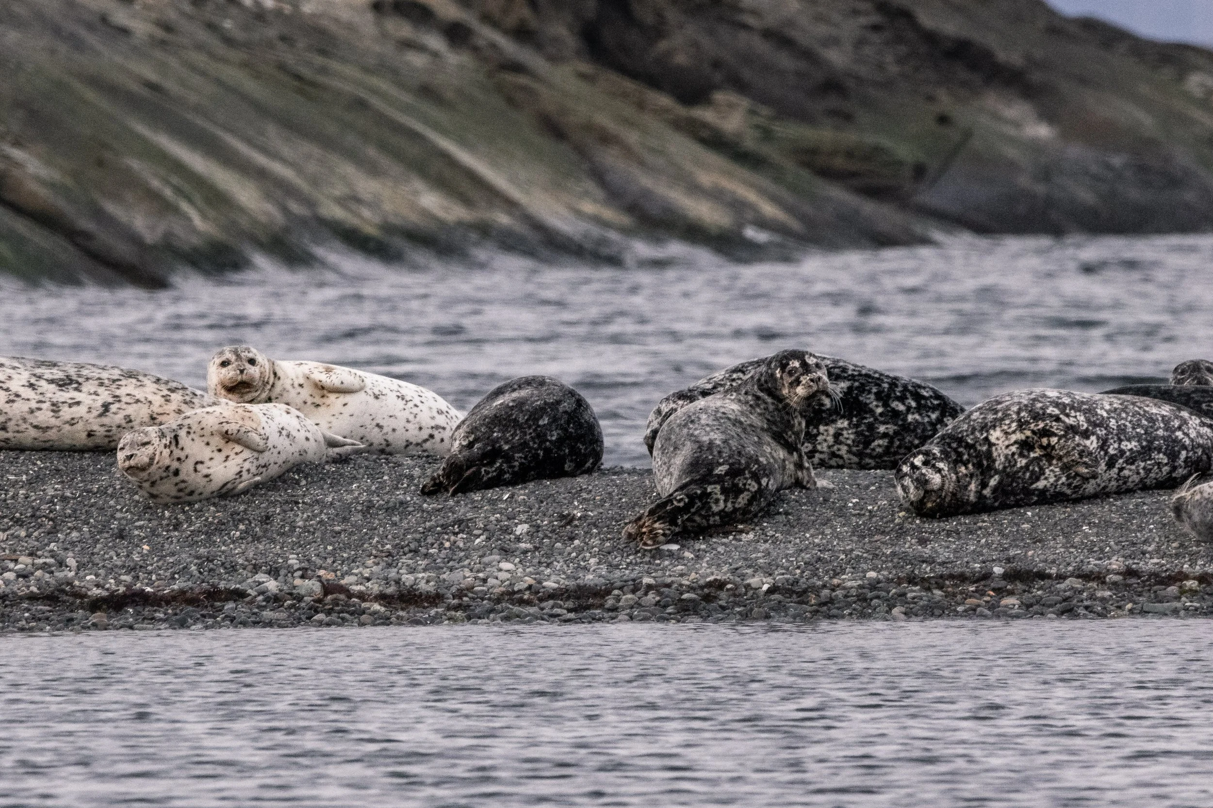 Leaving the orca, we made our way to Snake Island, a small sandstone islet that serves as a favourite haul-out site for harbour seals. With the tide running low, plenty of rocky ledges were exposed, providing ideal resting spots. Many seals were fast asleep in the sunshine, though the occasional curious face popped up to watch us drift by.