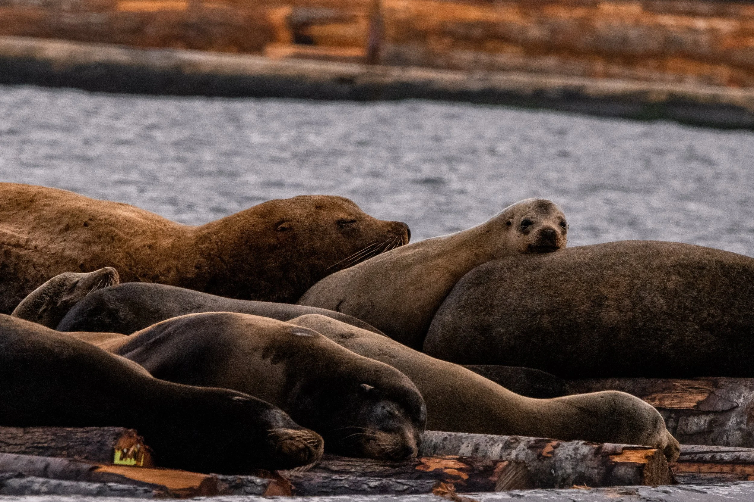 After a brief visit with the seals, we carried on to the log booms outside Harmac pulp mill, a popular resting place for another pinniped species: sea lions. Like the seals, they were stretched out and snoozing, some even using one another as pillows. It’s hard to imagine these typically loud and boisterous animals cuddling up, but huddling together during colder weather helps conserve valuable body heat.