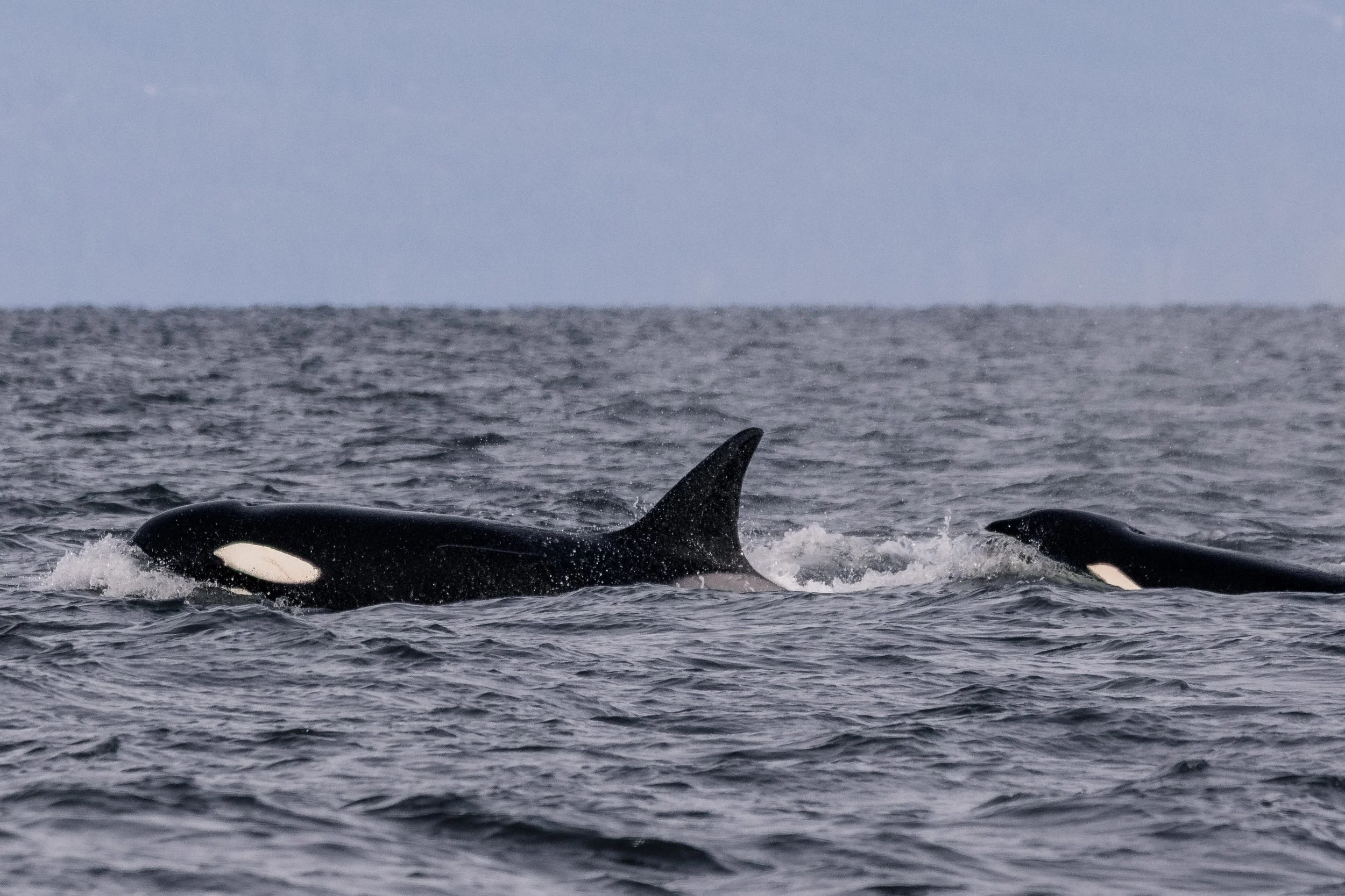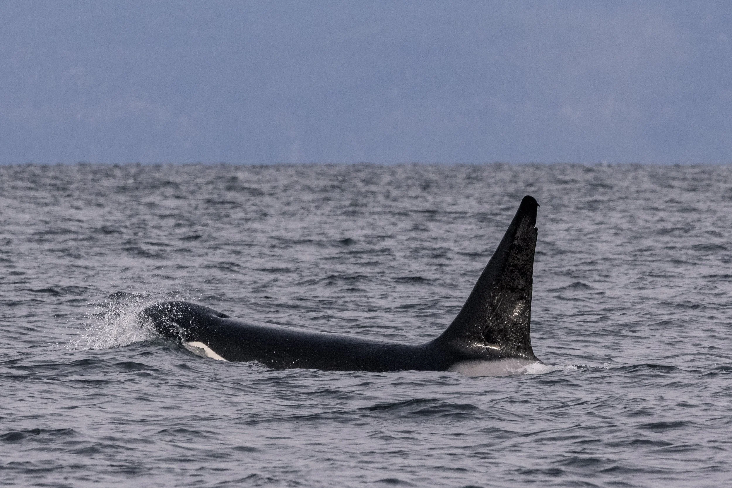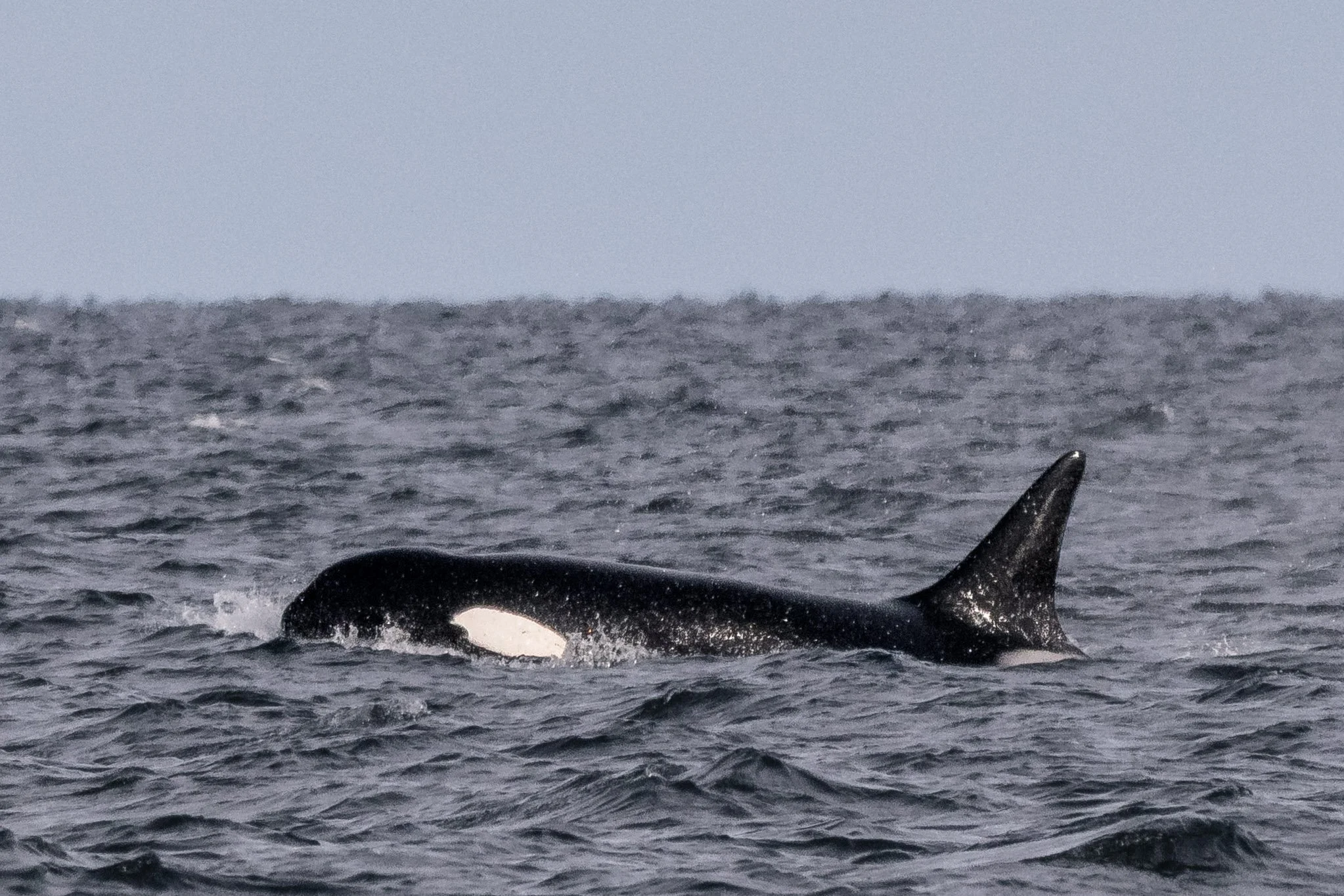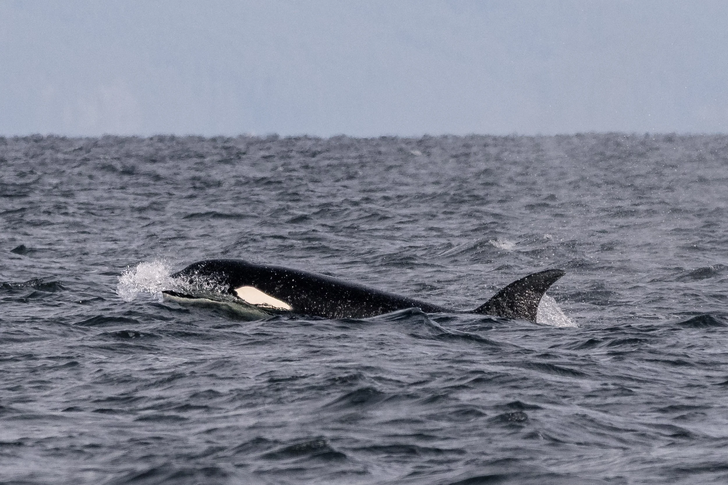 One whale, however, didn’t quite fit into this family puzzle: T087 Harbeson. Harbeson is impressive in his own right and is believed by many researchers to be one of the oldest living wild male orcas - potentially even the oldest! Estimated to be around 64 years old - more than double the average lifespan for a male - he is frequently seen travelling alone, as many older males do after their mothers pass away. In recent years, though, he has occasionally been spotted associating with younger males, including one of his most frequent companions, T124C Cooper. Cooper wasn’t with the group initially - but the day was still young!