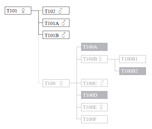 Family lineage of the T100s and T101s. Dotted lines are suspected familial connections. Chart: 2019 Photo-identification Catalogue, Population Status, and Distribution of Bigg’s Killer Whales known from Coastal Waters of British Columbia, Canada by Towers et al.
