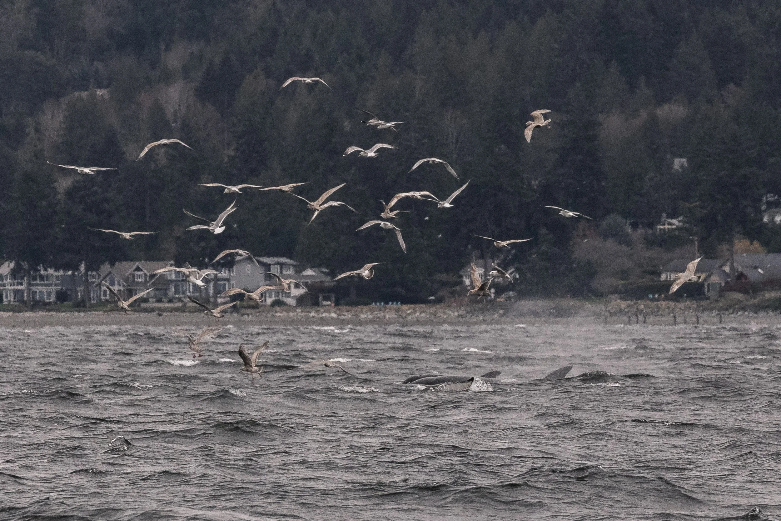 As we moved through the area, it quickly became clear just how abundant this food source was. Beneath the surface, dense schools of herring, known as bait balls, form a defensive formation against predators. Above and around them, the scene was alive with motion. Gulls wheeled overhead, diving repeatedly into the water, while a bald eagle circled and swooped with precision. At the surface, harbour seals and sea lions surged through the schools, each taking advantage of the seasonal feast.