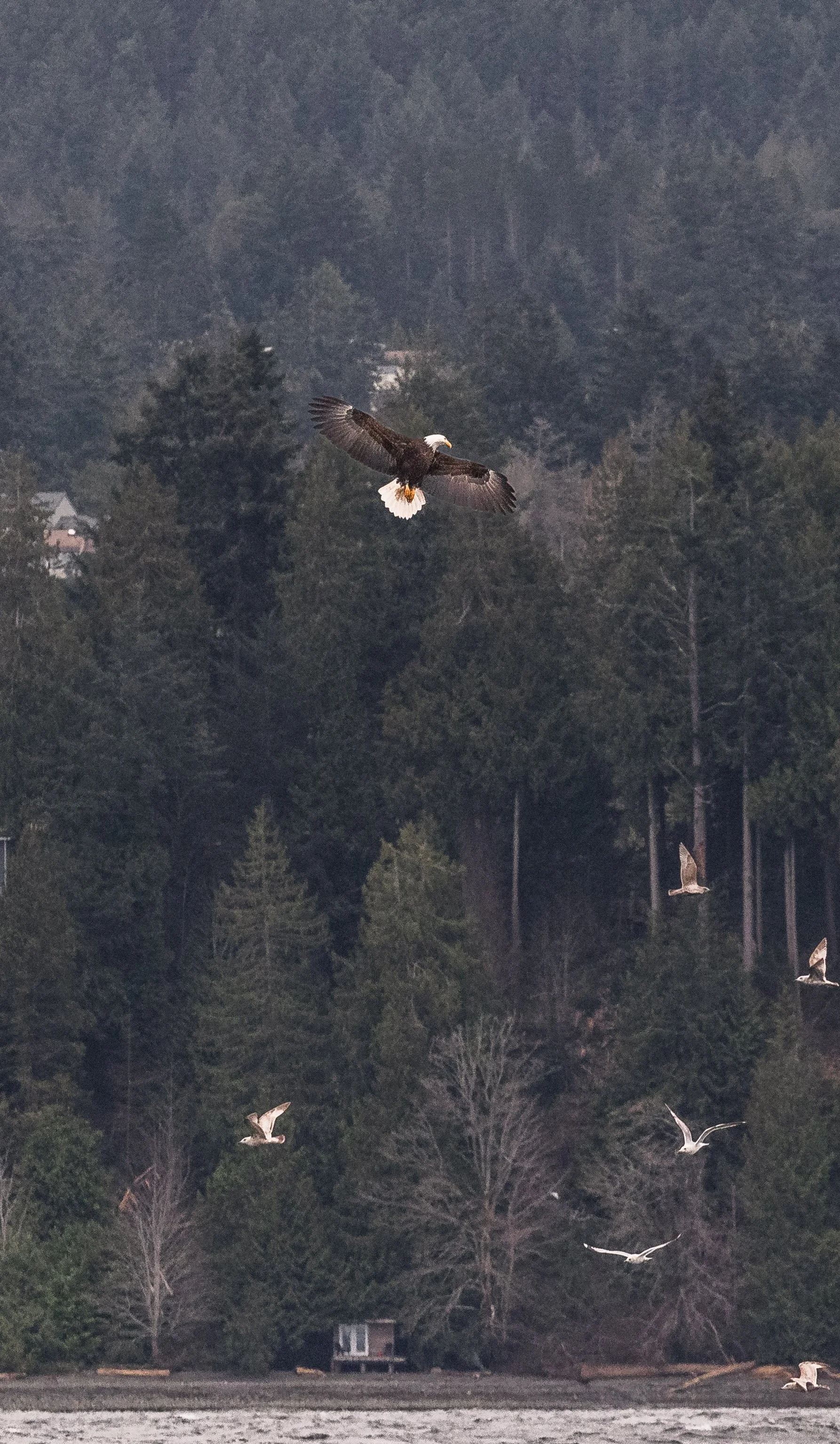 A mix of gulls, eagles, California and Steller Sea Lions.