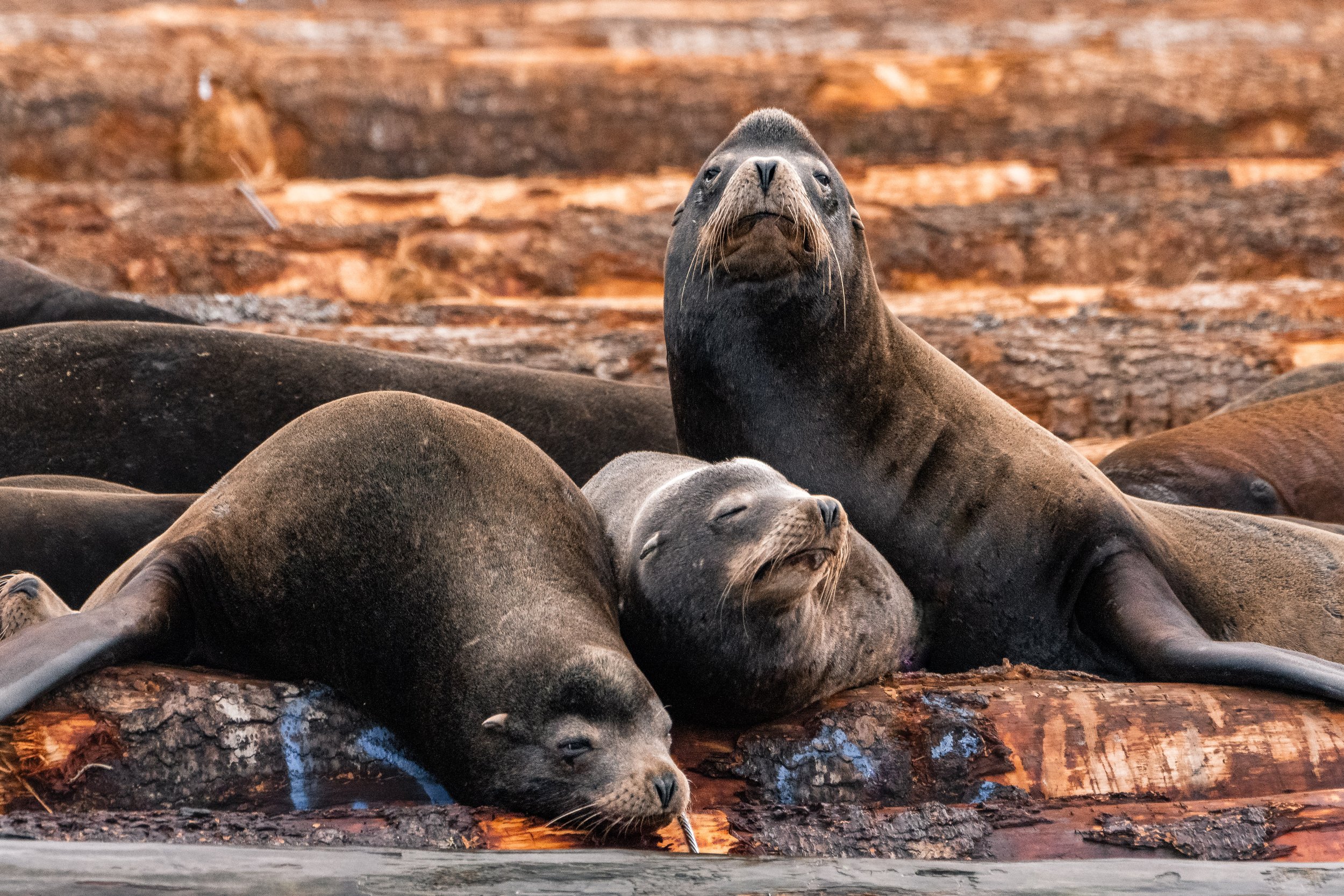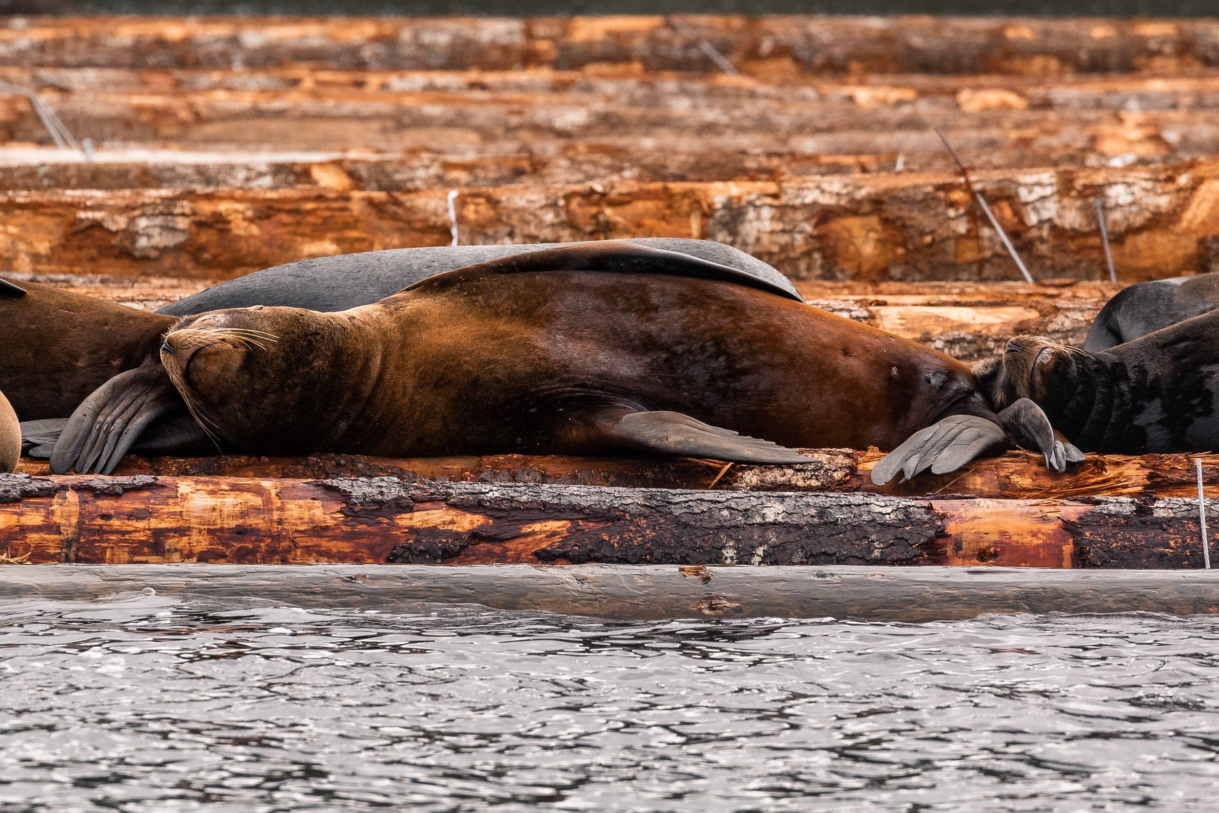 Leaving the humpback behind, we continued toward our final stop. Near the edge of the Northumberland Channel, log booms floated in quiet clusters, and atop them lay a different kind of gathering. California Sea Lions, with a few larger Steller Sea Lions among them, were draped across the logs in dense groups, their bodies pressed together in layered piles.