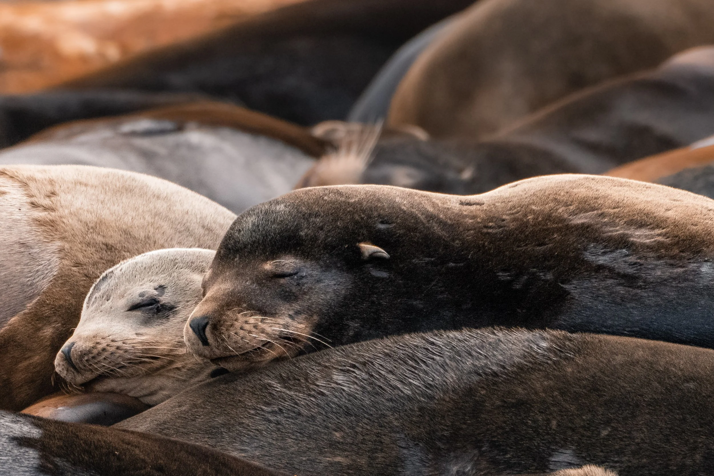 Up close and personal - the sea lions often will huddle up to nap and conserve heat. Photo by Val Watson.