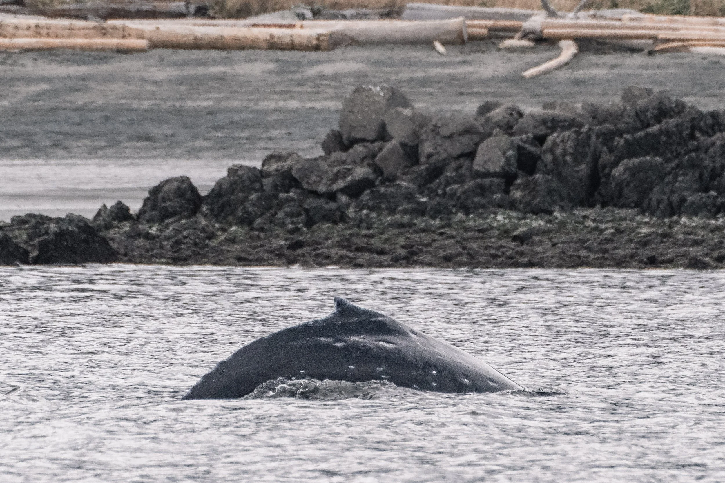The whale’s behaviour suggested feeding, likely taking advantage of herring associated with the seasonal spawn. While they remained elusive with their fluke, subtle markings along the dorsal fin and scarring on their body allowed for confirmation of their identity. Judging by their size, we suspect they may be around two years old, meaning this humpback might be navigating its first season alone.