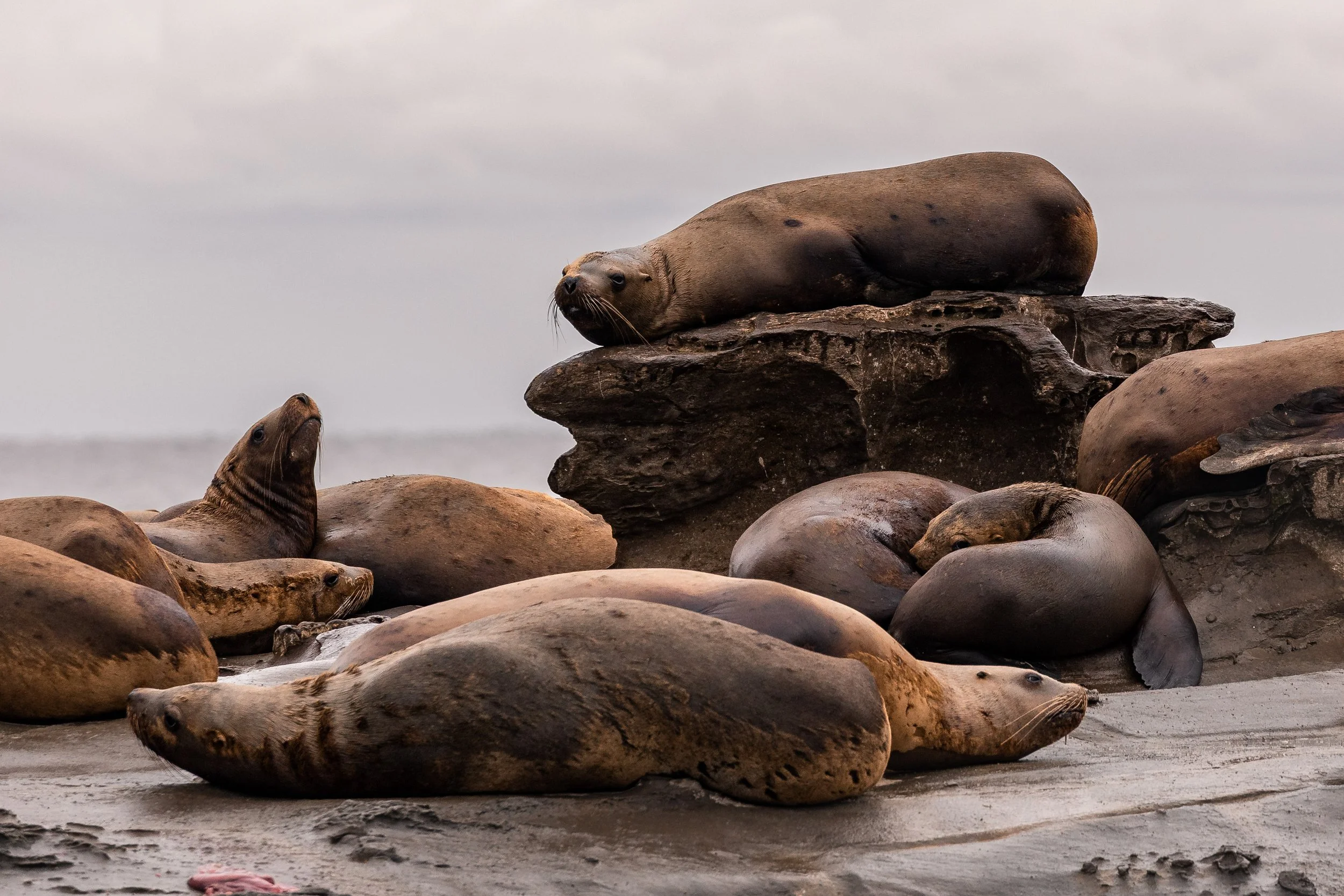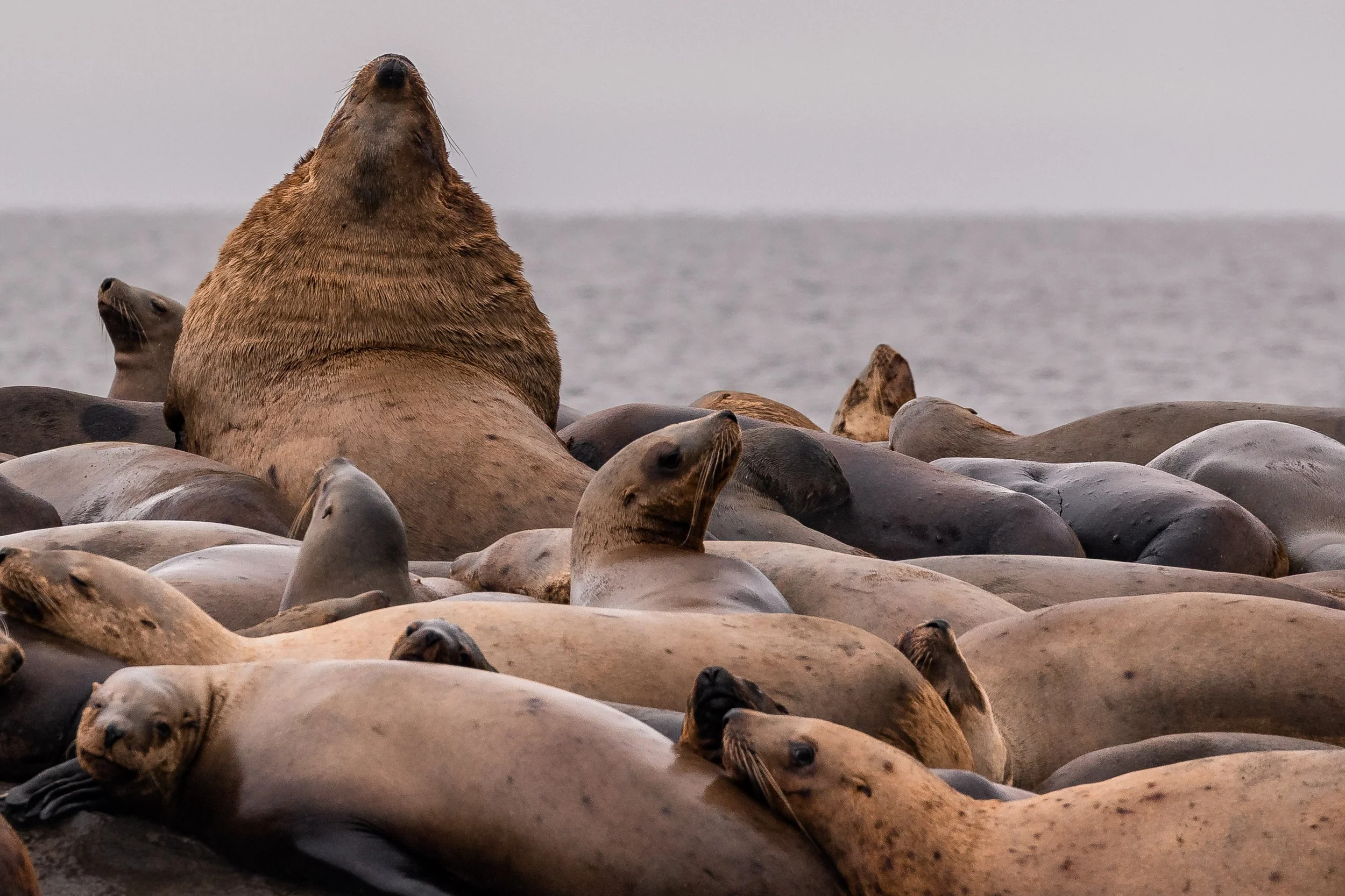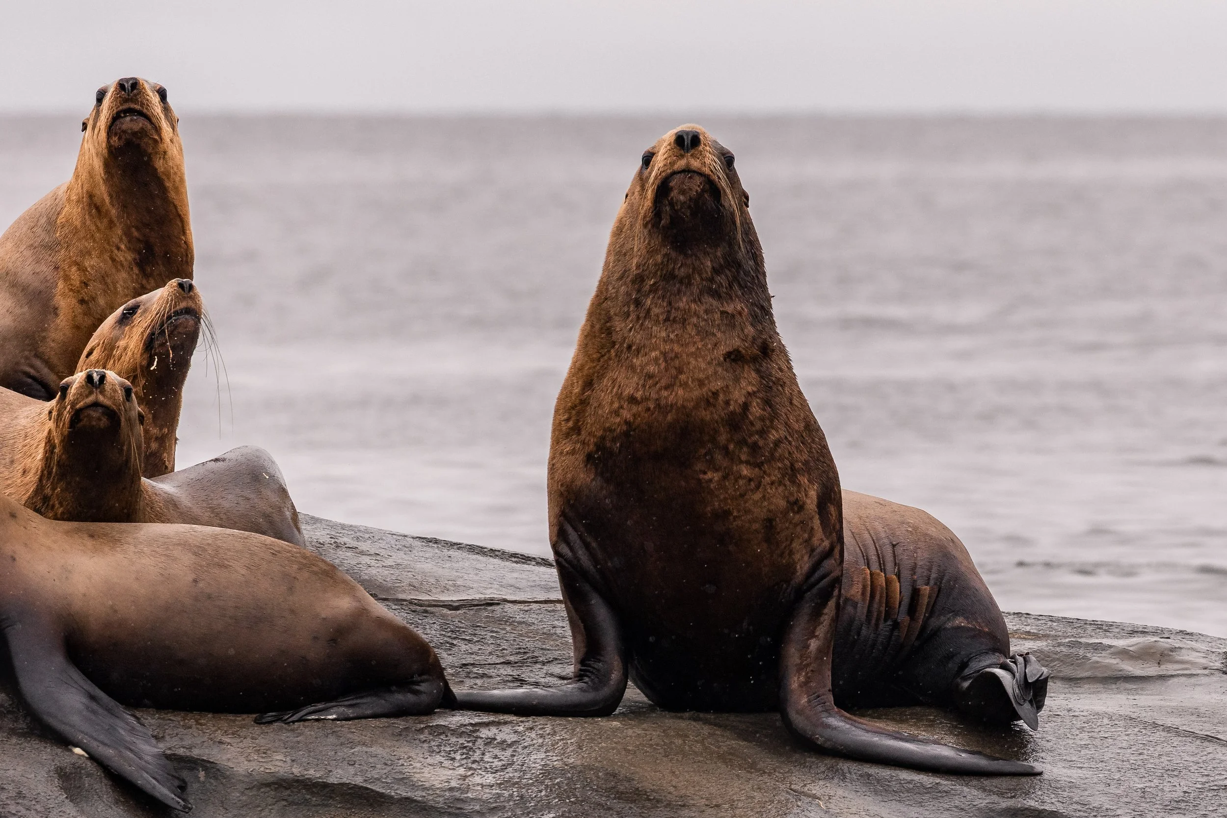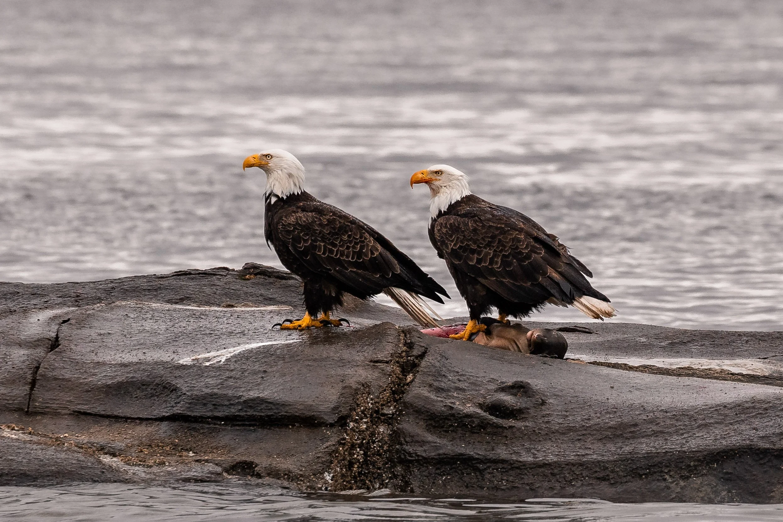 Here, at a place affectionately known as Stinky Rocks, a different kind of gathering awaited. Steller Sea Lions sprawled across the rocks, their large bodies piled together as they grumbled, growled, and shifted in place. The air carried their presence long before we arrived - both audibly and aromatically. Nearby, a pair of Bald Eagles lingered, keeping watch and occasionally moving in to scavenge. It was a scene full of sound and texture, a reminder that even in stillness, there is constant activity along these shores. NOTE: Due to the nature of the trip’s Bald Eagle photos, we have included them at the end of the blog (gore warning).