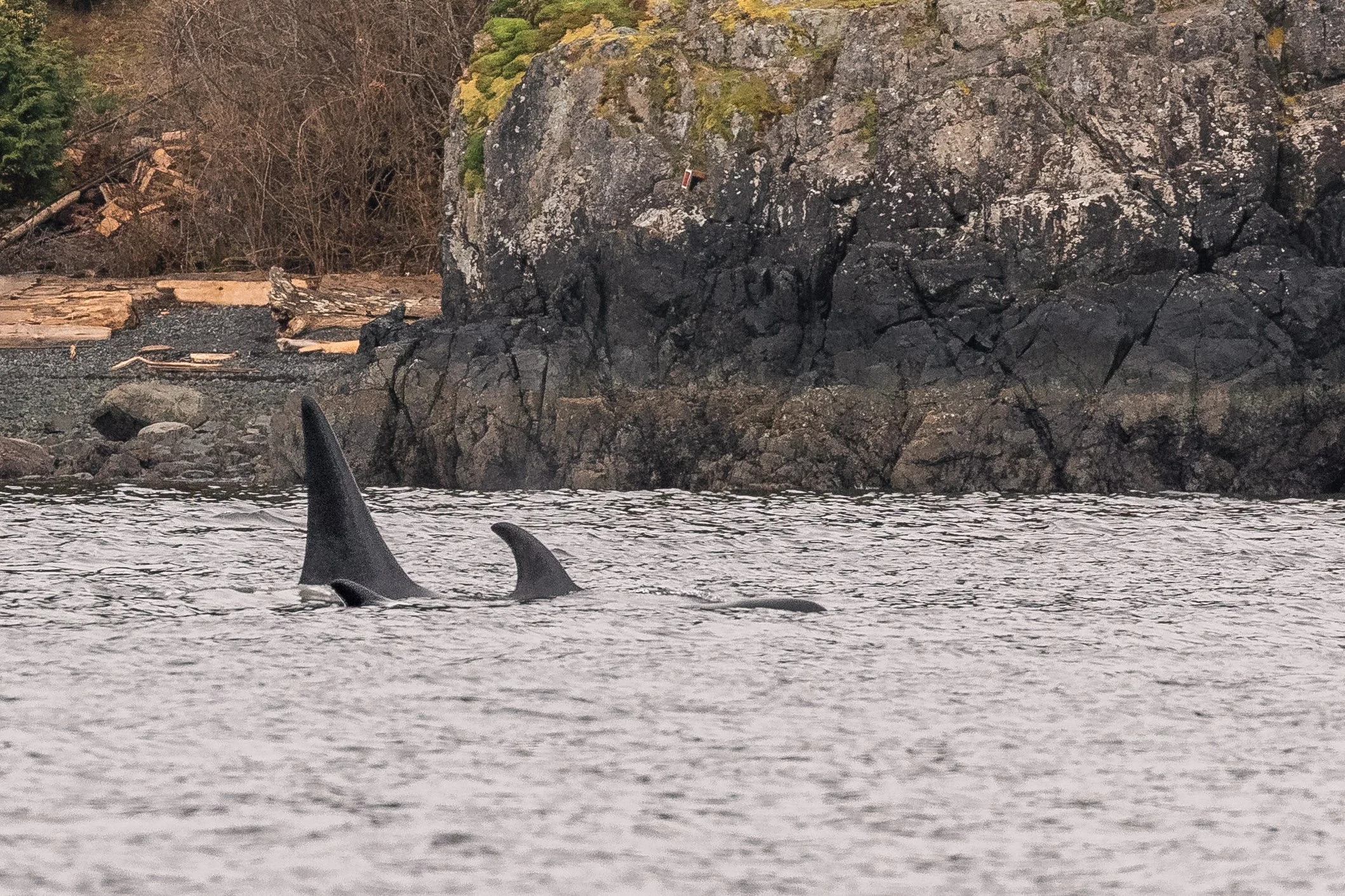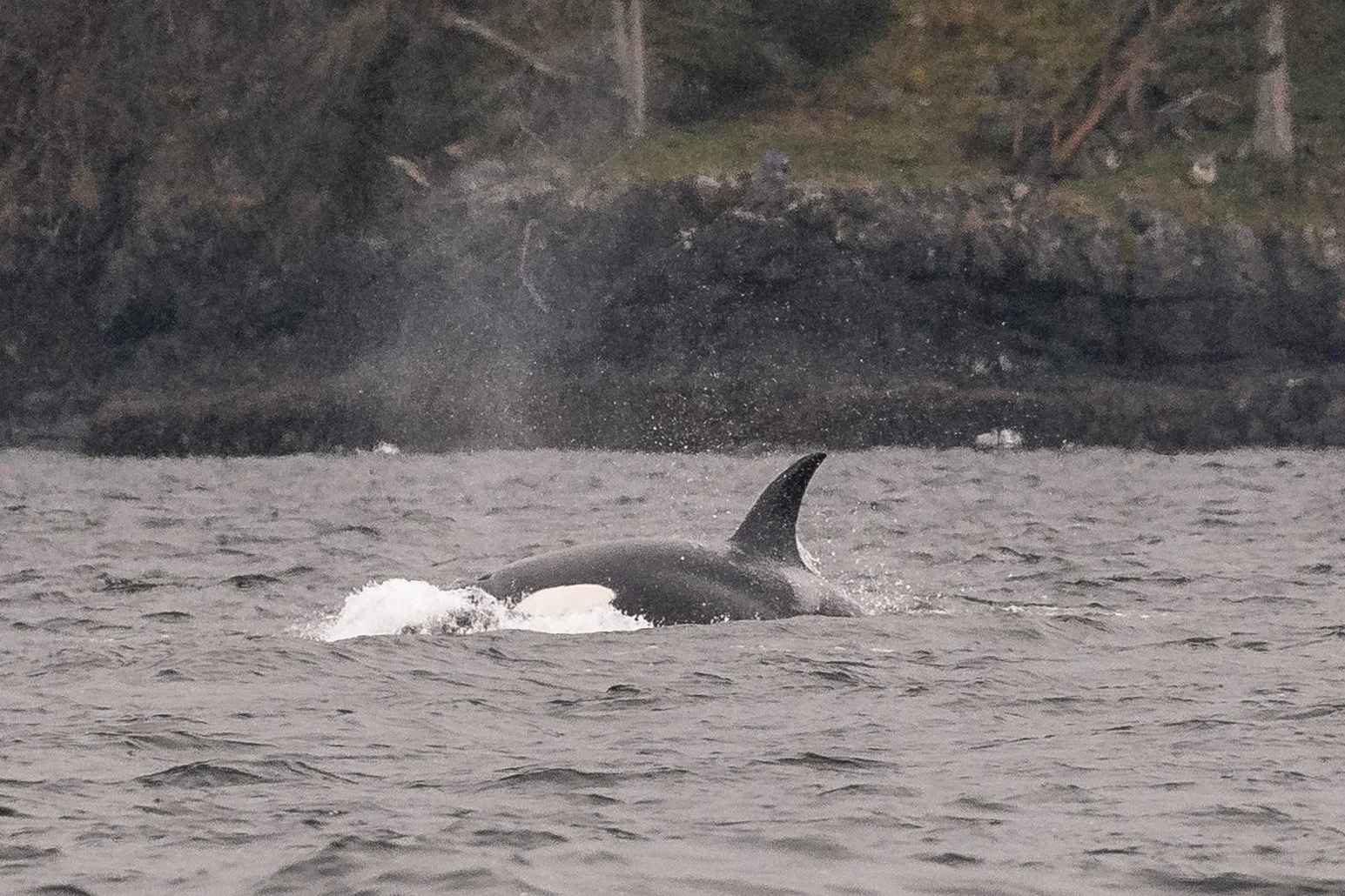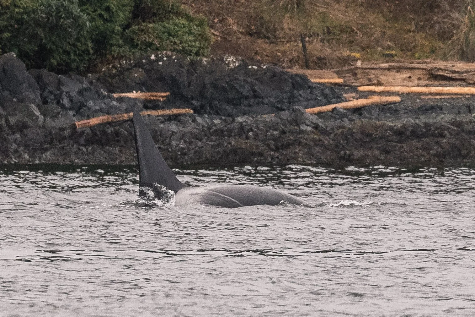 With early shore reports placing orca near Neck Point, it did not take long to find them. Just twenty minutes after departing Nanaimo, the ocean ahead came alive. A tall dorsal fin cut cleanly through the surface, surrounded by several smaller fins moving with urgency. The group was travelling quickly, their direction and behaviour focused. It soon became clear why.