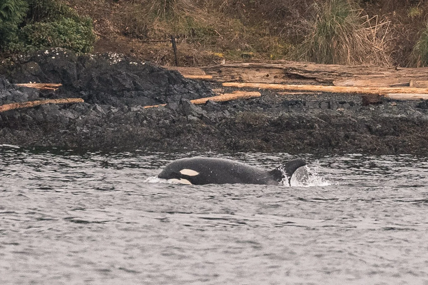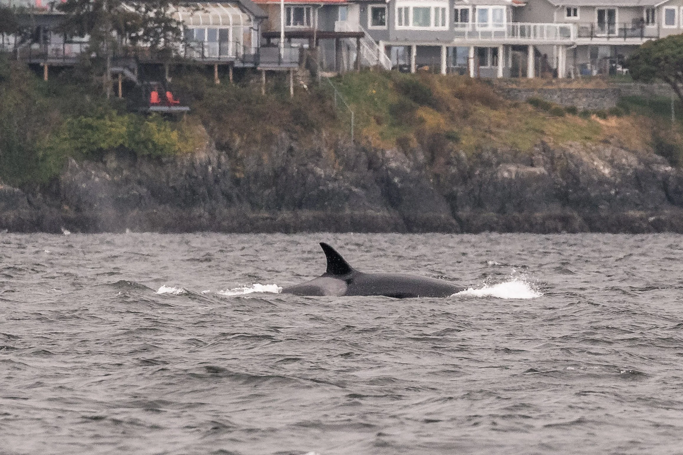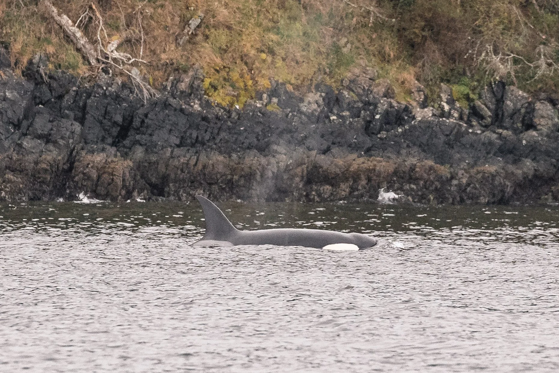 With early shore reports placing orca near Neck Point, it did not take long to find them. Just twenty minutes after departing Nanaimo, the ocean ahead came alive. A tall dorsal fin cut cleanly through the surface, surrounded by several smaller fins moving with urgency. The group was travelling quickly, their direction and behaviour focused. It soon became clear why.