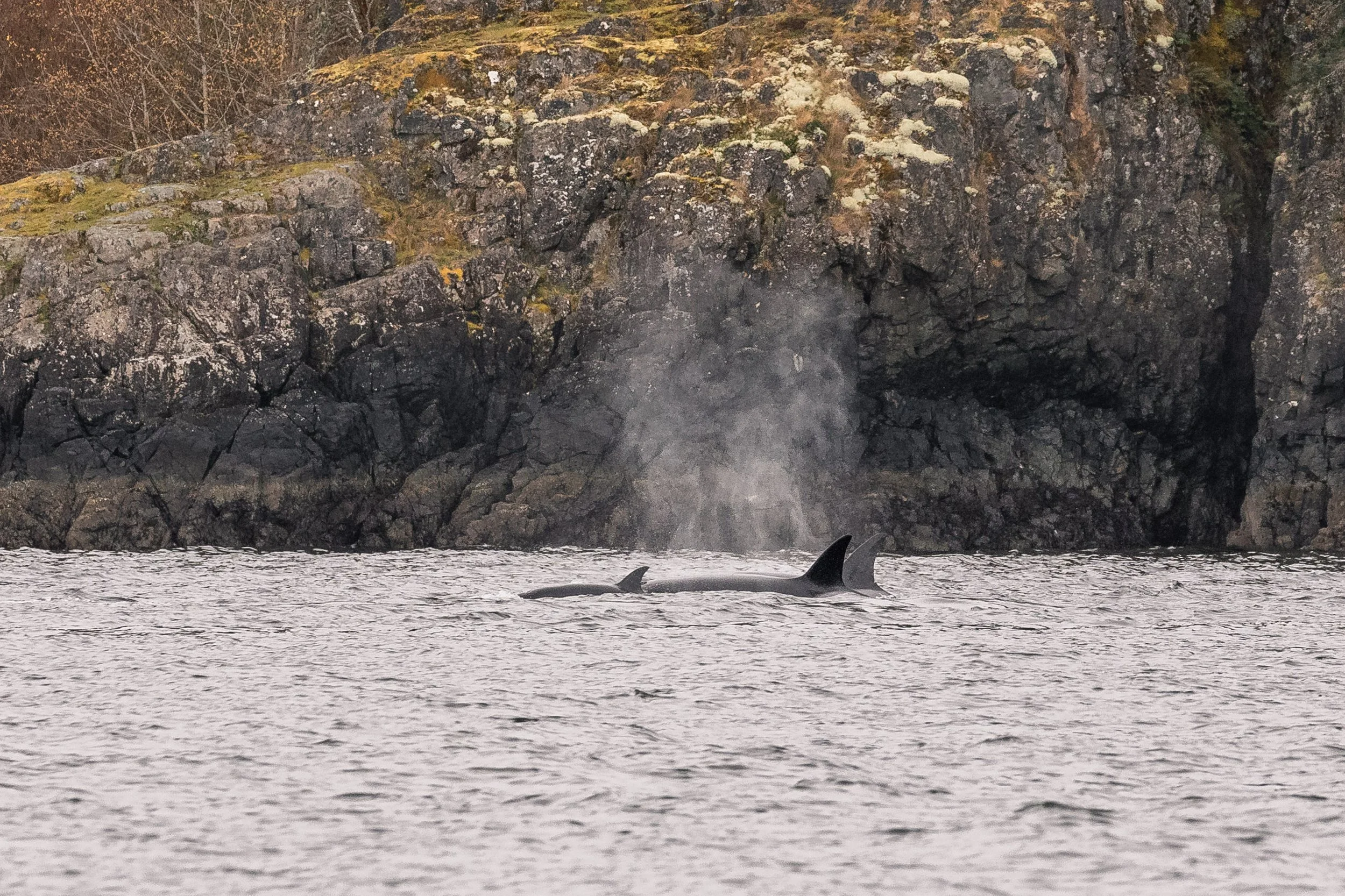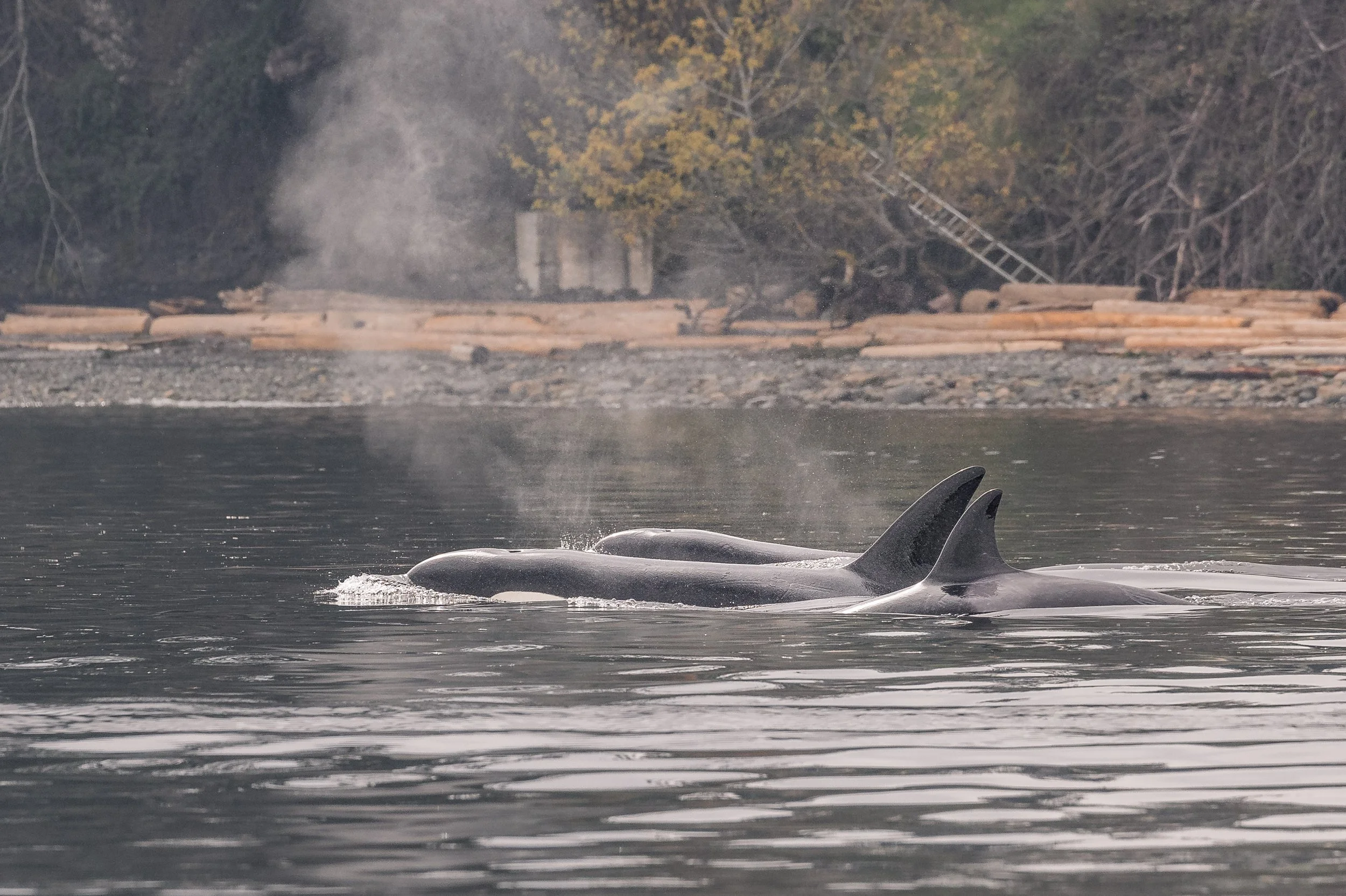 Continuing onward, we entered Gabriola Pass and made our way into the Southern Gulf Islands. The rhythm of the trip settled once again into scanning and watching, when suddenly, more blows appeared ahead near the mouth of Dodd Narrows. Another group of orca was travelling through the channel.