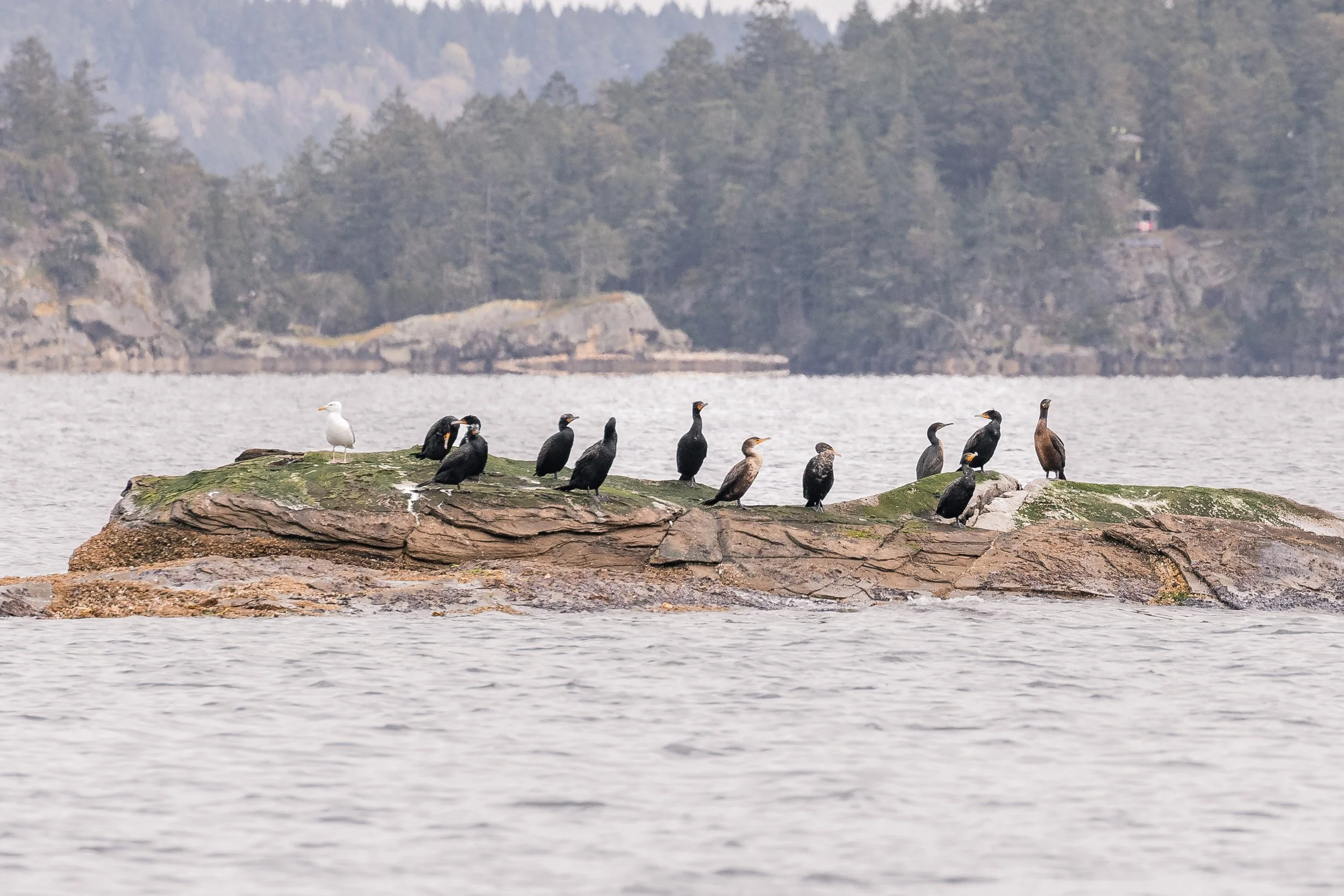 As the encounter came to a close and the whales moved on, Captain Rodrigo turned Cascadia southward. The pace shifted as we travelled along Gabriola Island’s coastline, the intensity of the hunt giving way to a quieter stretch of exploration. Passing through the Flat Top Islands, the landscape opened up until a low, rocky outcrop came into view at the edge of Valdez Island.