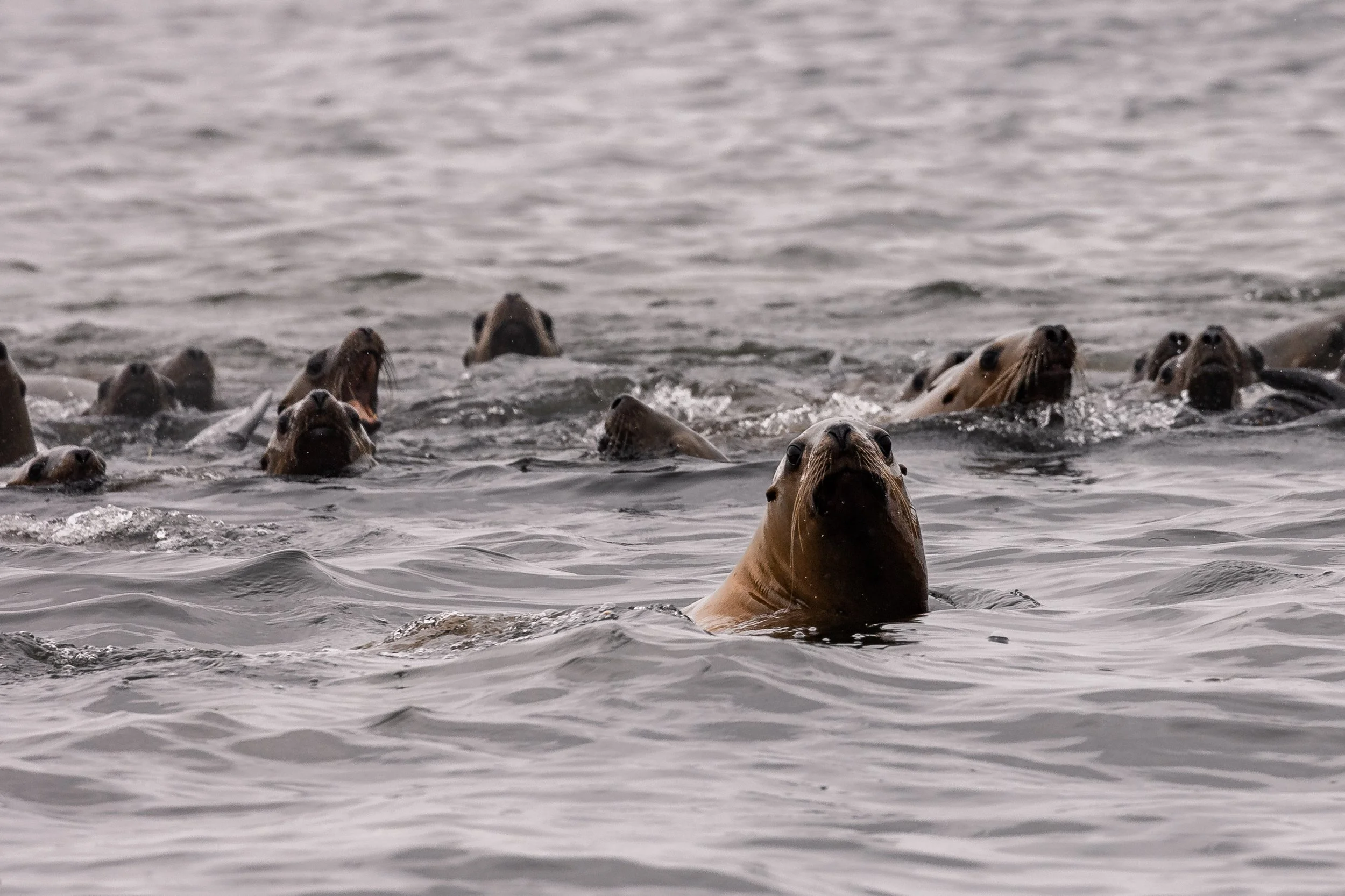 A raft of sea lions curiously watching us.