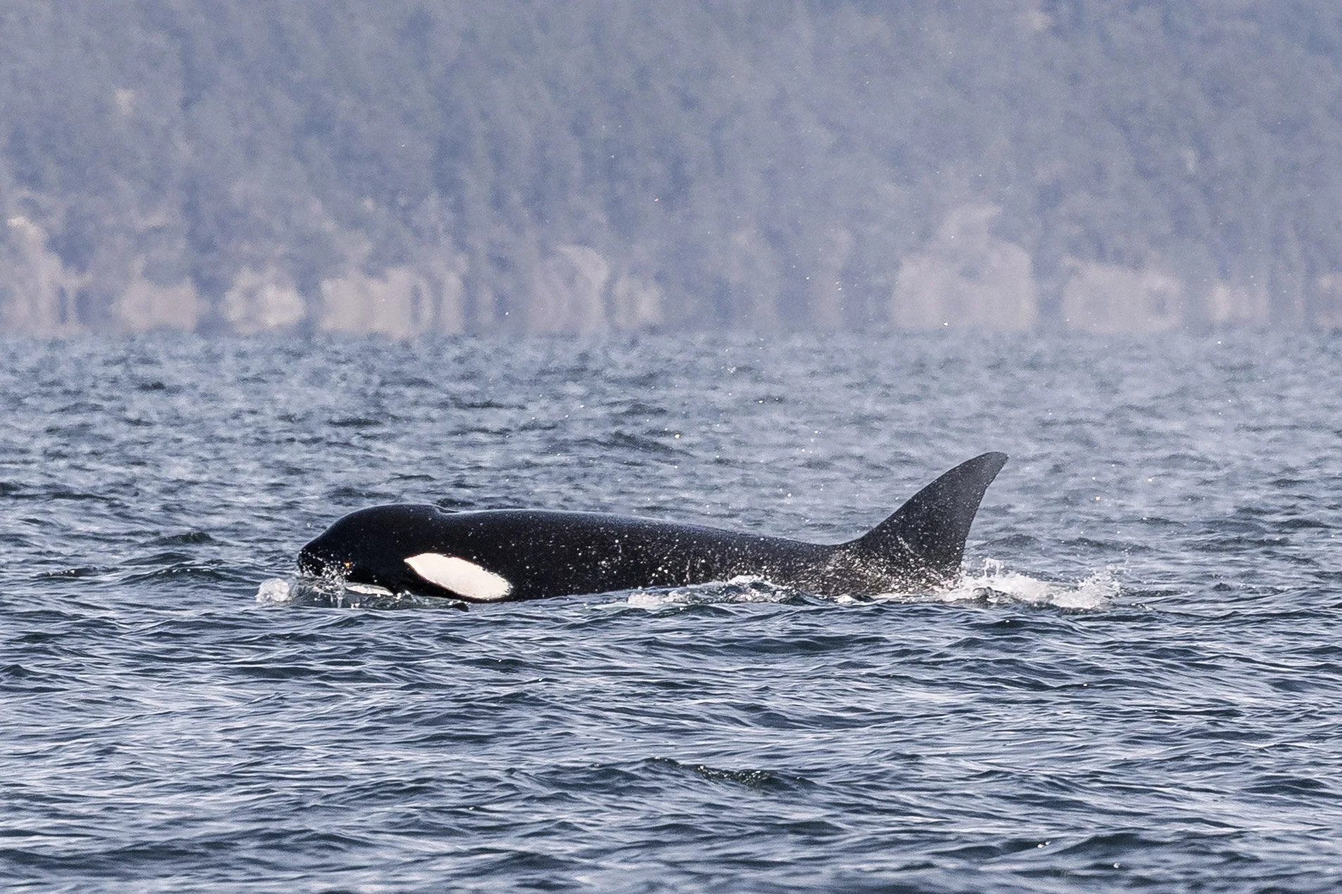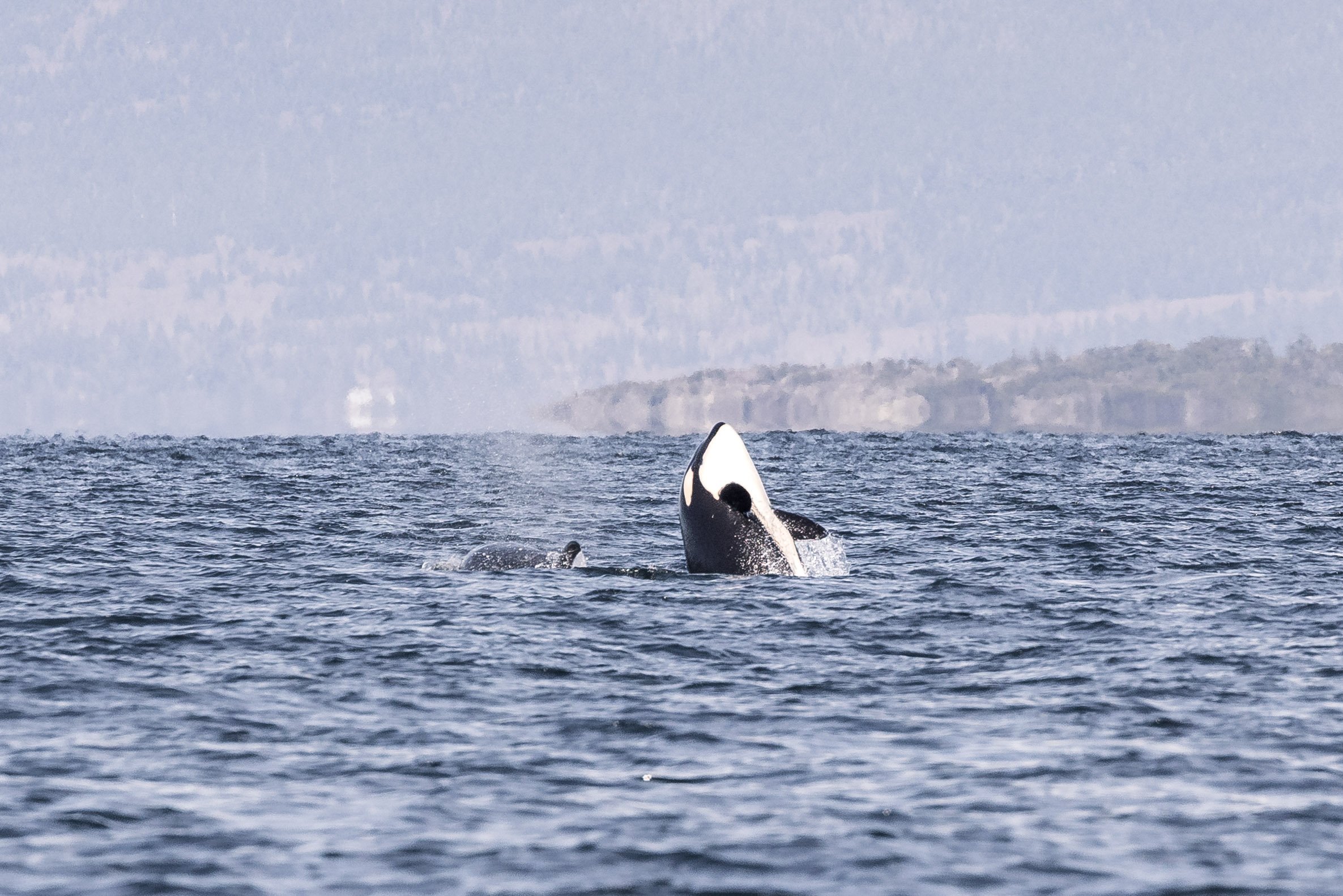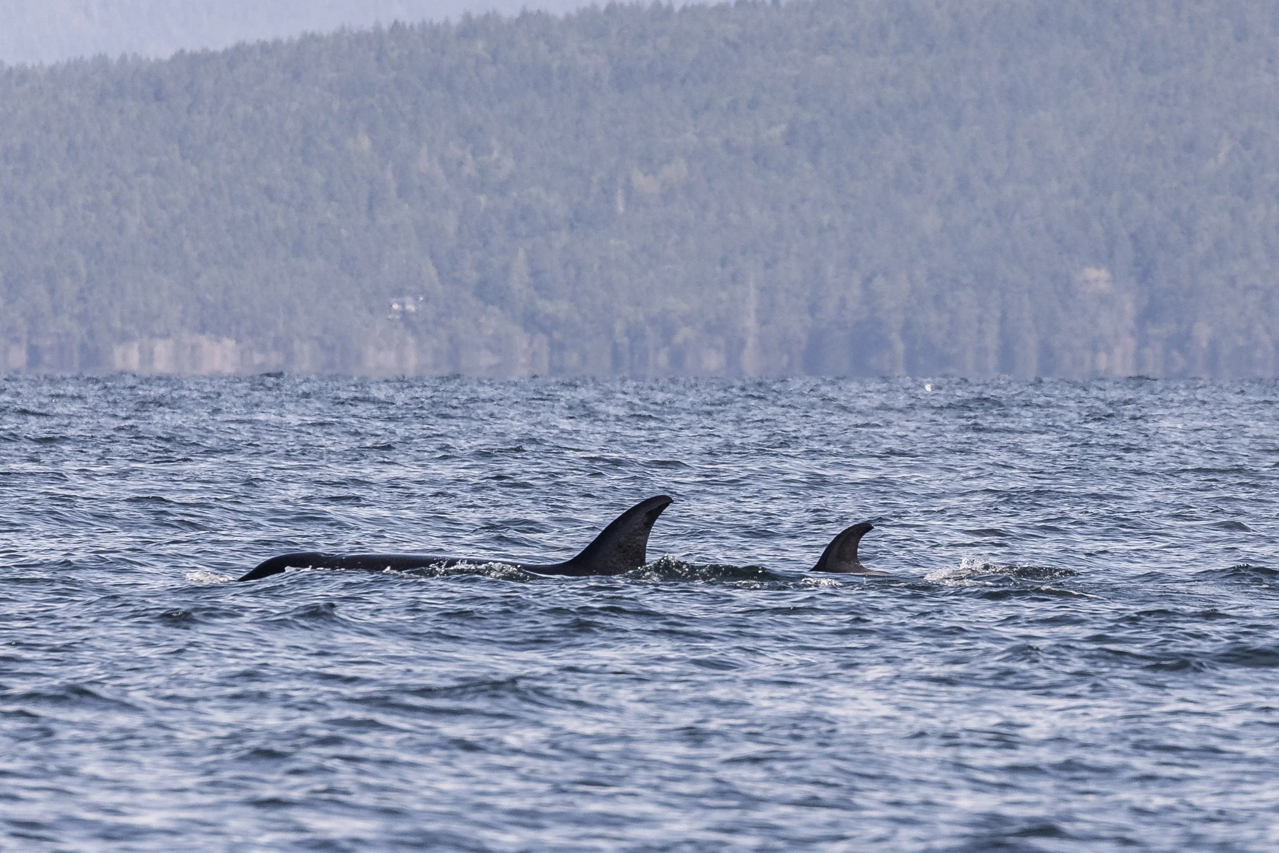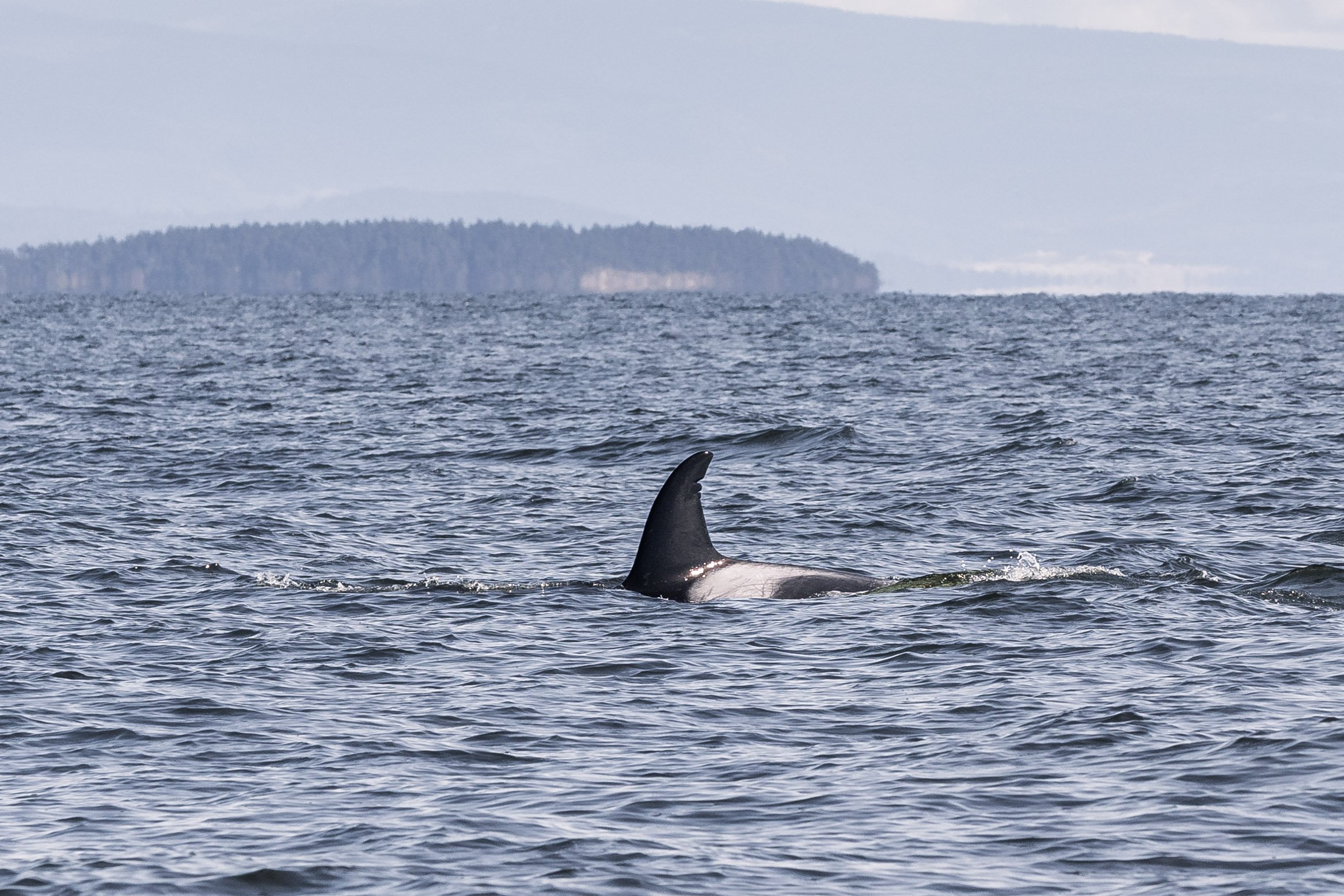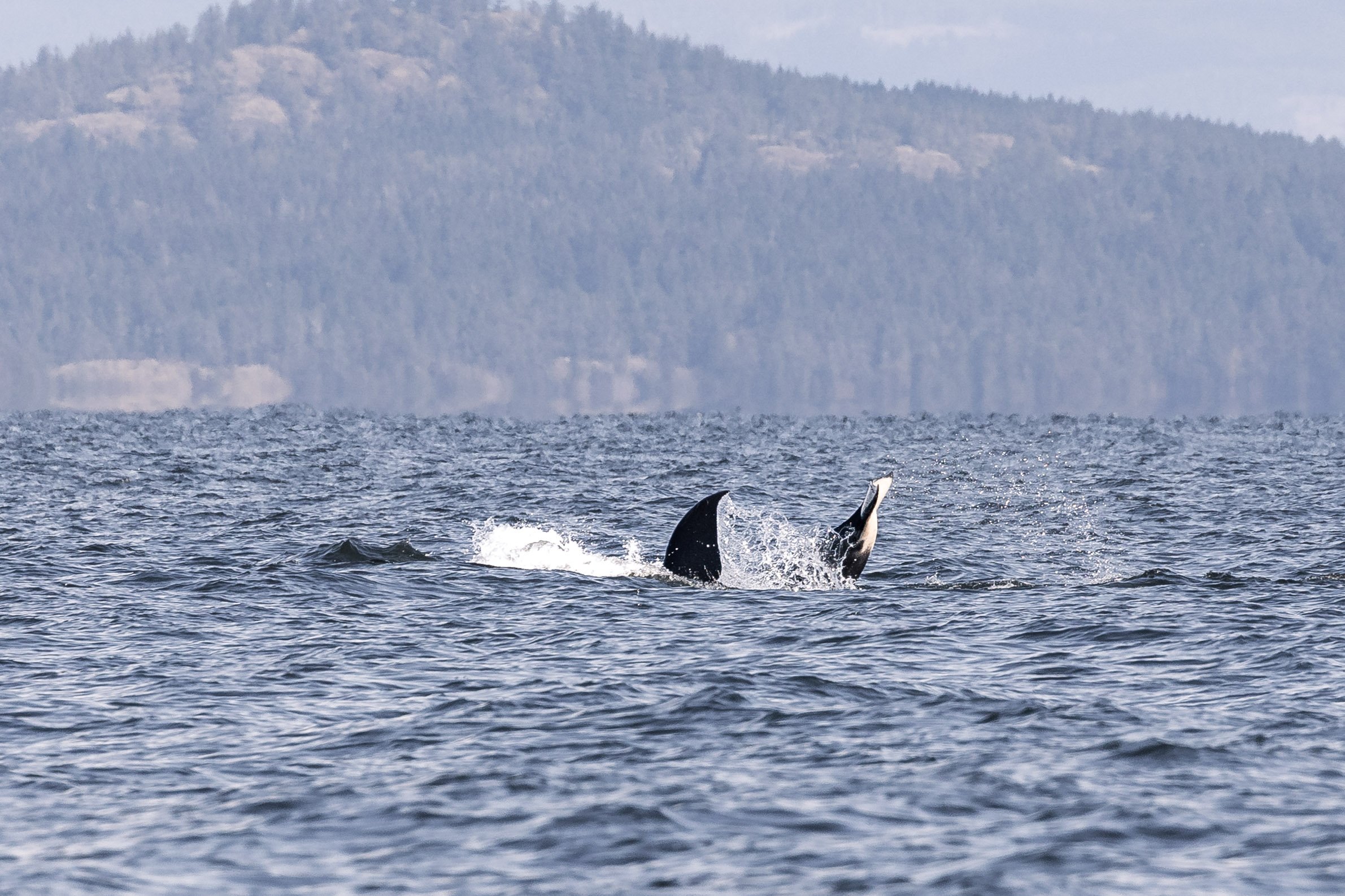 Lucky for us, the onboard Marine Naturalist Vanessa Vereschahen was quick with her camera, capturing not only the action but also the important information that we needed to figure out the identification for these whales. Dorsal fins, saddle patches, and eye patches are all unique for each whale, allowing us to know exactly which whales are present in any given encounter. Today, there were three different pods spending their time socializing in the Strait: