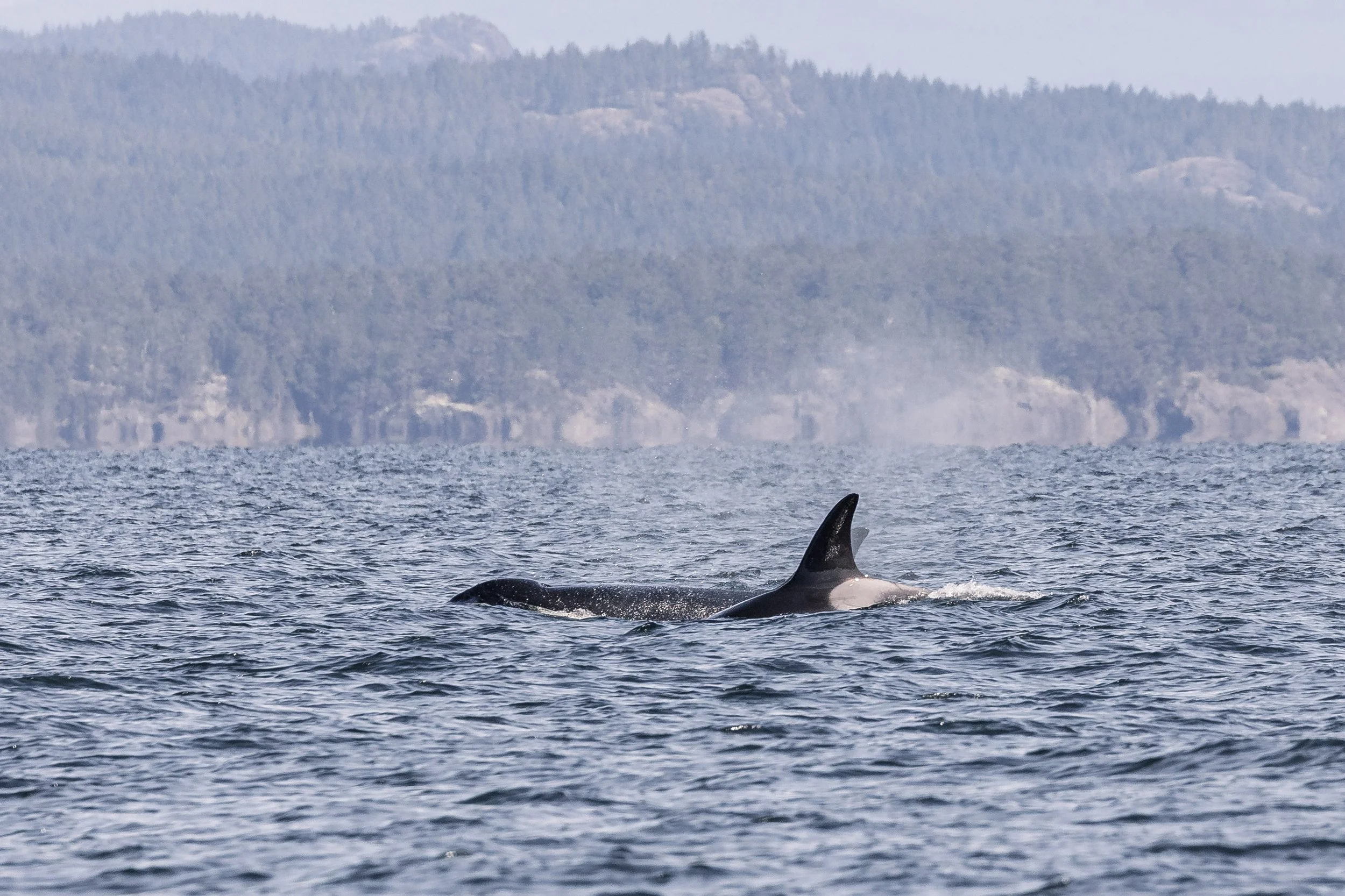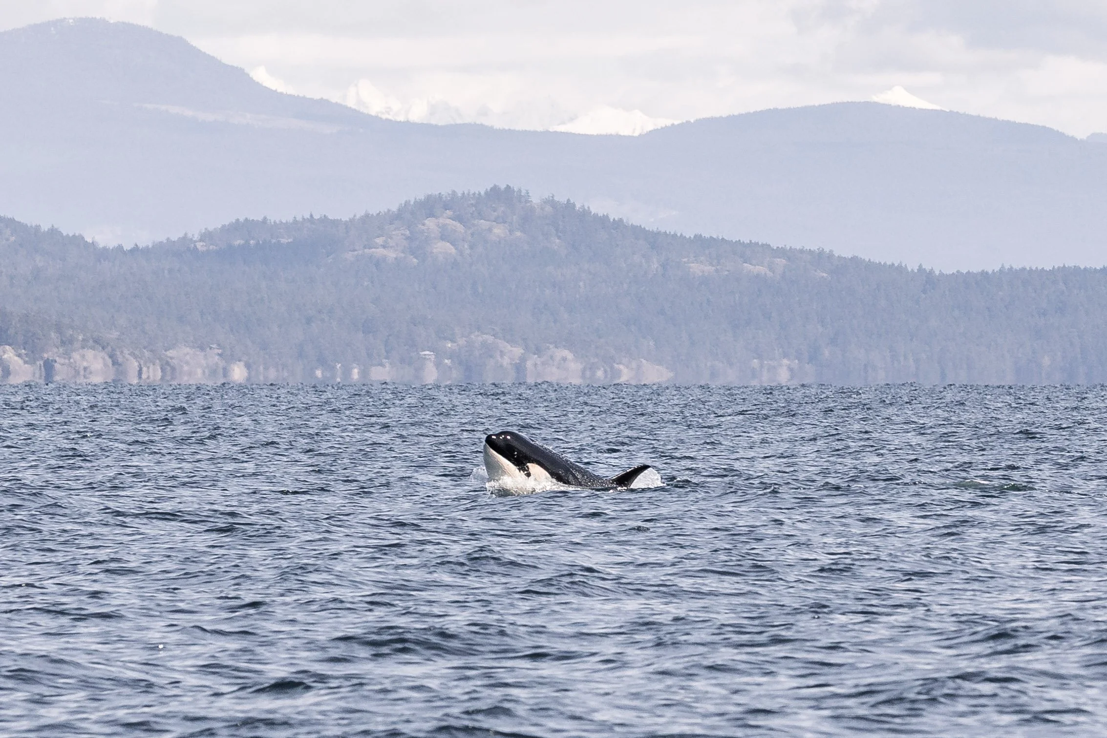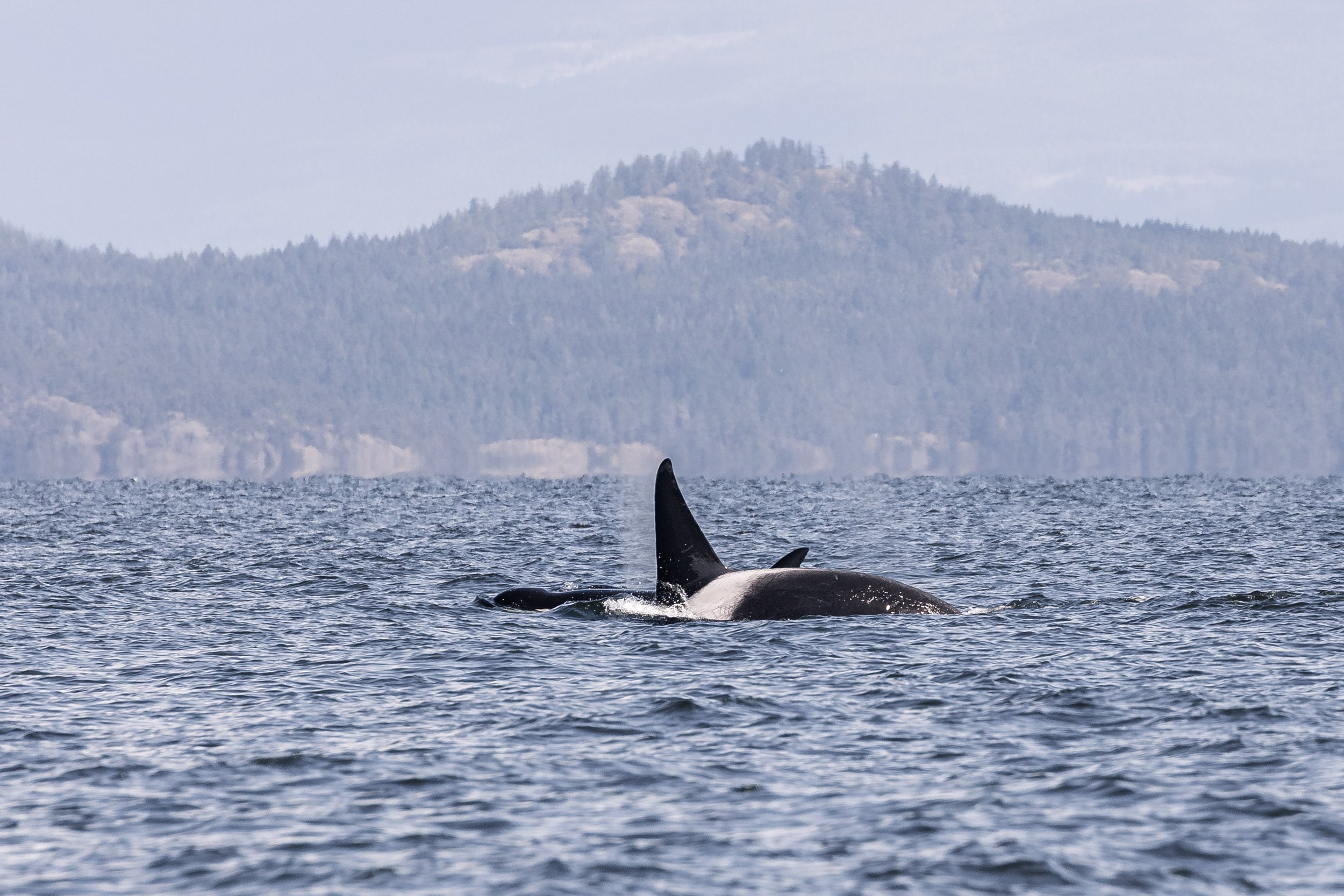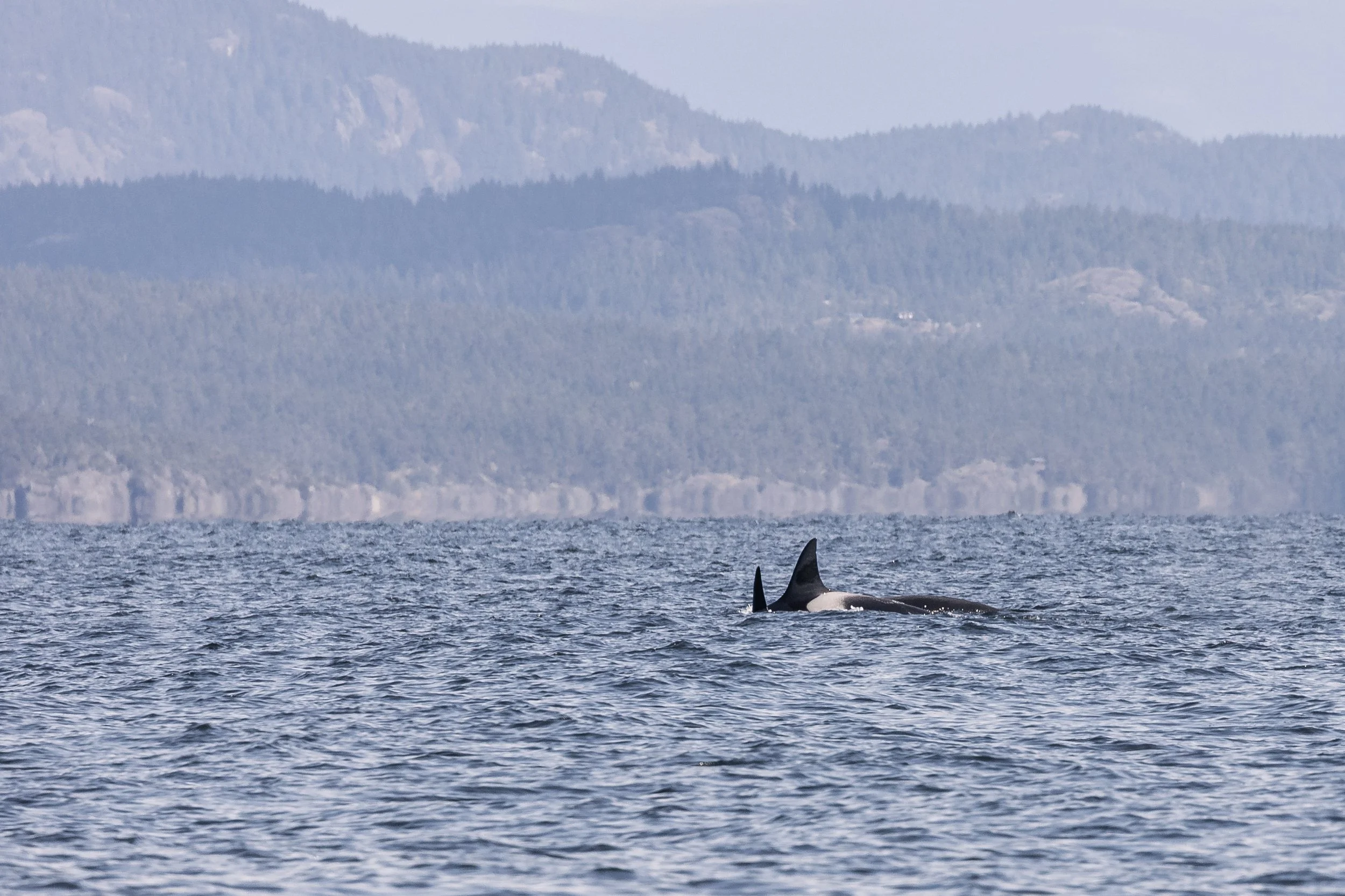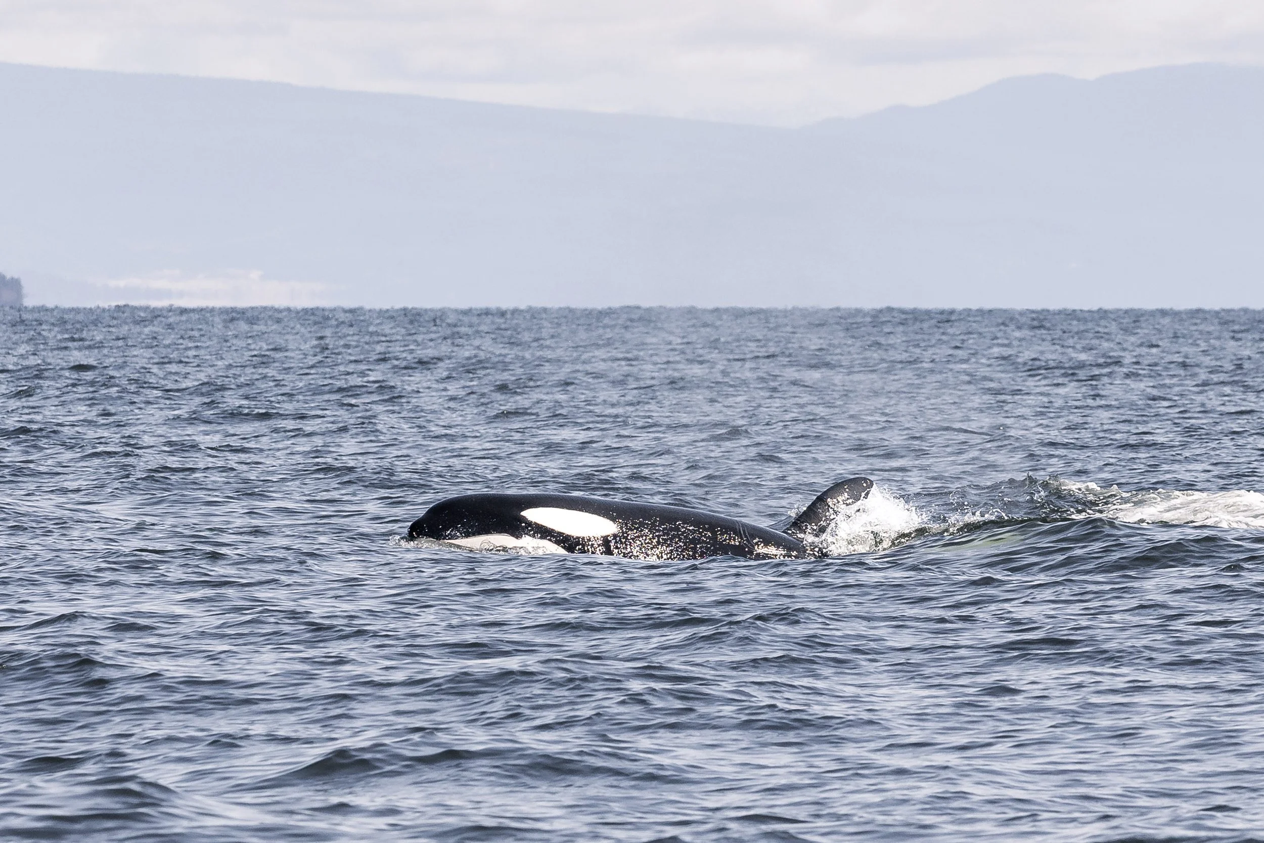 Lucky for us, the onboard Marine Naturalist Vanessa Vereschahen was quick with her camera, capturing not only the action but also the important information that we needed to figure out the identification for these whales. Dorsal fins, saddle patches, and eye patches are all unique for each whale, allowing us to know exactly which whales are present in any given encounter. Today, there were three different pods spending their time socializing in the Strait: