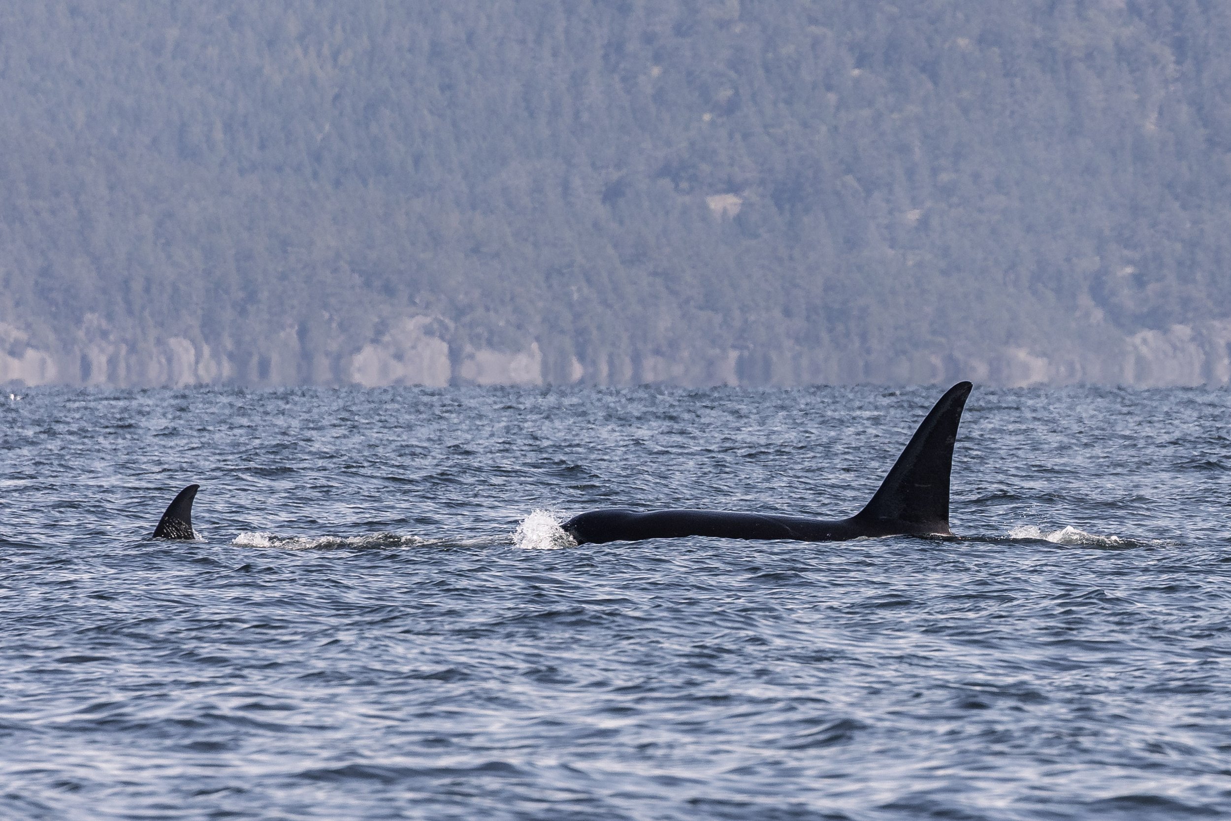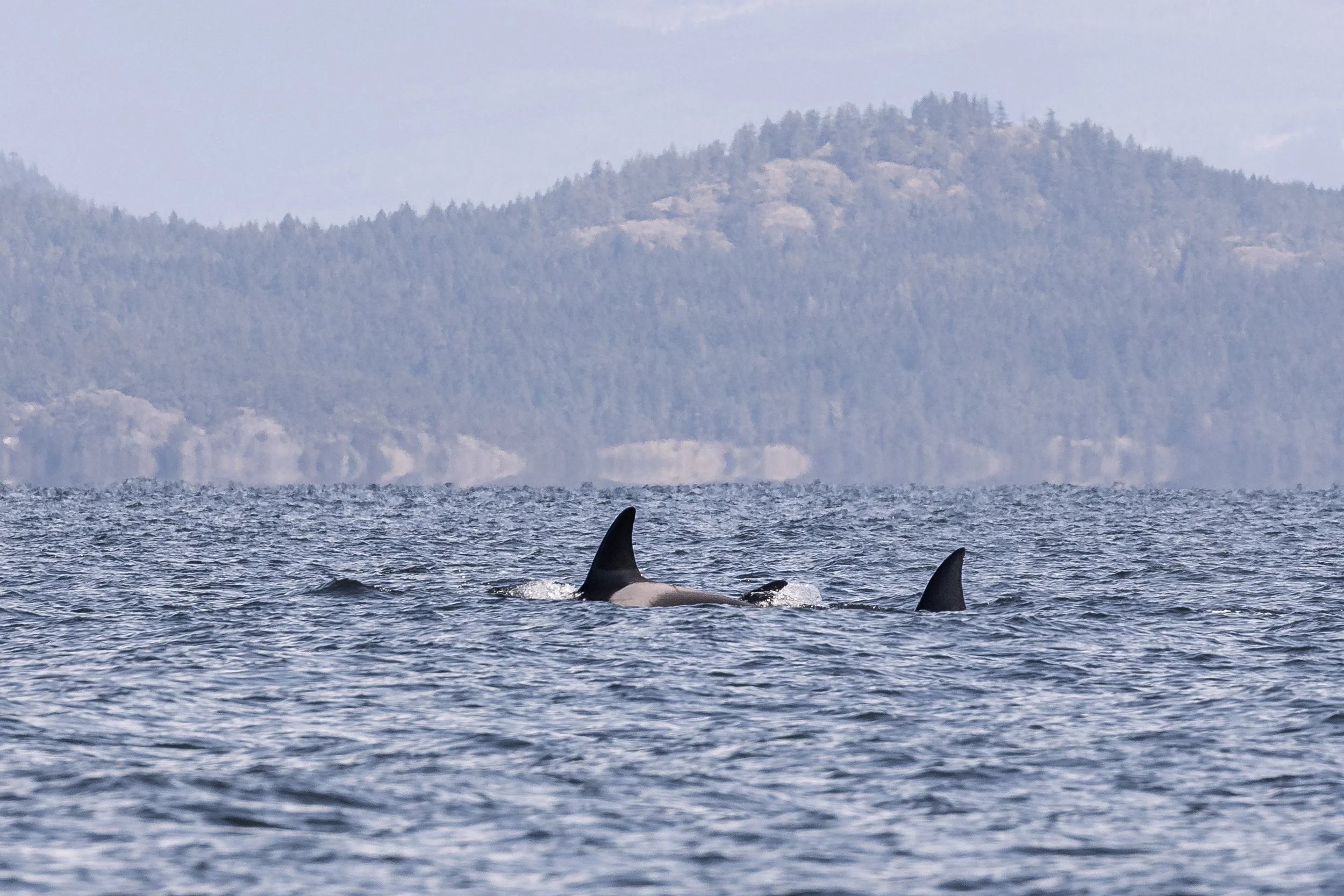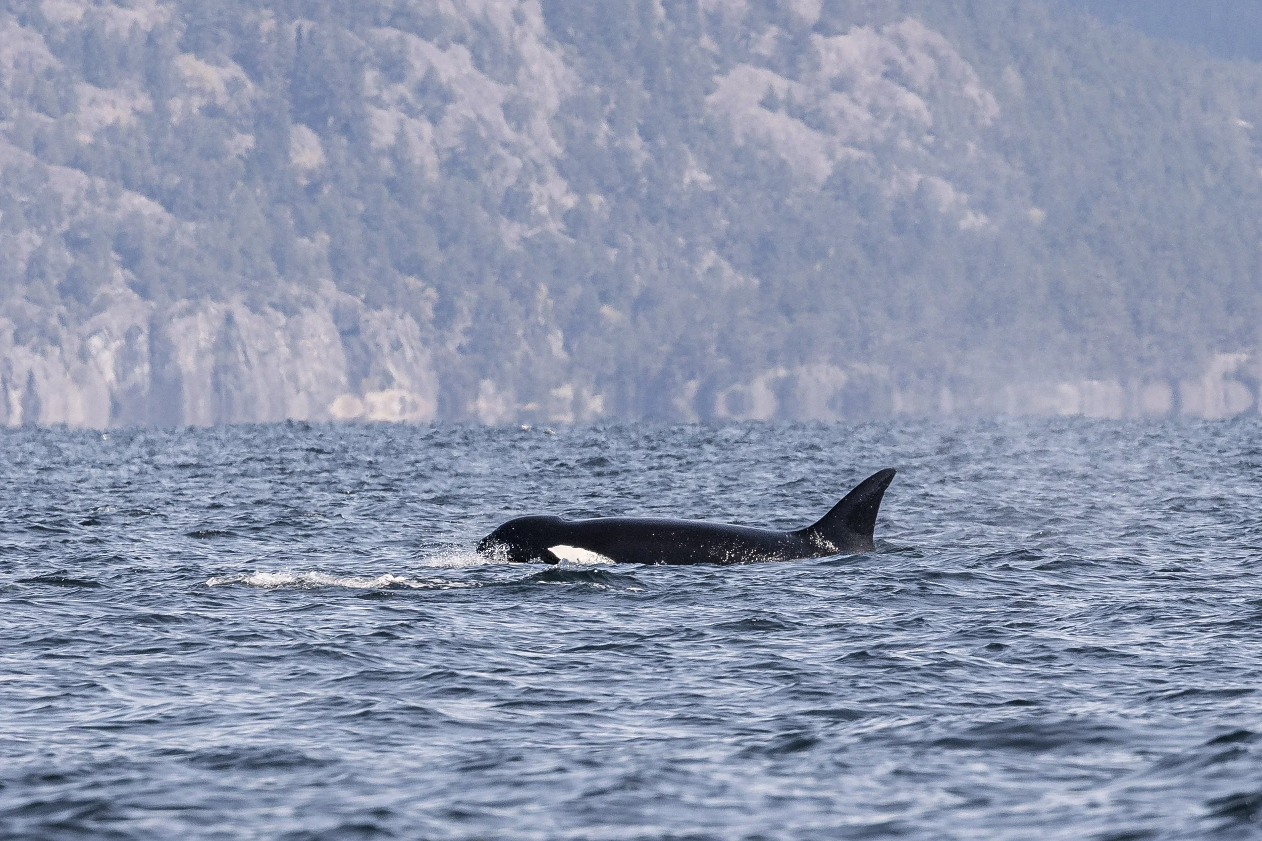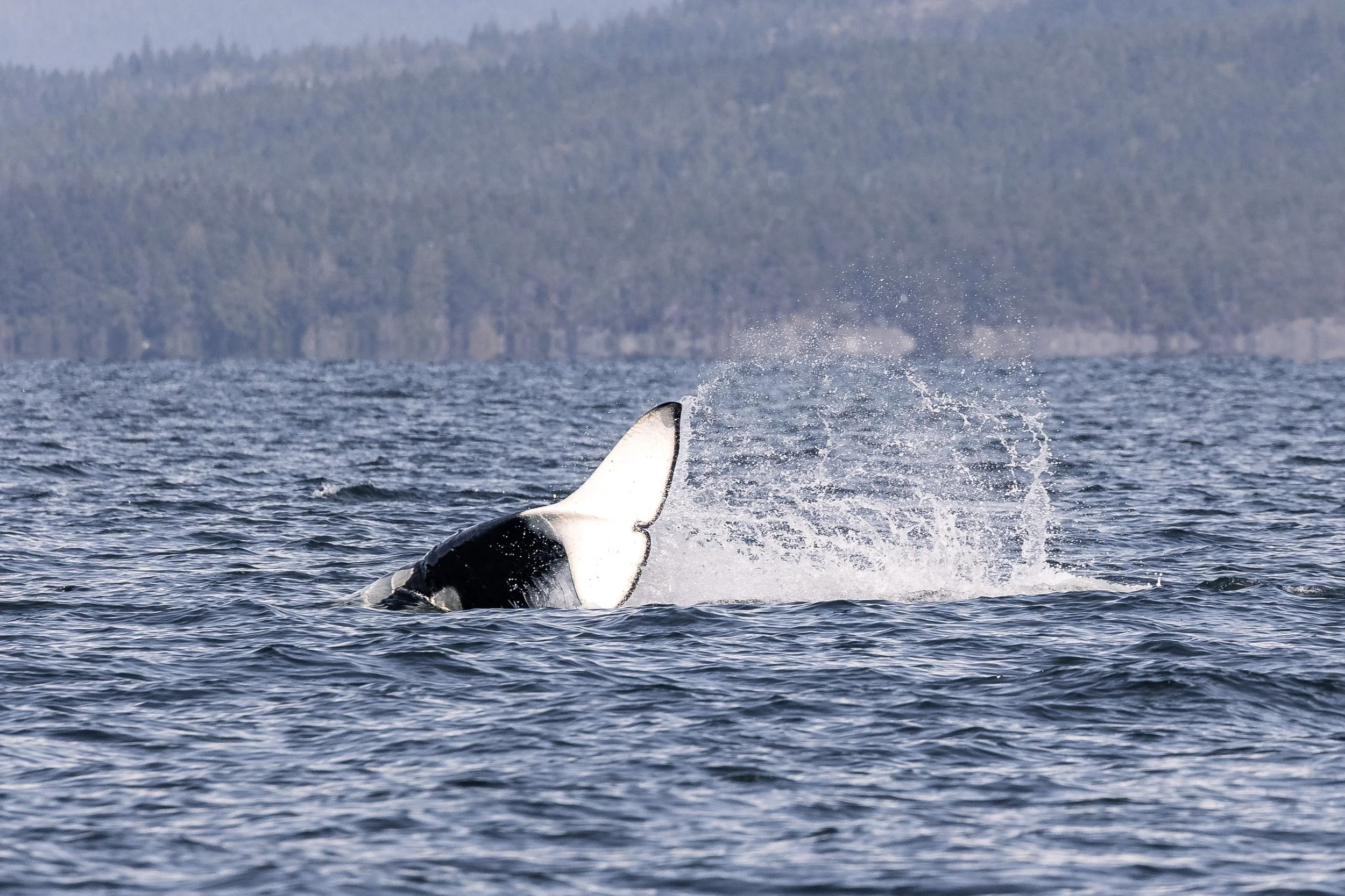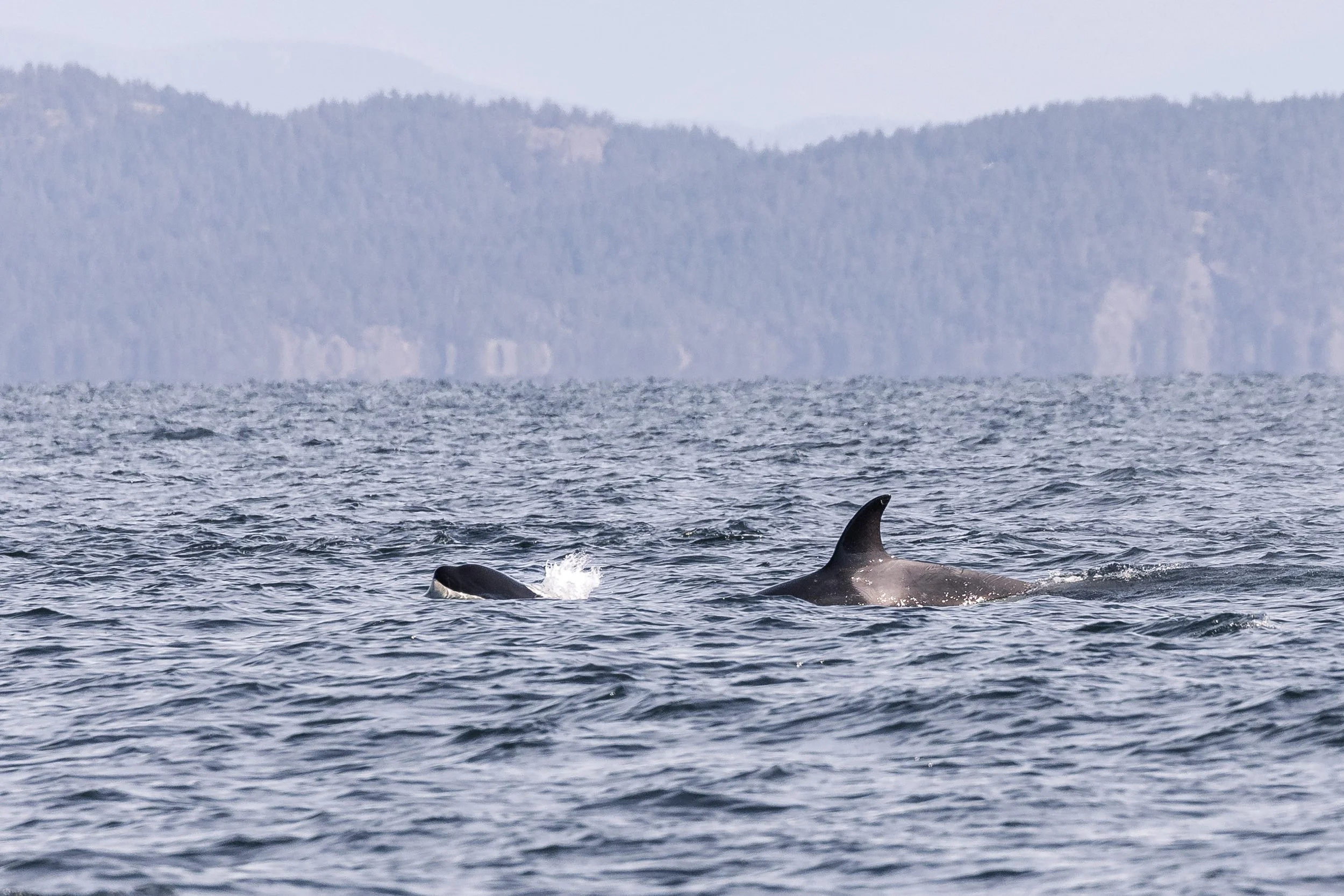 Lucky for us, the onboard Marine Naturalist Vanessa Vereschahen was quick with her camera, capturing not only the action but also the important information that we needed to figure out the identification for these whales. Dorsal fins, saddle patches, and eye patches are all unique for each whale, allowing us to know exactly which whales are present in any given encounter. Today, there were three different pods spending their time socializing in the Strait: