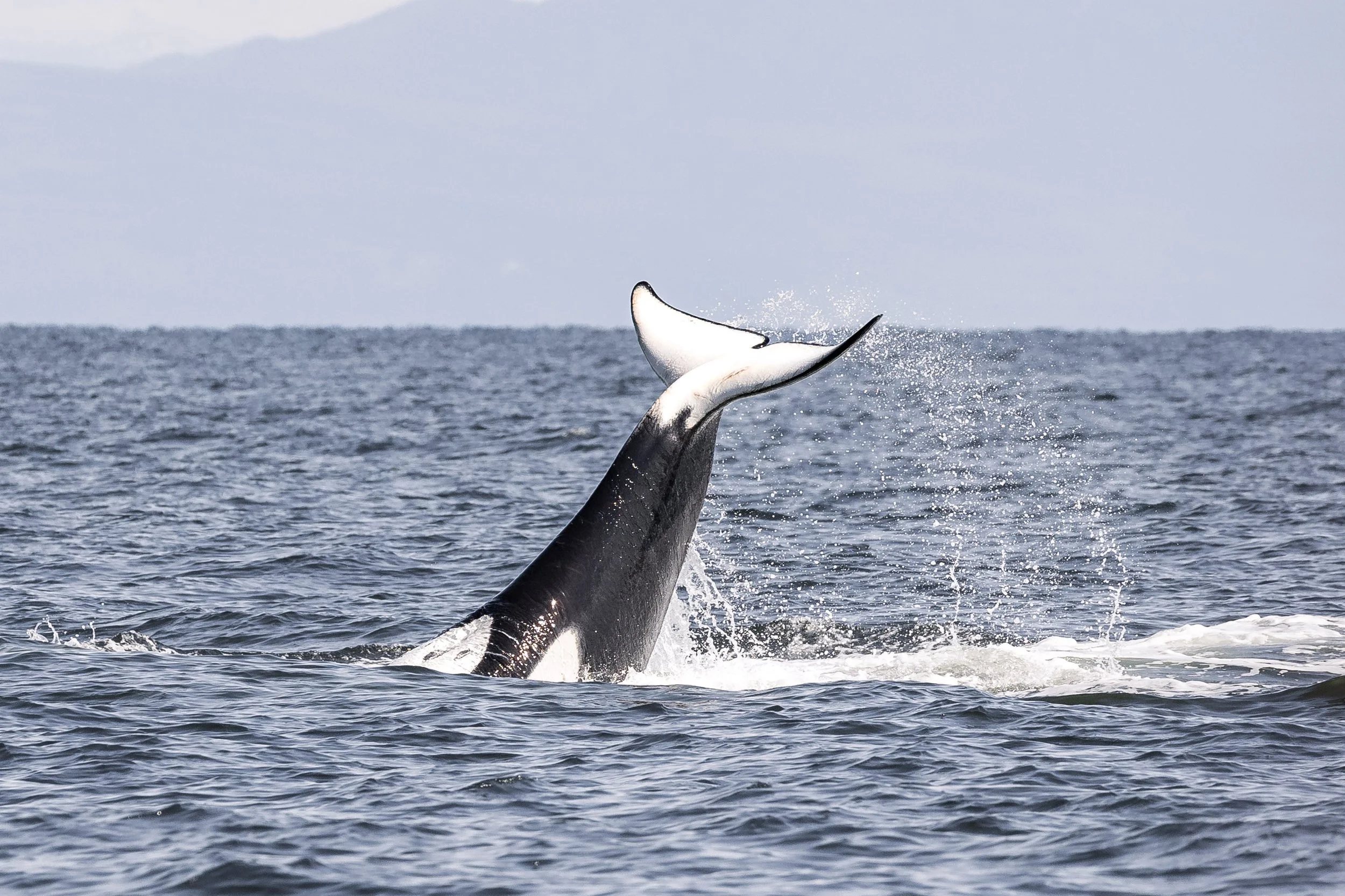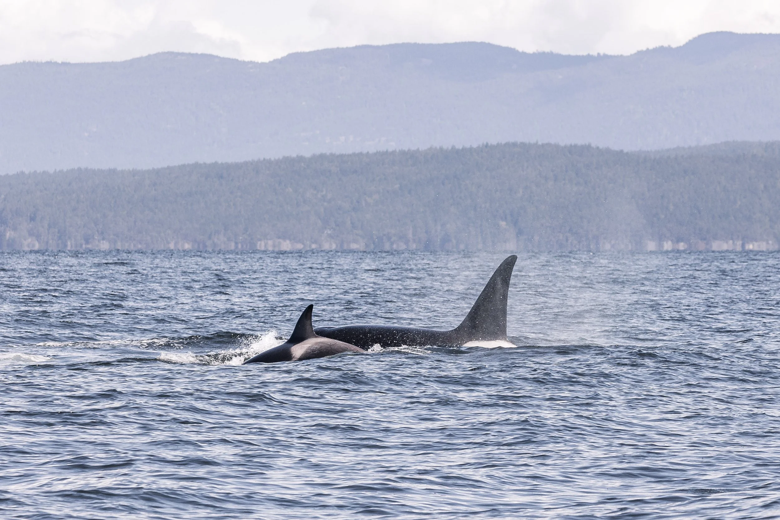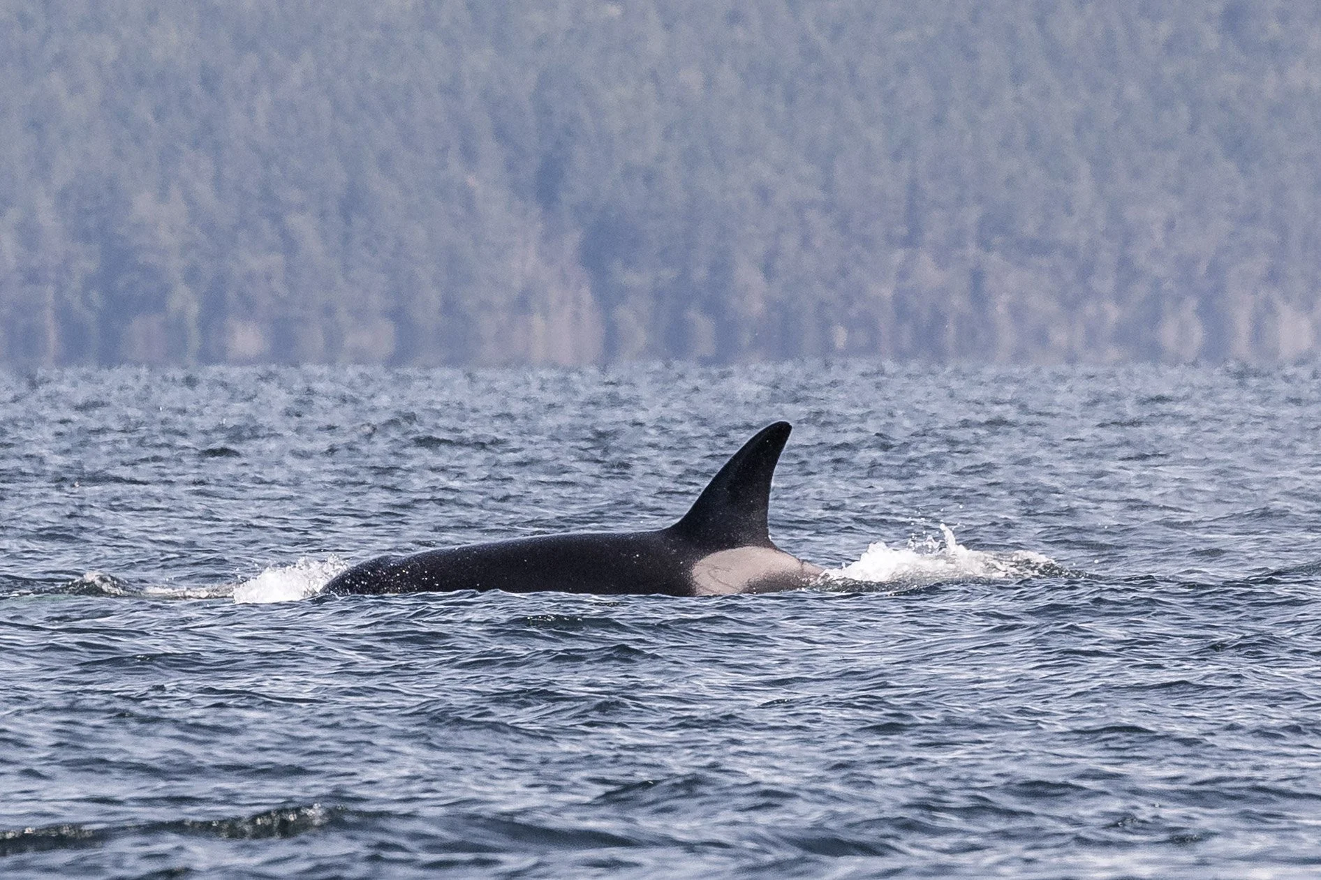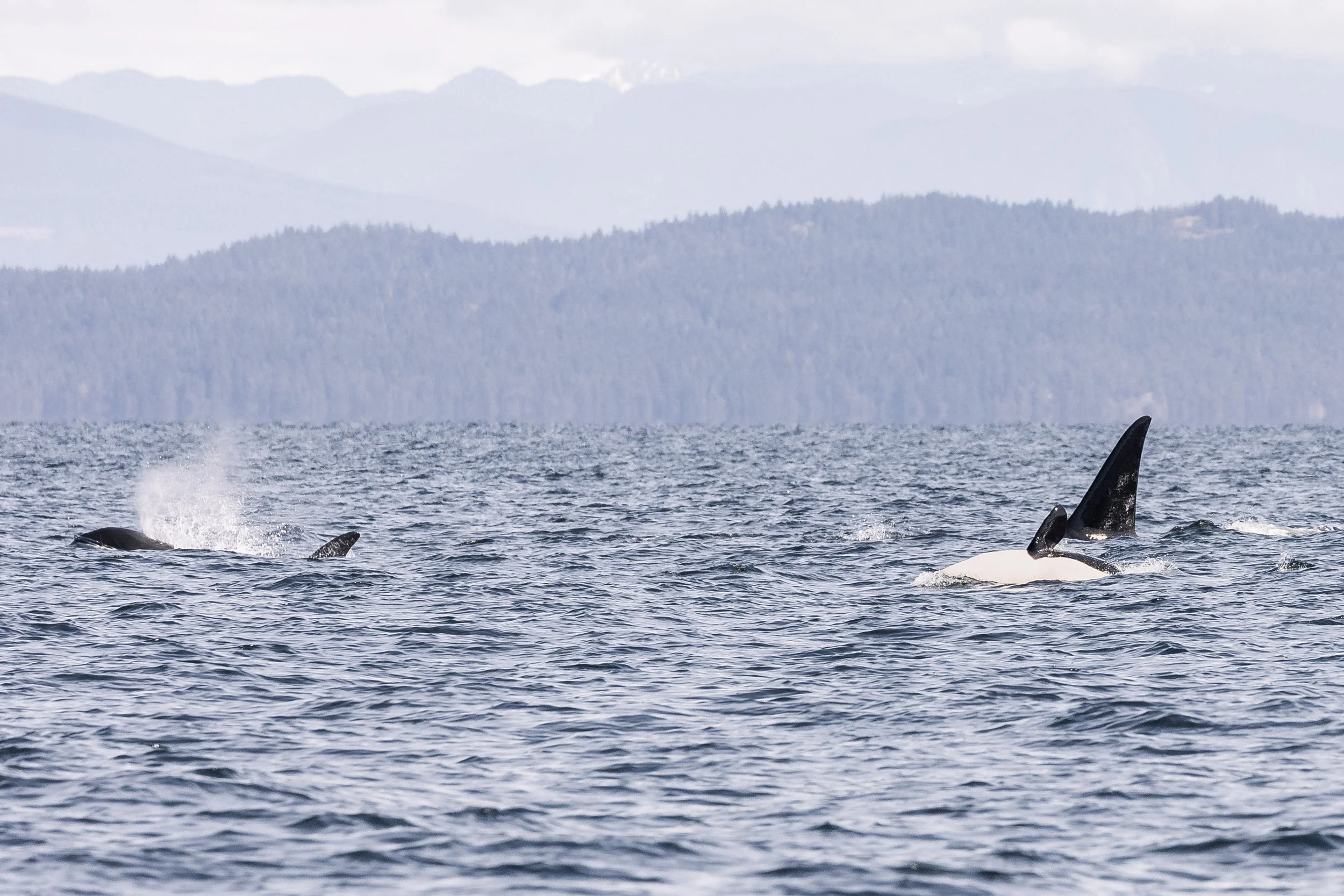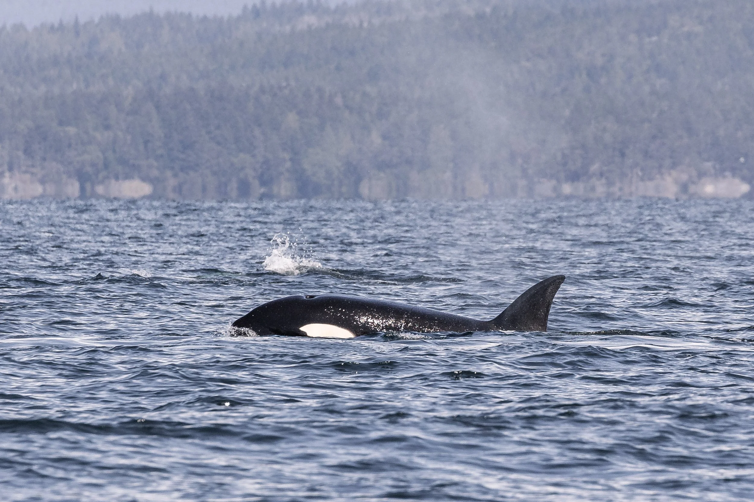 Lucky for us, the onboard Marine Naturalist Vanessa Vereschahen was quick with her camera, capturing not only the action but also the important information that we needed to figure out the identification for these whales. Dorsal fins, saddle patches, and eye patches are all unique for each whale, allowing us to know exactly which whales are present in any given encounter. Today, there were three different pods spending their time socializing in the Strait: