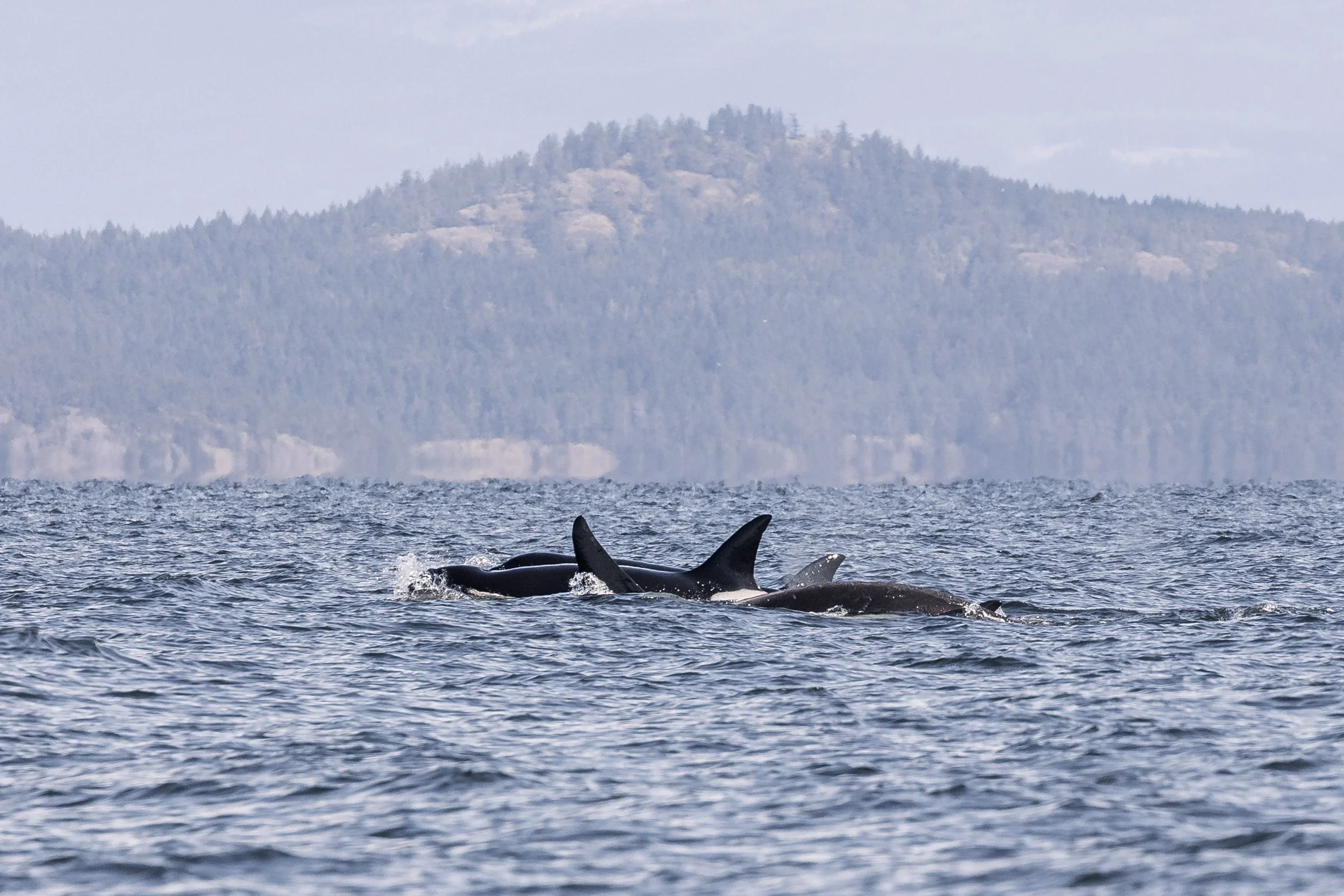 This meeting of whales is particularly special, since these whales are all related! Although it’s tough to see by their names. The scientific name of an orca typically tells you about its lineage, starting with a number, then their offspring are given a letter in order of their birth, and it flips back and forth from numbers to letters as the generations progress. But, this isn’t true for older whales. When they first started cataloguing, they would assign numbers in the order they saw the whales, which led to some connections being missed. Over time, these connections were noticed, and researchers noted likely family ties that the names wouldn’t connect. The T099s are one of these missed connections! It’s thought that T099 Bella is actually T036 Flapjack’s firstborn. There is another piece missing from this puzzle, too, as T137 Loon is also thought to be Flapjack’s daughter. That means that although T036B Tattertip, who we saw today, bears the “B” typical of the second born of the family, she is likely Flapjack’s 4th kid!
