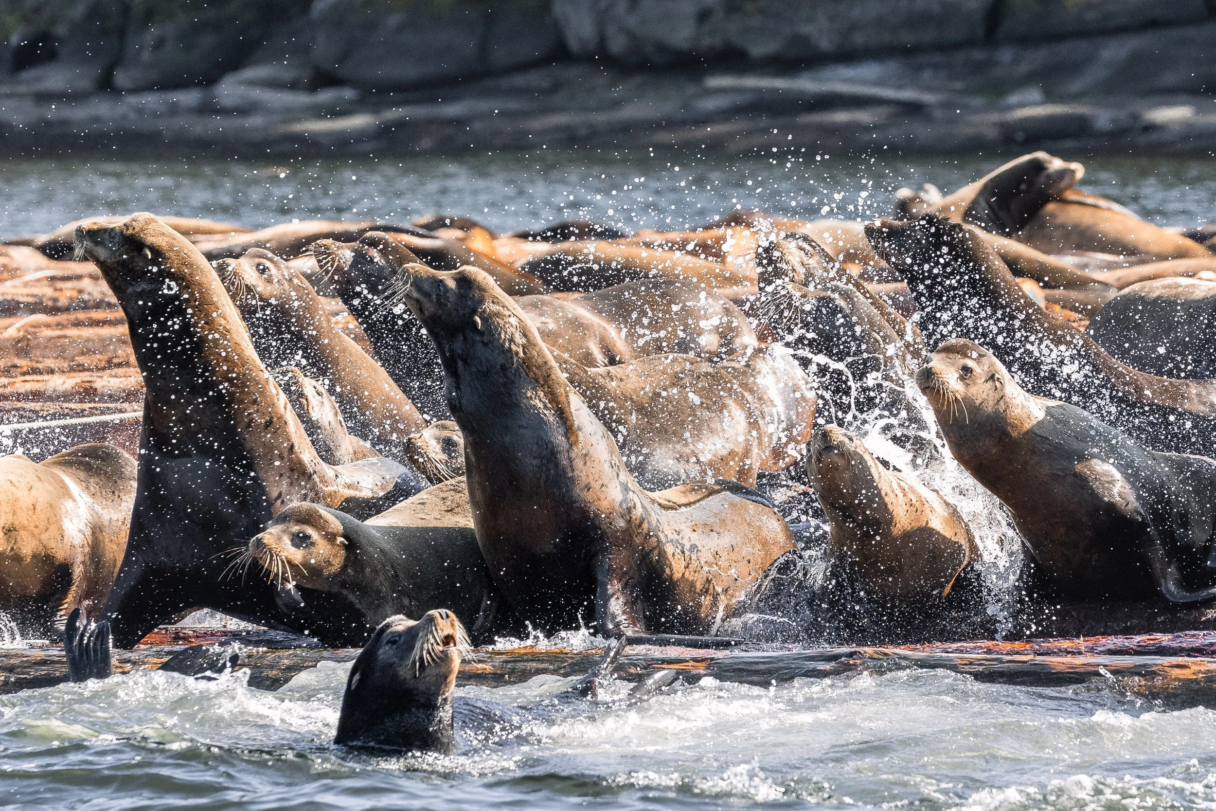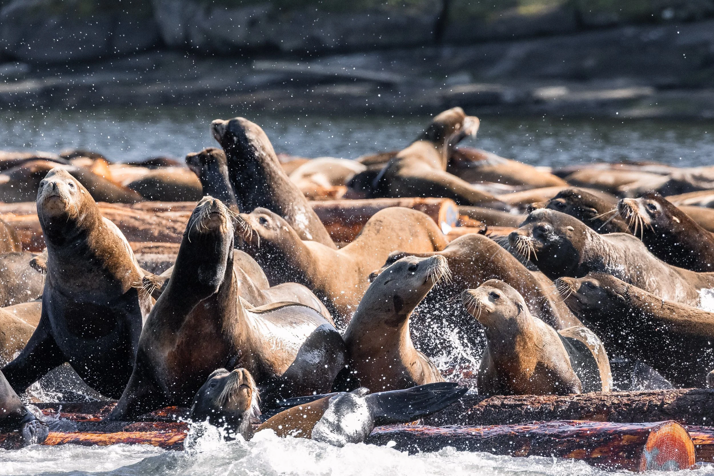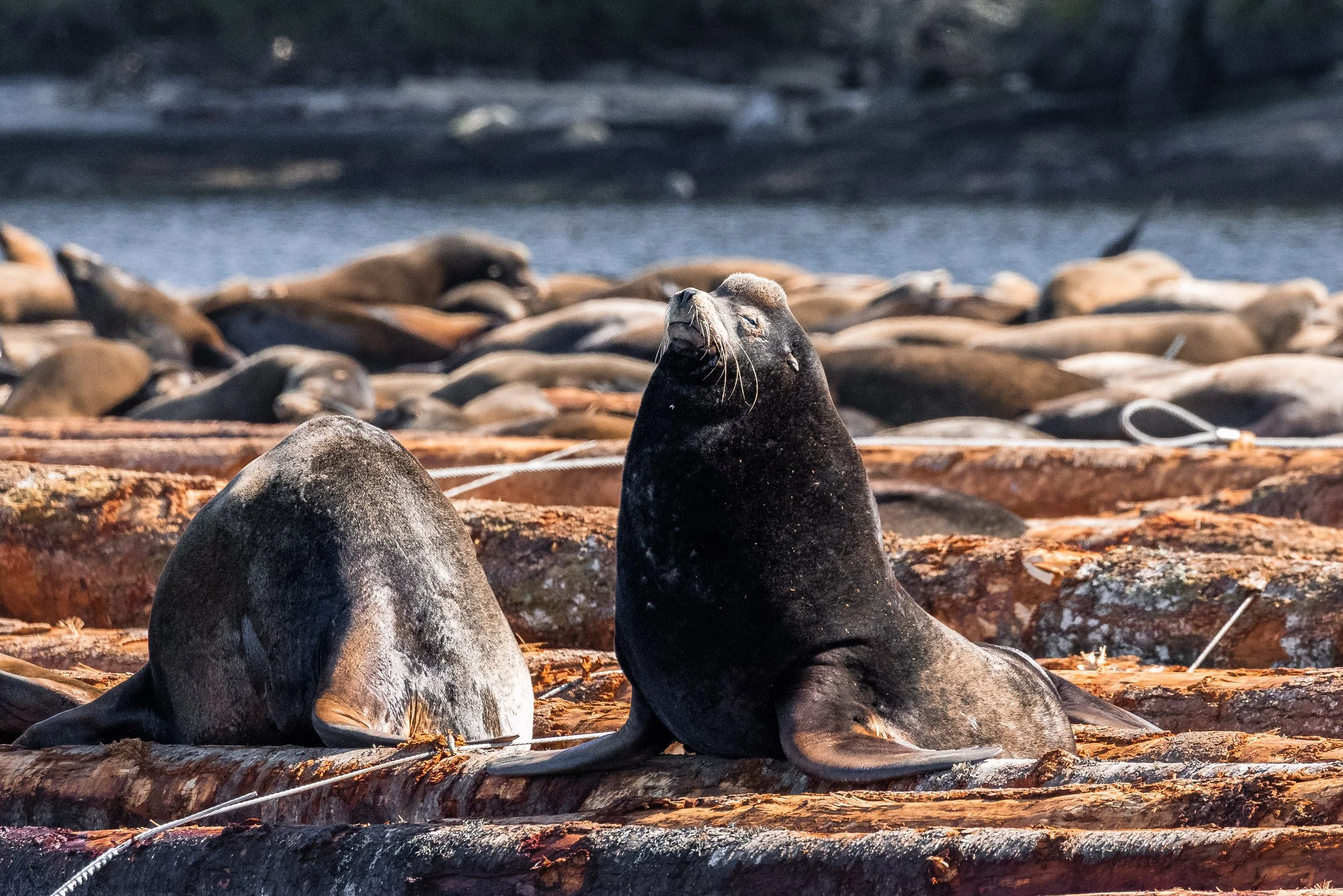 Eventually, it was time to leave these whales to their social celebrations, and we continued on our way, feeling fortunate to have seen them socializing in the wild. The excitement of the day wasn’t over yet, though! We made the long journey home, travelling with purpose over the waves back towards Nanaimo. There was one more stop to make before returning to the harbour, though. Keta was pointed into Northumberland Channel, aiming at the log booms that are tied up along the shoreline. As we approached, we could hear why we were here before we could see it. There was a constant loud noise heard over the engines as we slowed down: the barking of California Sea Lions! These large pinnipeds are often found enjoying their day resting on these logs. Since they need to spend nearly half their time outside of the water to maintain their body heat, this can be the perfect place. The logs will float up and down with the tide, ensuring that the spot is always available to them. In addition to the open space, there are plenty of food options nearby, thanks to the proximity of Dodd Narrows and the Nanaimo River Estuary. The sea lions follow the same basic schedule all day: Eat, sleep, bark, repeat!