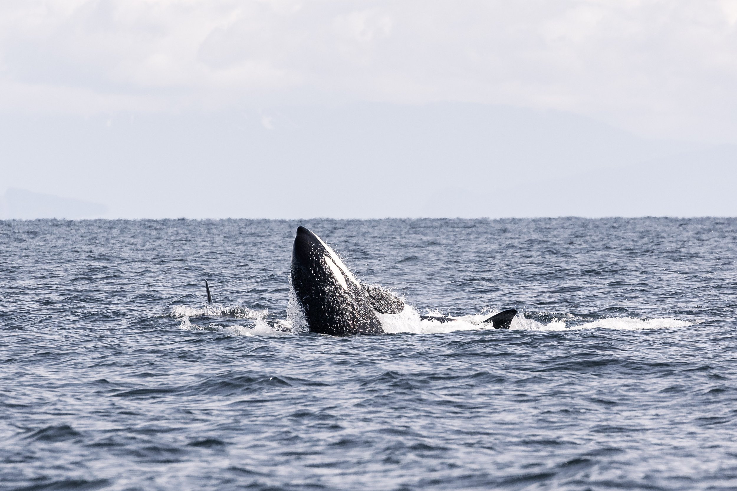 All bundled in our gear and feeling cozy in the anti-exposure suits, we began the journey. We bumped through the waves heading north, eagerly scanning the horizon in search of these earlier seen animals. It’s never guaranteed that we will be able to find whales that were spotted earlier in the day, since they are constantly on the move. Orca in particular cover huge distances: over 100 miles every single day! With this amount of movement and limitless directions to choose from on their travels, it can be tricky. But we were armed with sharp eyes, an experienced crew, and some luck on our side.