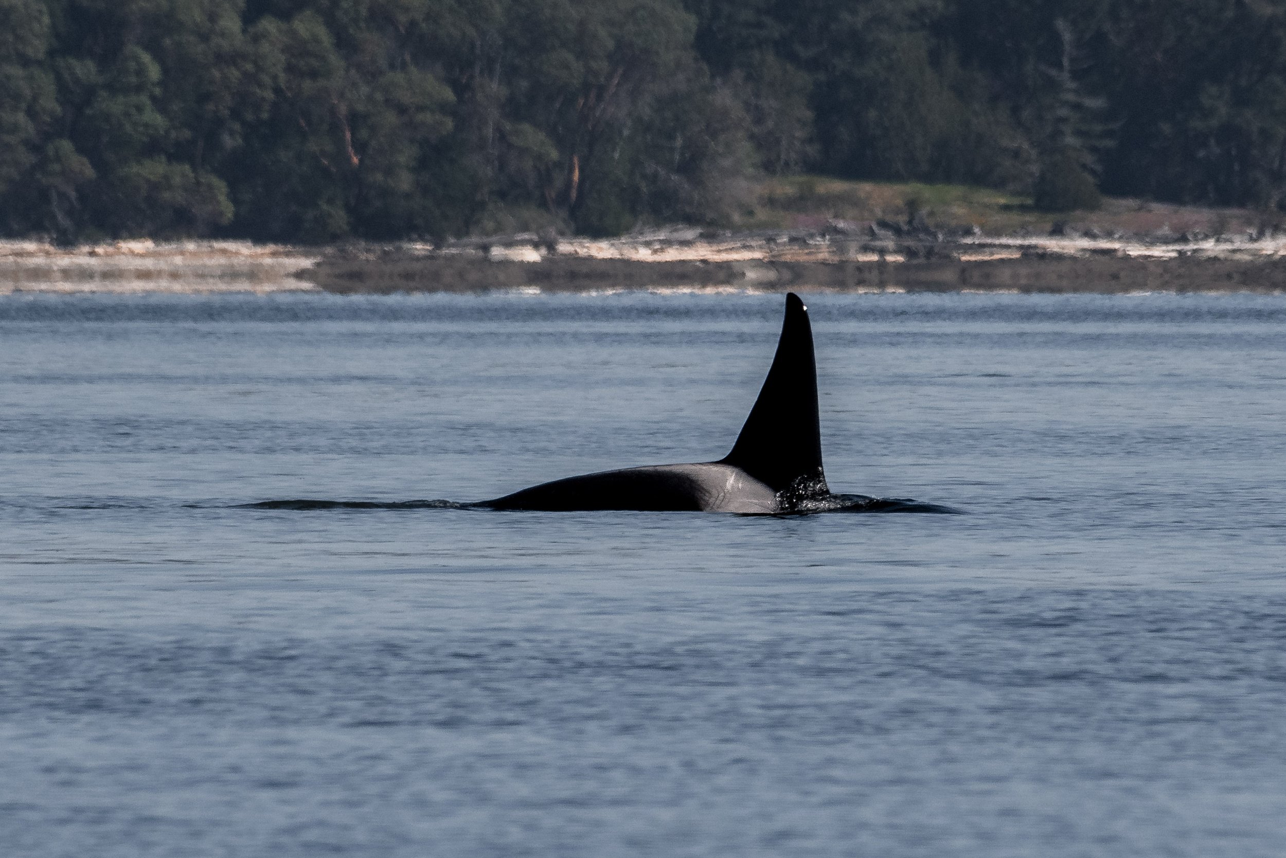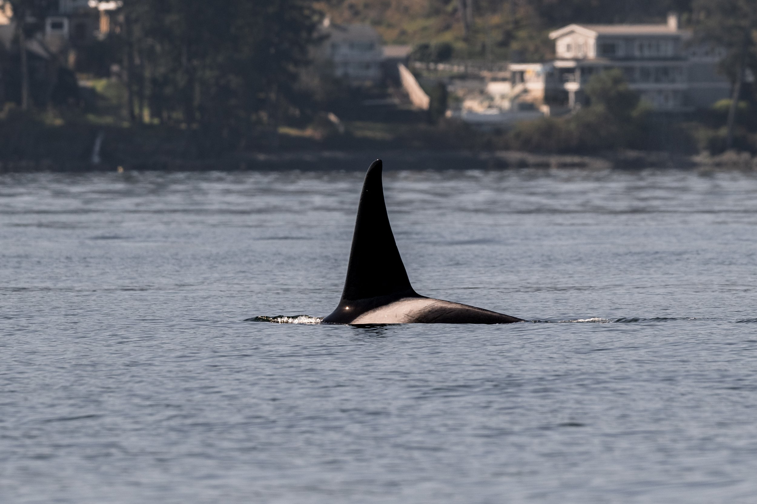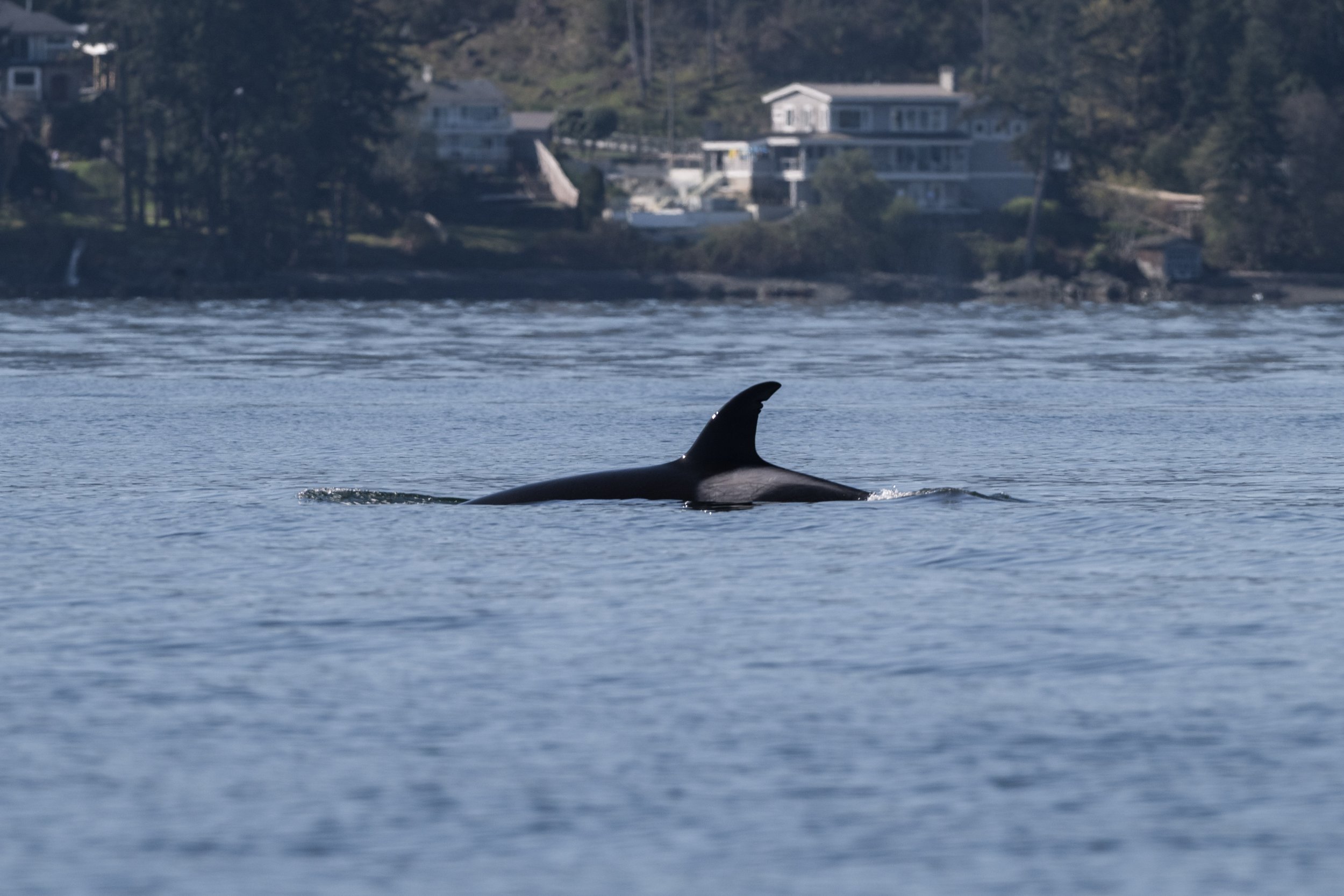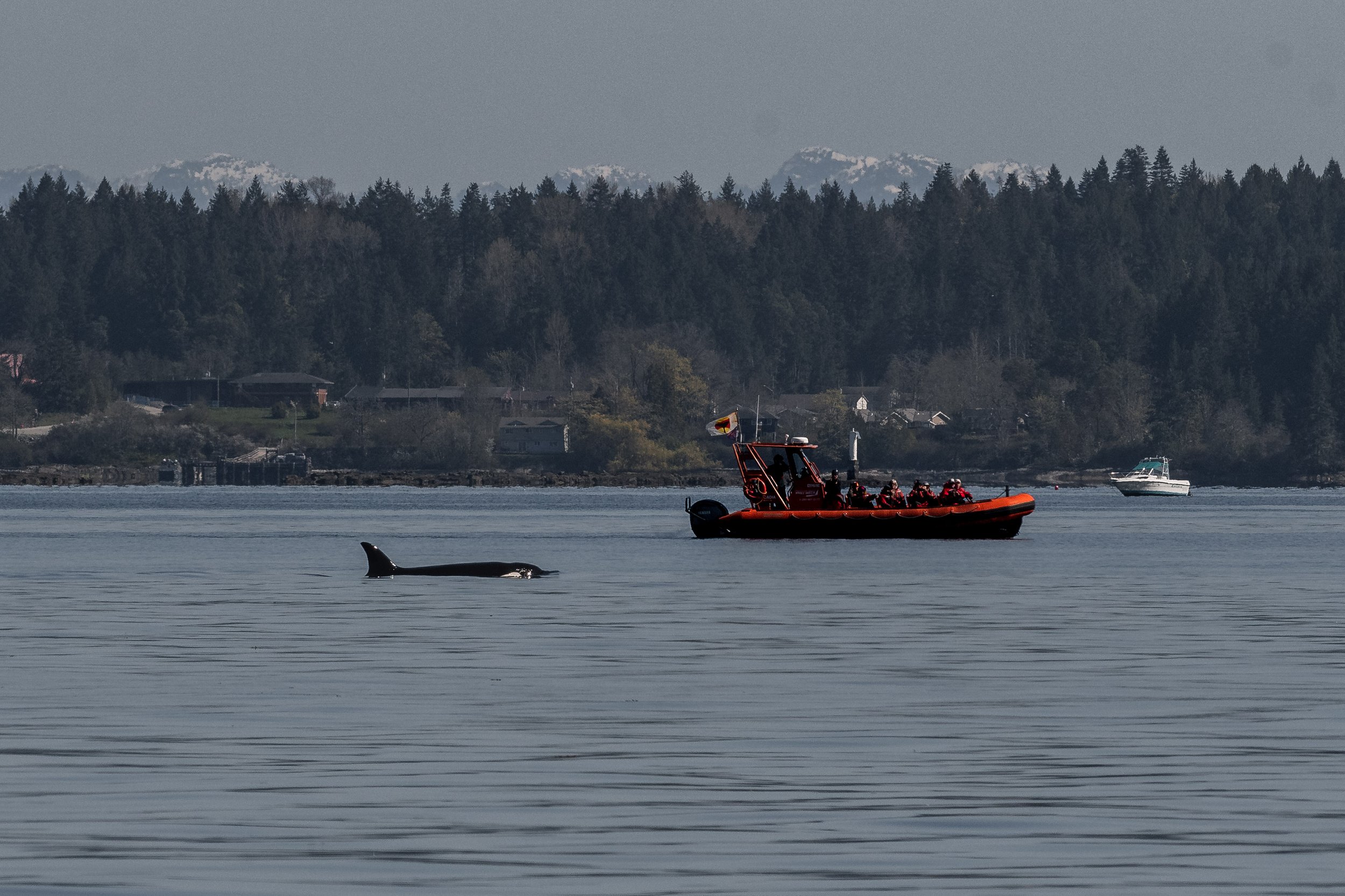 As we neared Chemainus, a quiet excitement began to build. Cutting cleanly through the calm surface was the unmistakable silhouette of a tall, black dorsal fin. Even at a distance, there is something instantly recognizable about that shape. Cameras came up, and telephoto lenses were extended as we moved into position to capture identification shots.