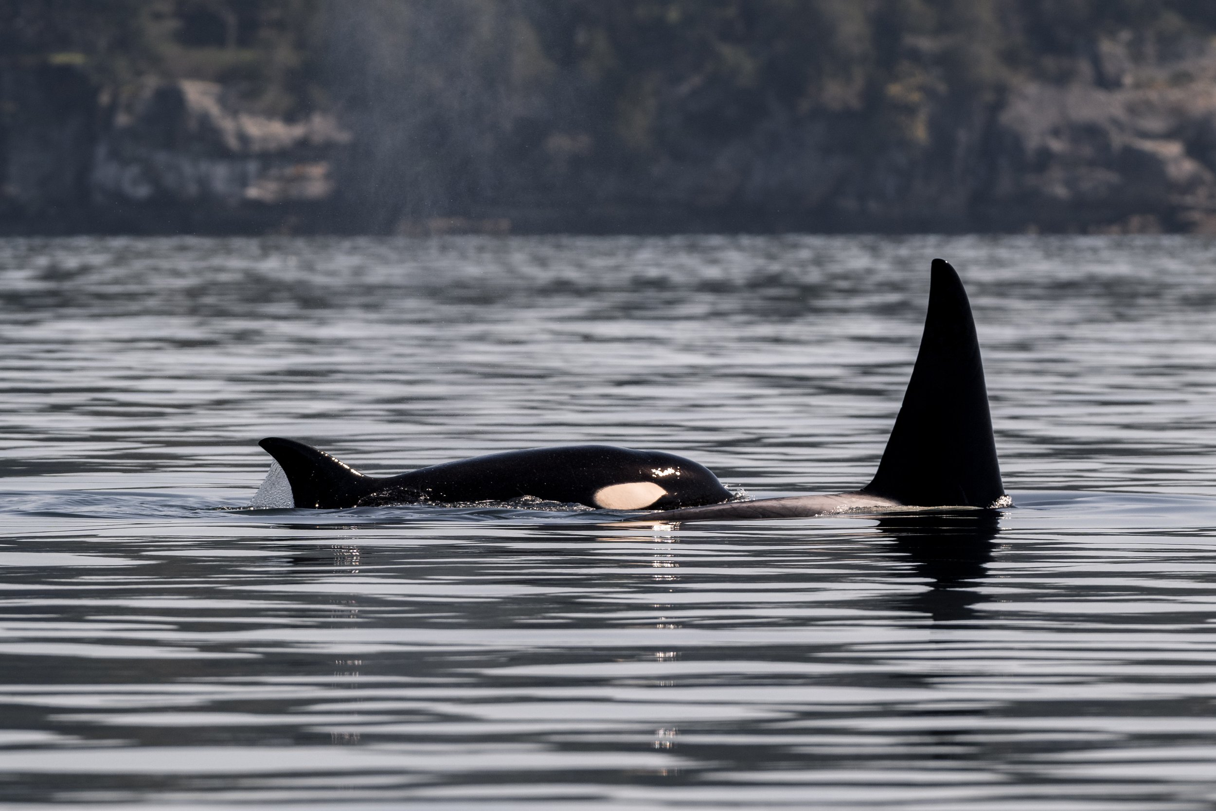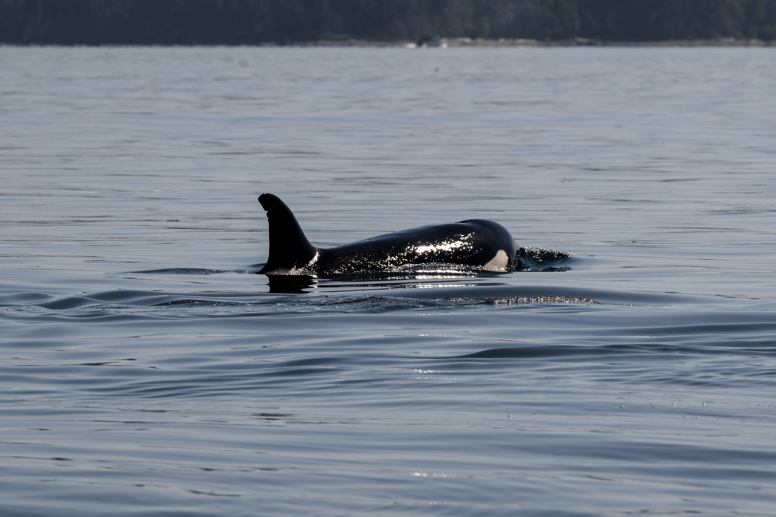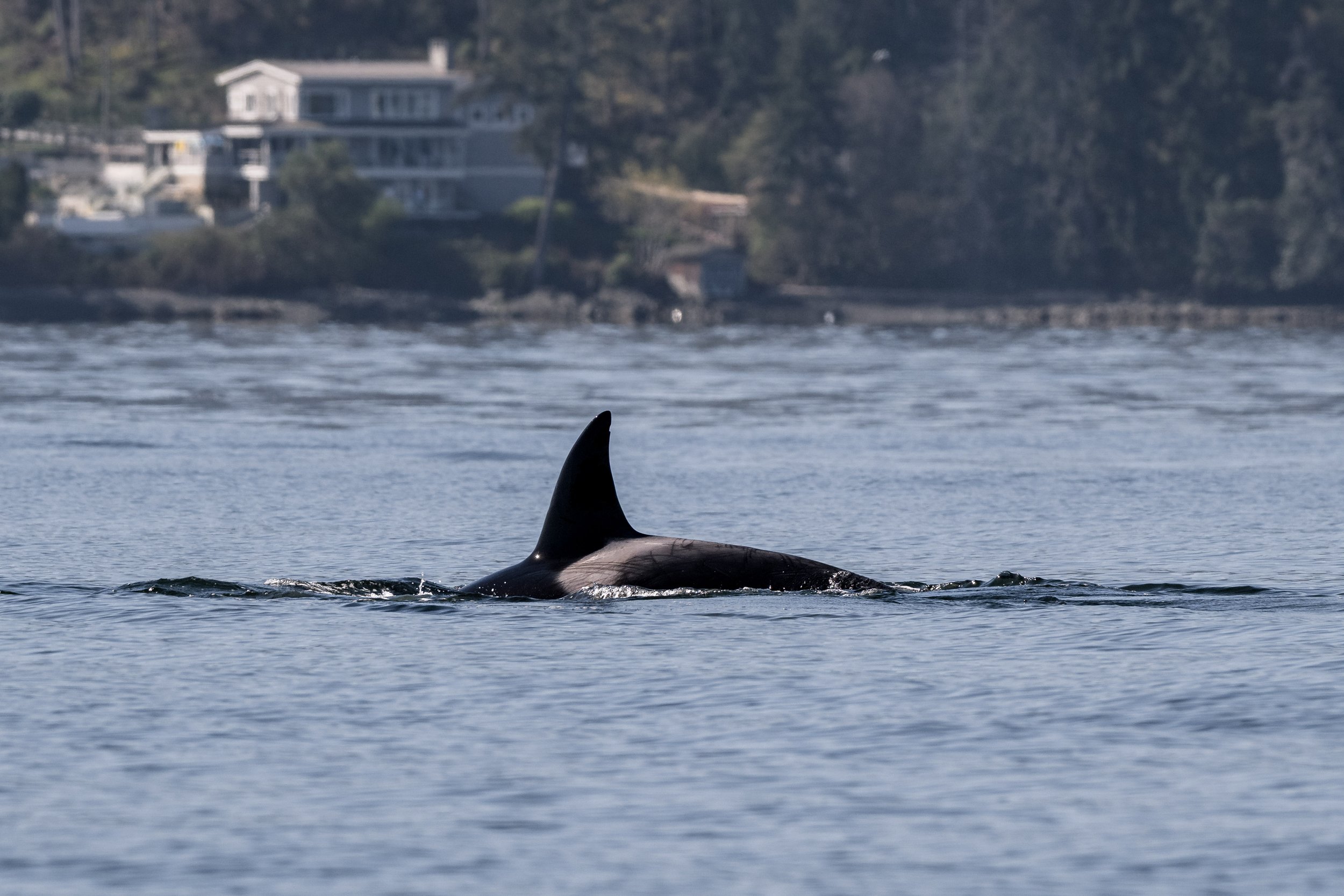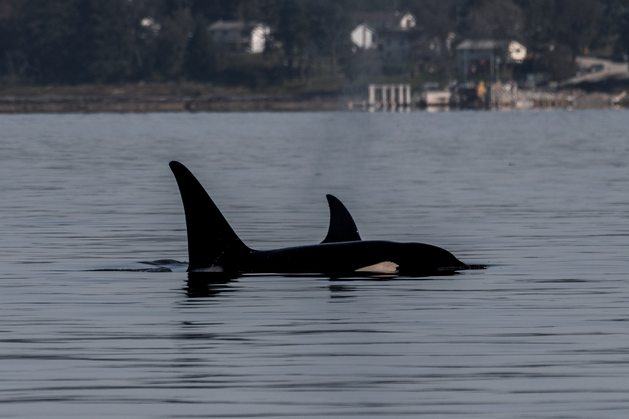 As we neared Chemainus, a quiet excitement began to build. Cutting cleanly through the calm surface was the unmistakable silhouette of a tall, black dorsal fin. Even at a distance, there is something instantly recognizable about that shape. Cameras came up, and telephoto lenses were extended as we moved into position to capture identification shots.