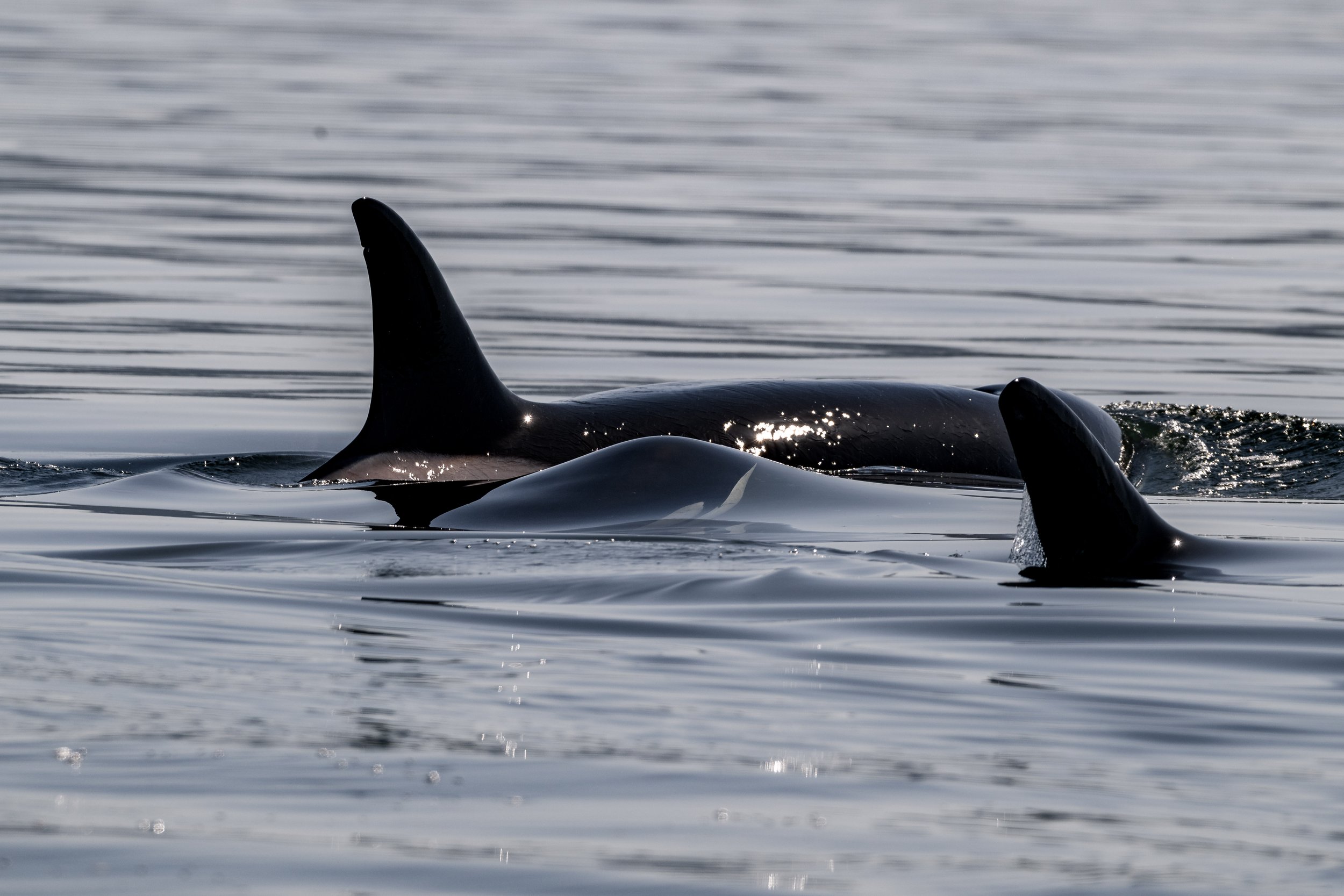 T099C Barakat and T099 Bella surfacing alongside each other showing how large Barakats dorsal fin is getting! Photo by Evan Hessels.