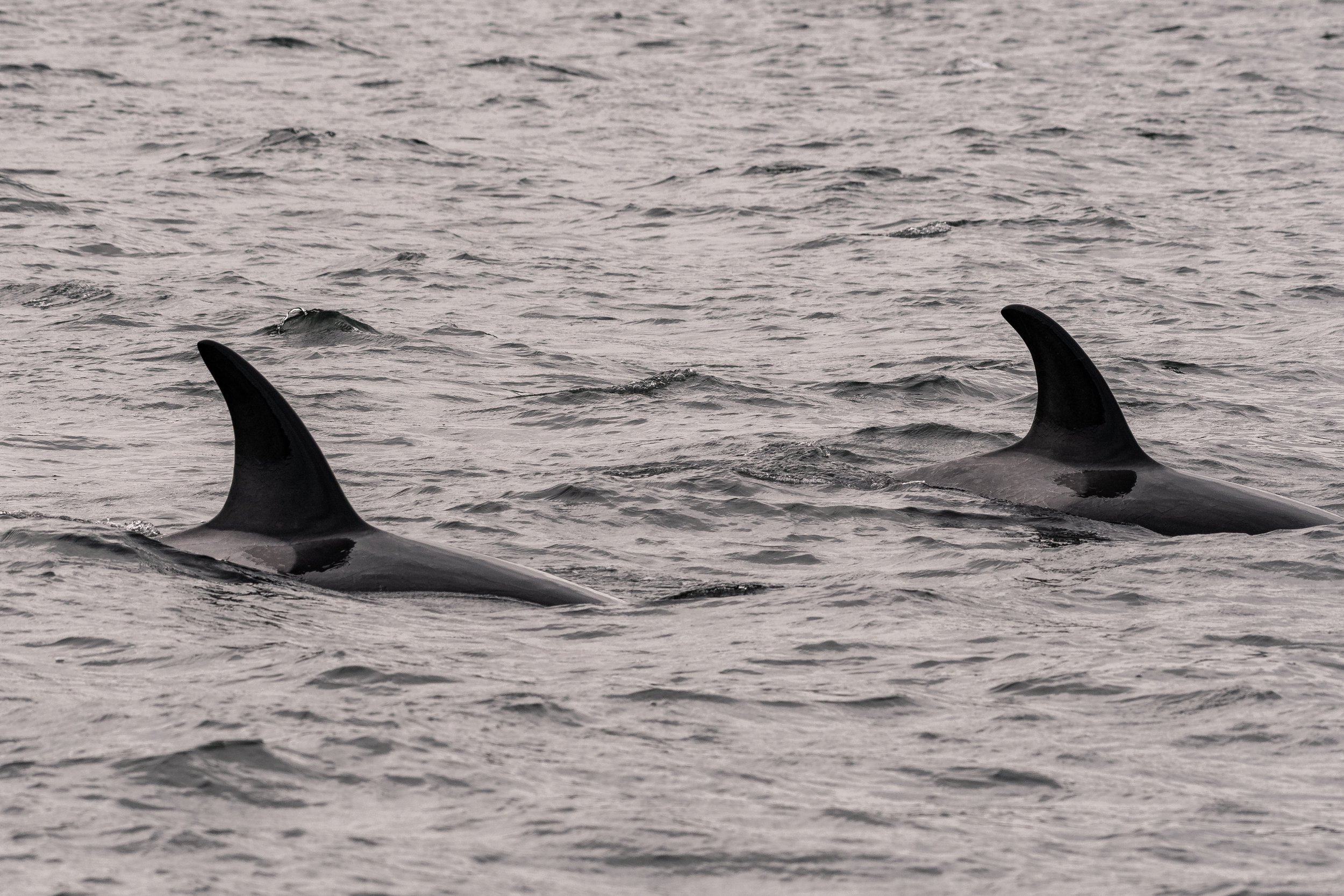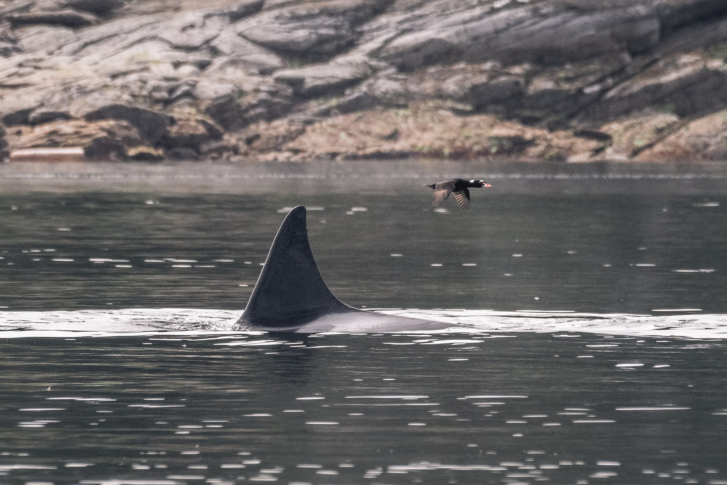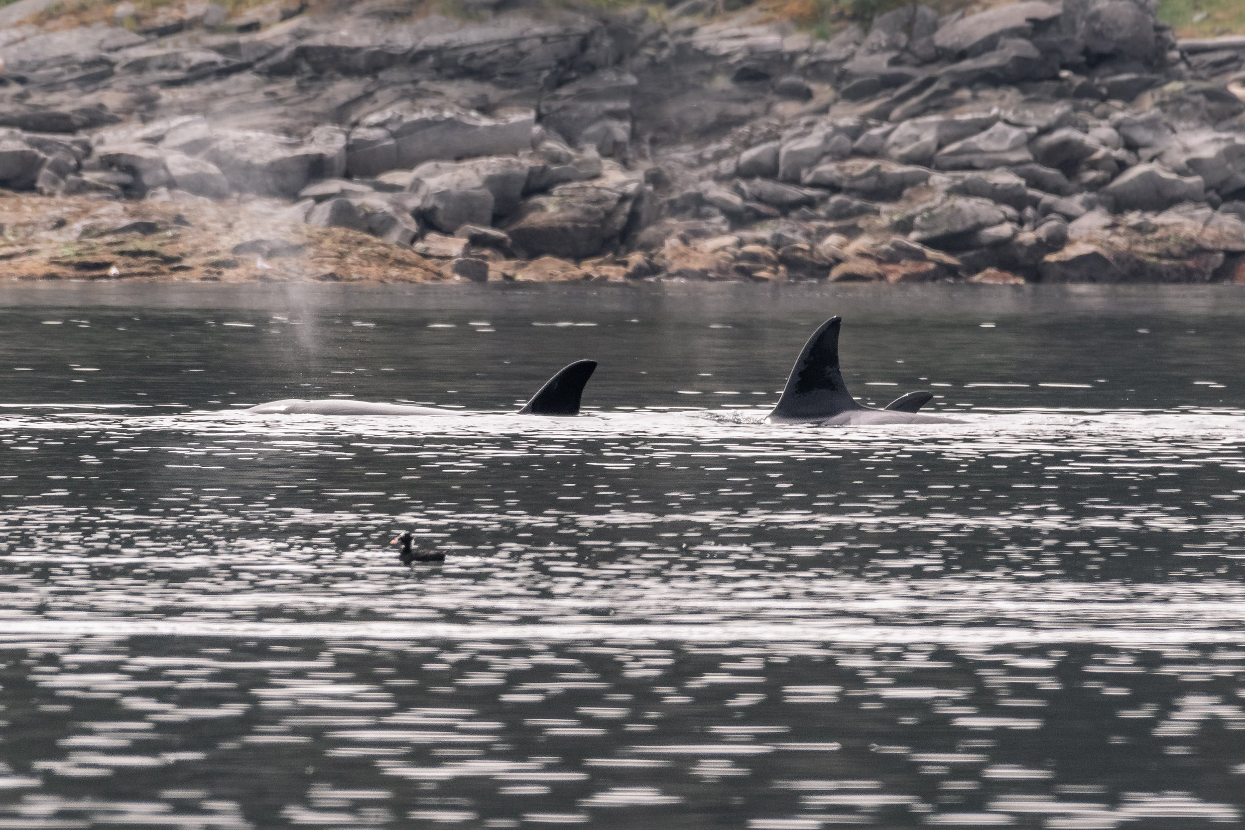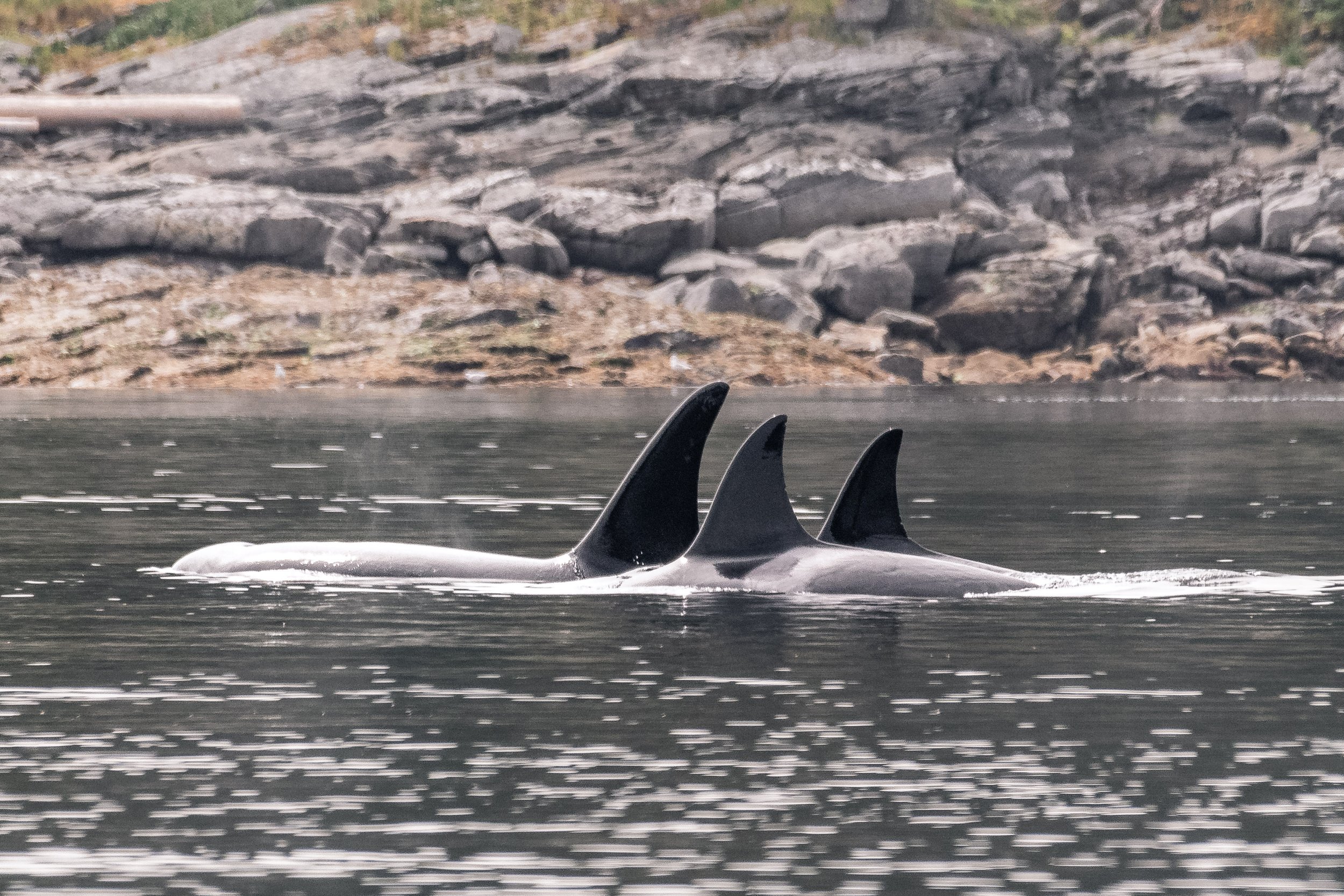 Kula eased out of the harbour and rounded the corner, beginning our journey northbound. We passed familiar landmarks along the way, including Departure Bay, the Five Finger Islands, and Pipers Lagoon, before continuing up toward Lantzville, with Nanoose Bay stretching out in the distance. It was here that we spotted them: four dorsal fins appeared ahead, one tall and prominent, with three smaller fins travelling nearby.