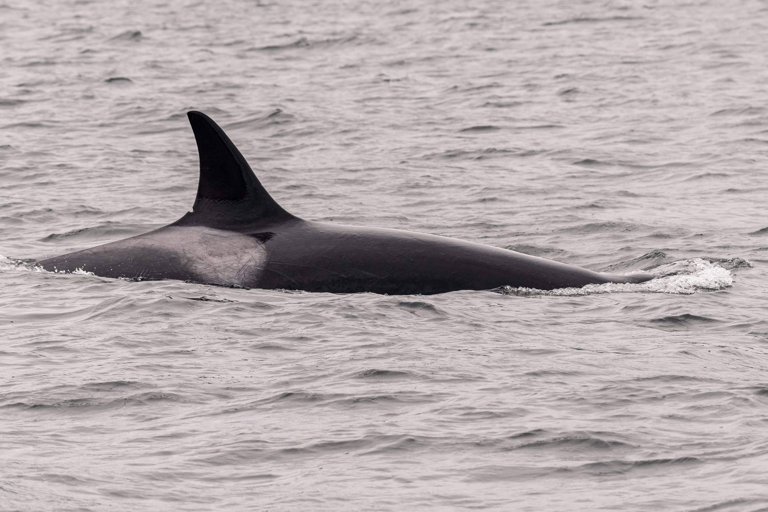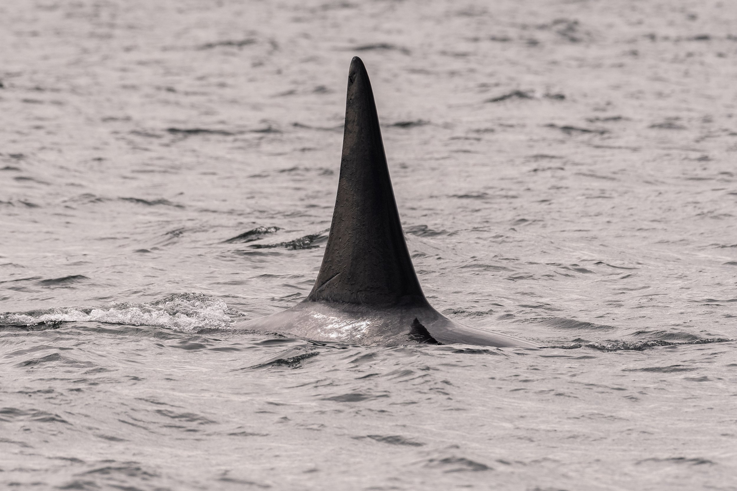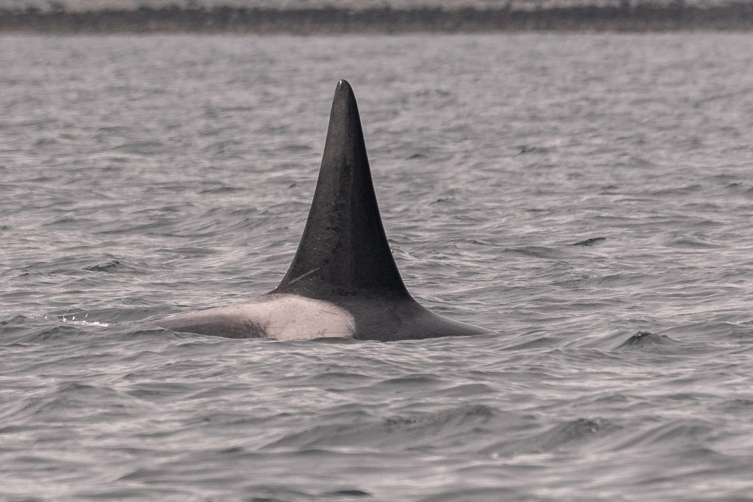 Matriarch T065B Chunk with her distinct dorsal fin visible.