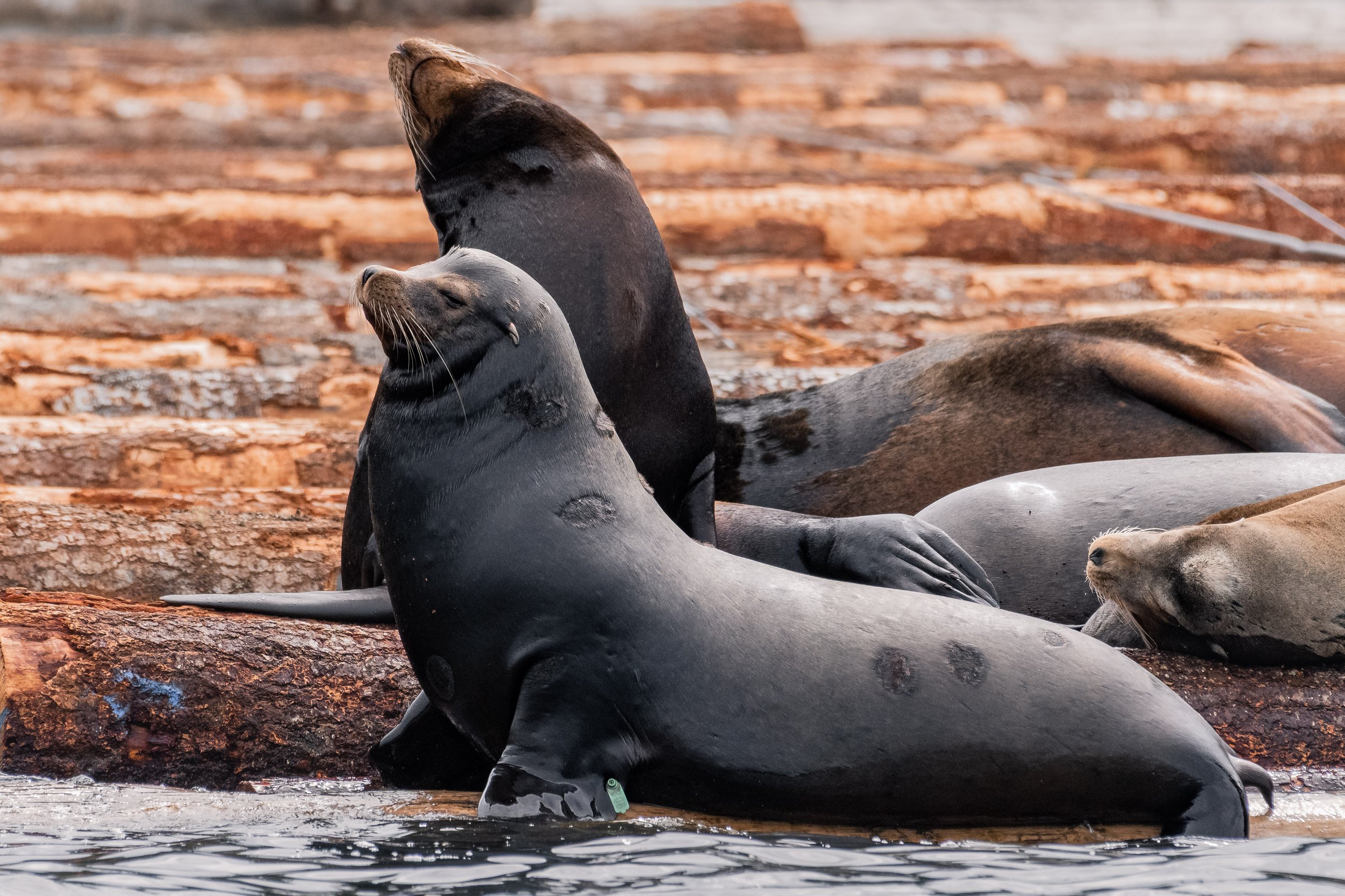 A California Sea Lion resting on the log booms. A small green flipper tag is visible.