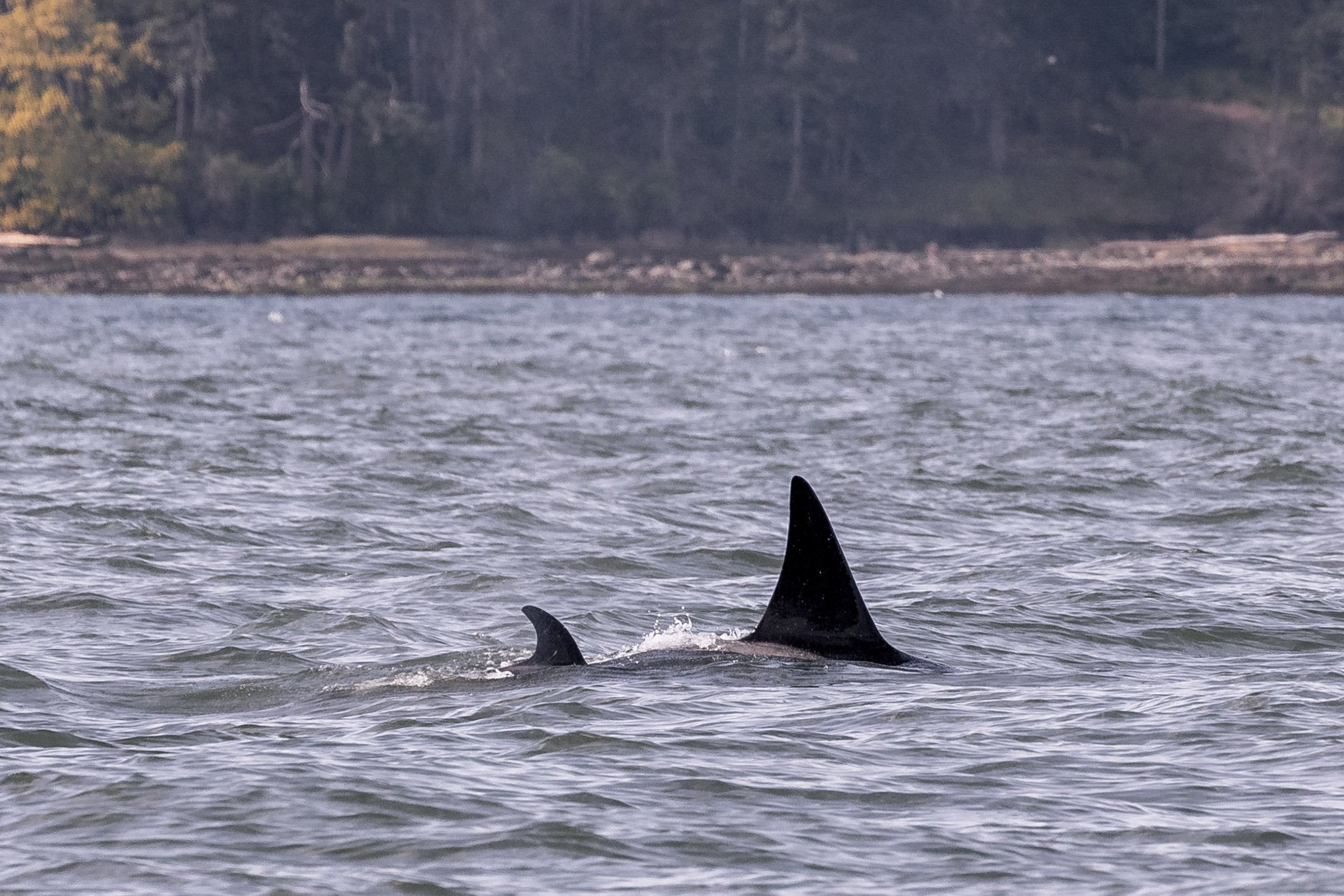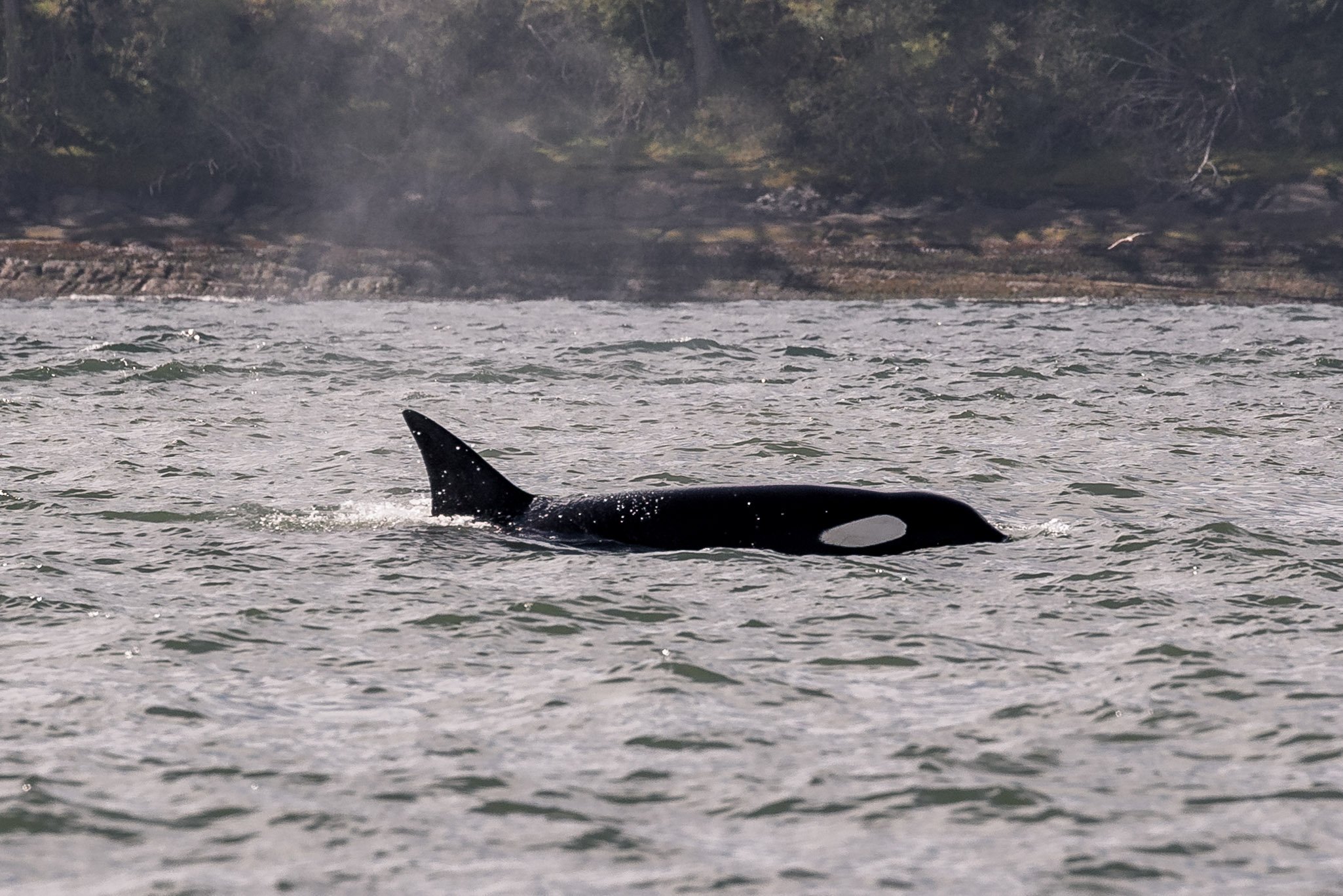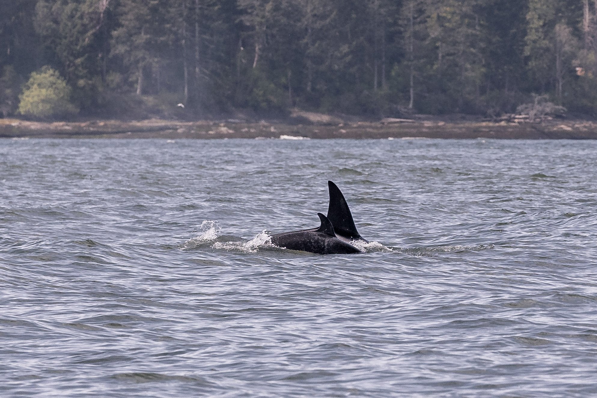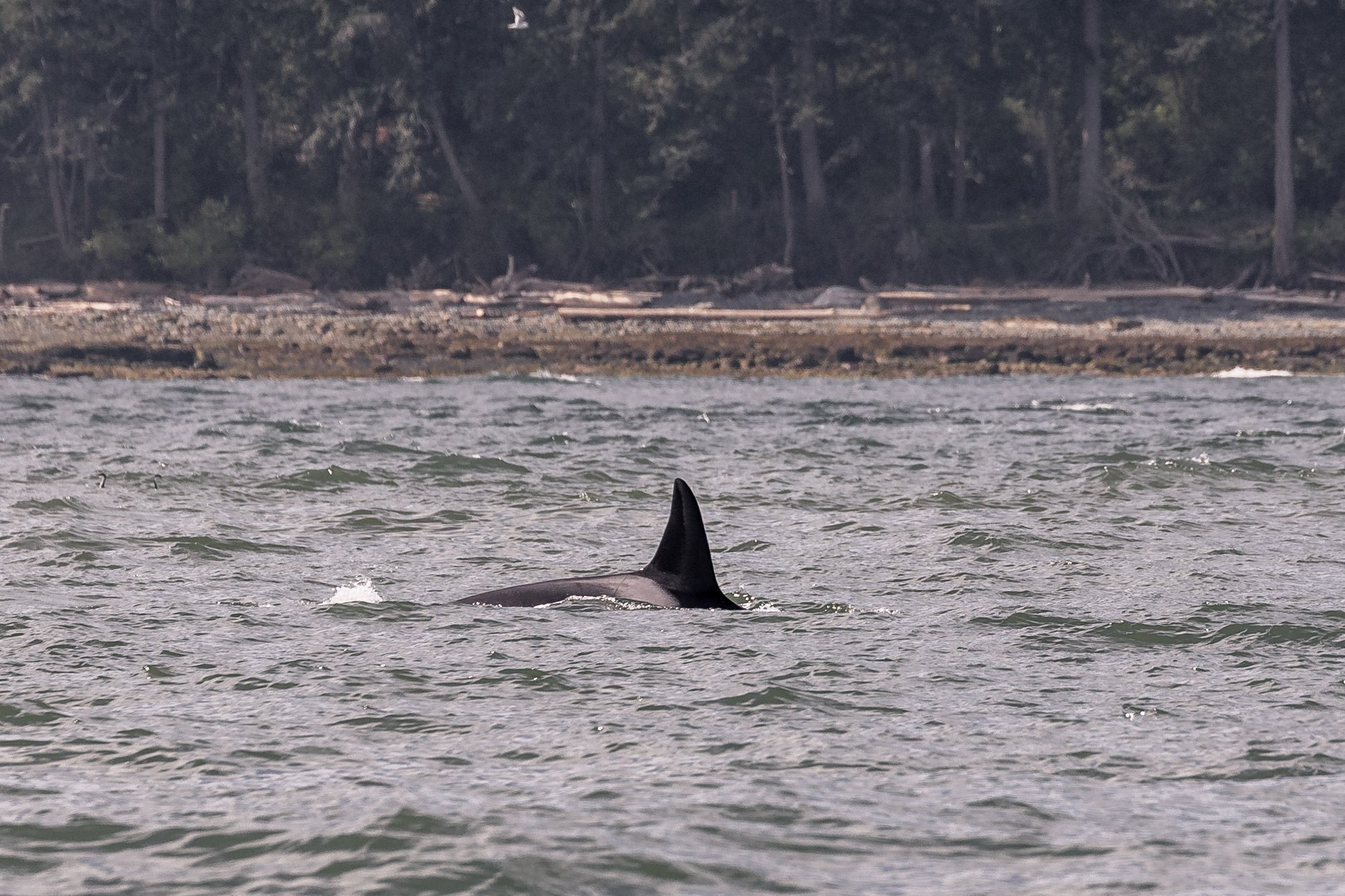Passing through Northumberland Channel, we crossed beautiful Dodd Narrows and continued our trek southbound. We entered Trincomali Channel, making our way steadily along until we reached Porlier Pass. From here, we crossed out and into the open waters of the Strait of Georgia, or the large body of water that separates the mainland of British Columbia from Vancouver Island and the Southern Gulf Islands. Turning south, Captain Laura took us steadily along Galiano’s shoreline. Soon after, we spotted what we were looking for – a handful of small black fins were travelling along northward.