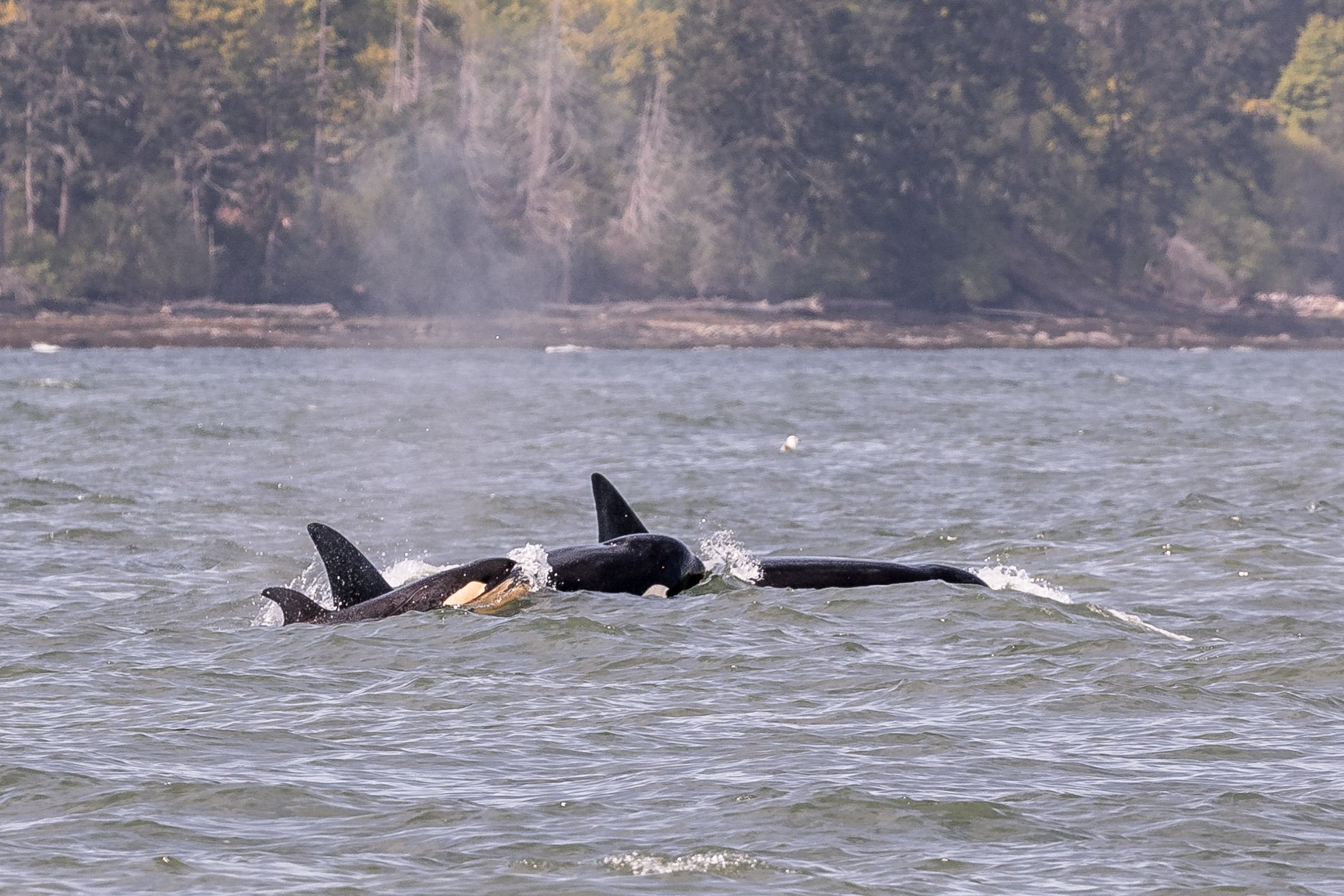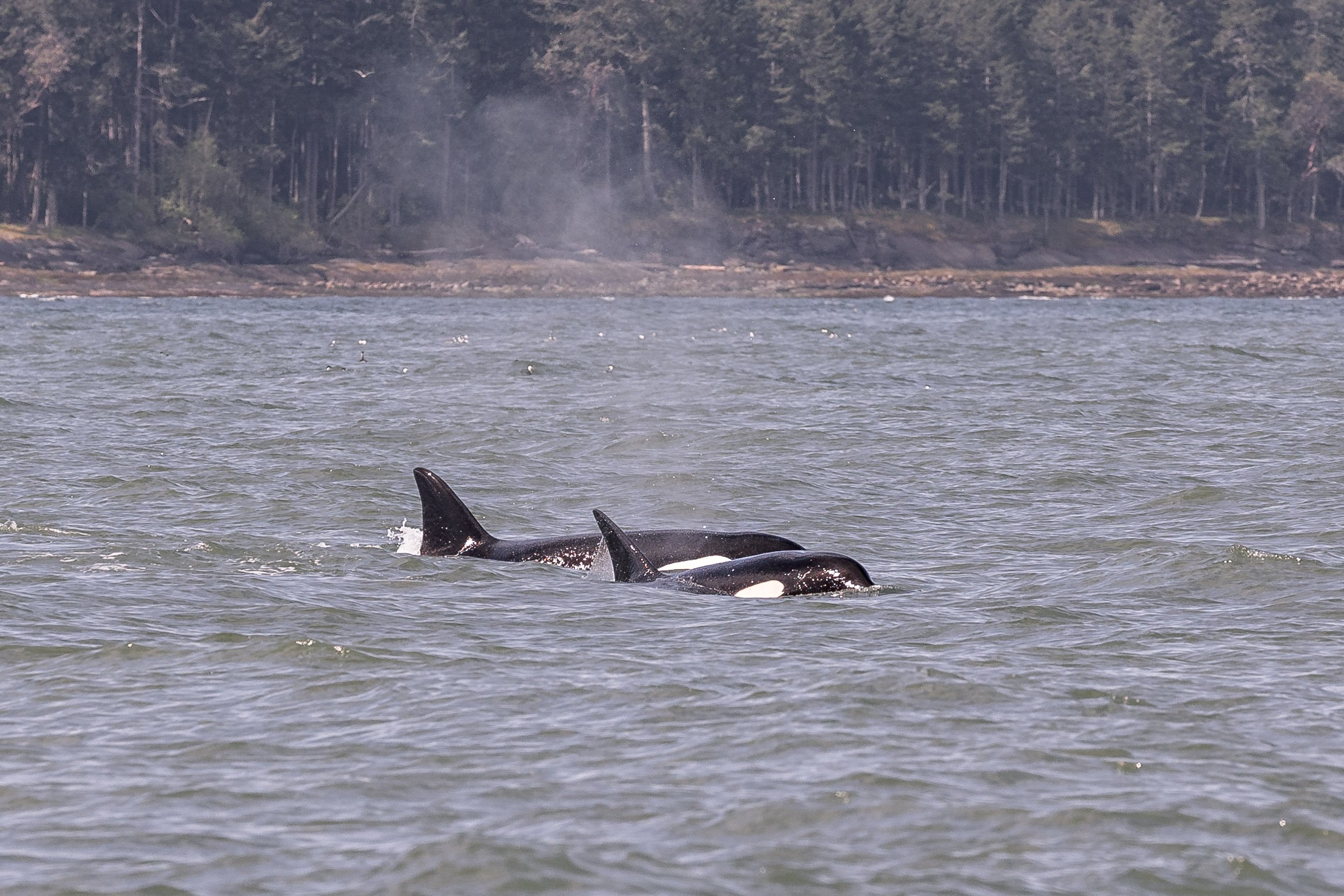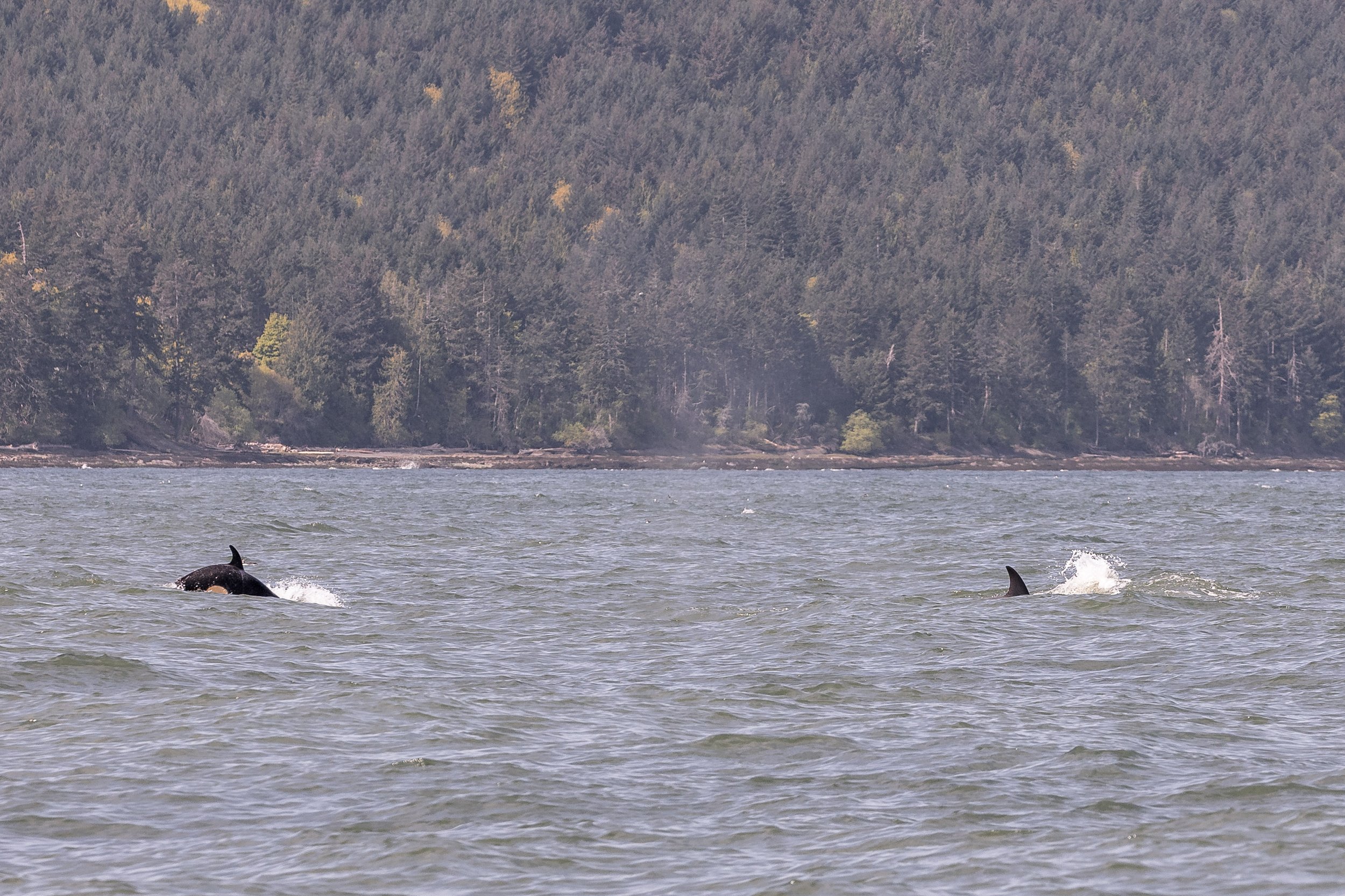 While observing them today, the group of 6 were zigzagging along, likely chasing their next meal. Hunts are a bit different than you would envision them to be, because most of the action happens below the surface of the water. While we did not see what they were chasing, nor if they were successful, shortly after many of the pod members began tail slapping away. Tail slapping and other behaviours on the surface after a hunt often indicate that they succeeded, where the individuals are celebrating after the meal.