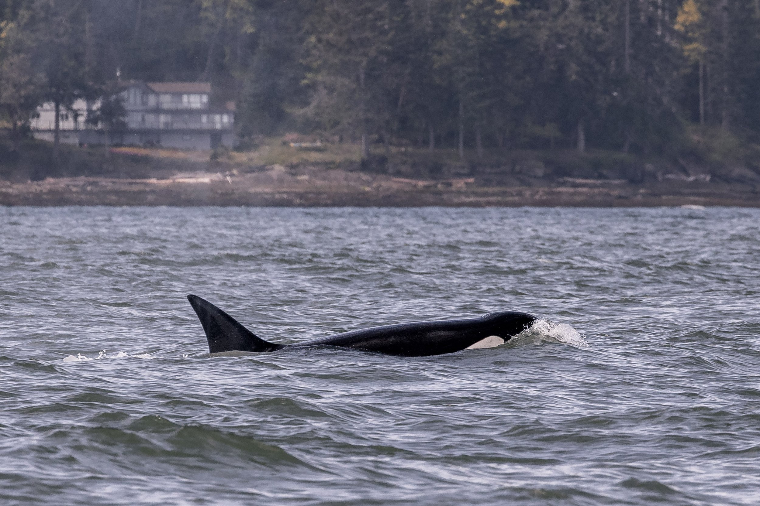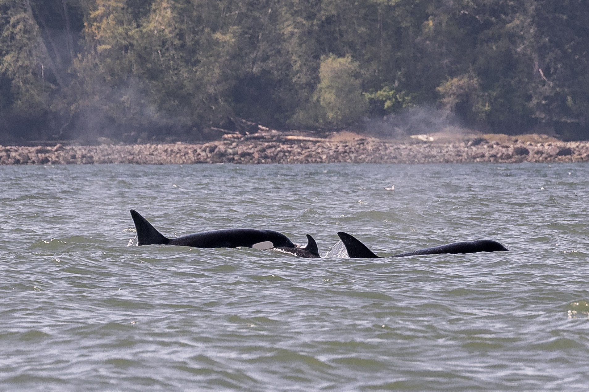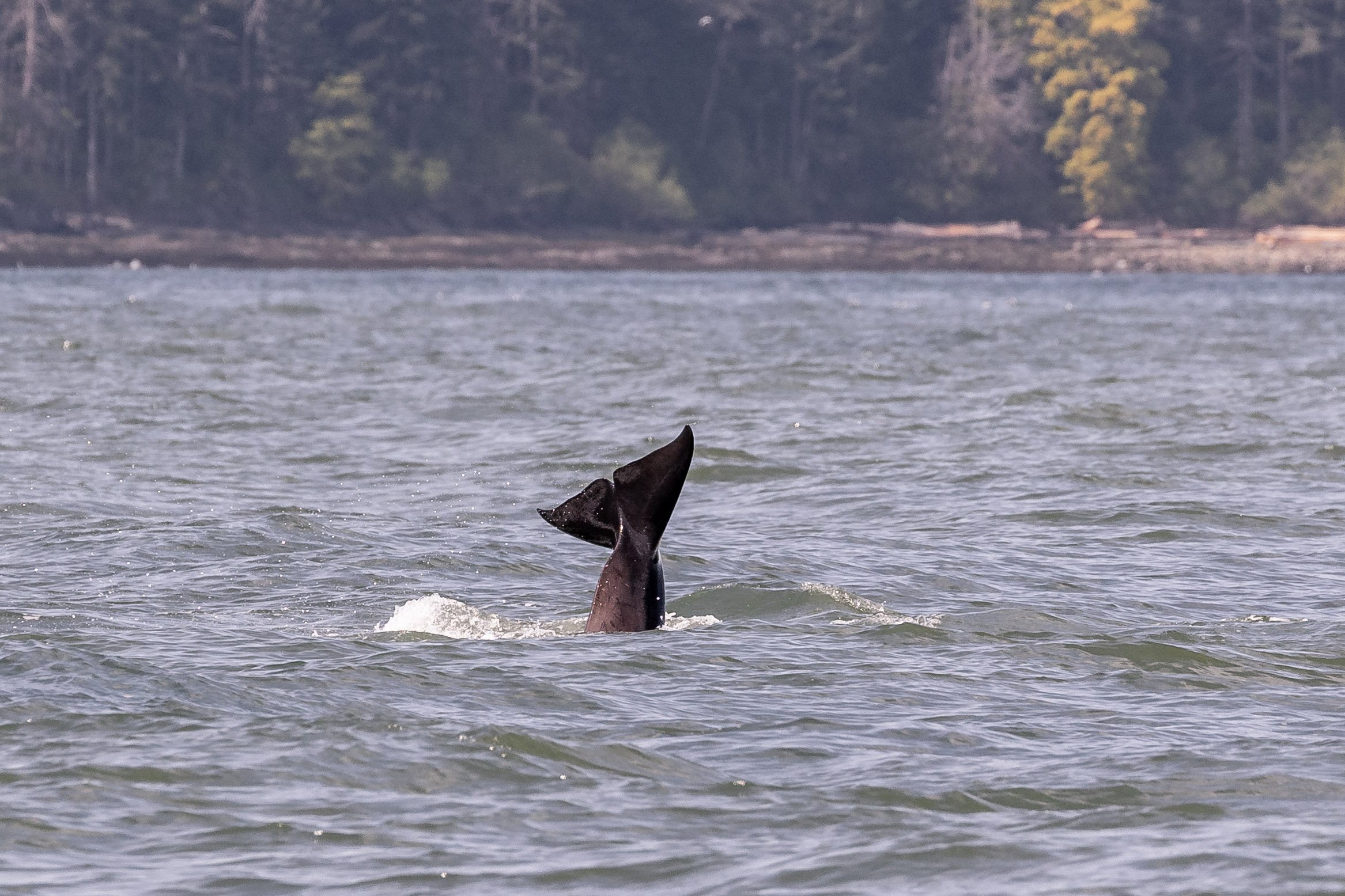 While observing them today, the group of 6 were zigzagging along, likely chasing their next meal. Hunts are a bit different than you would envision them to be, because most of the action happens below the surface of the water. While we did not see what they were chasing, nor if they were successful, shortly after many of the pod members began tail slapping away. Tail slapping and other behaviours on the surface after a hunt often indicate that they succeeded, where the individuals are celebrating after the meal.