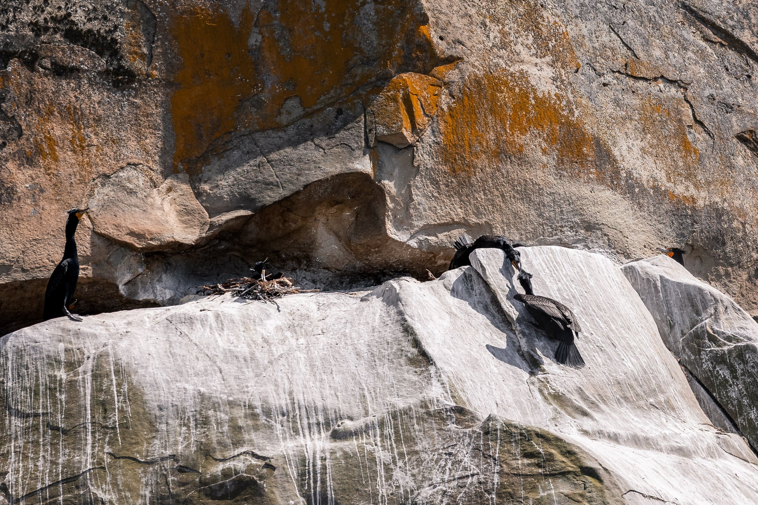 We were nearly back to the harbour, but there was one last stop to make first. Crossing Northumberland Channel, we drifted beside the beautiful Gabriola Island cliffside, where many tiny black birds could be spotted nesting and diving into the waters below. These birds, known as Cormorants, spend their nesting season on this island. While we are not seeing chicks yet, we are eager to see the little ones hatch and to watch them grow up.
