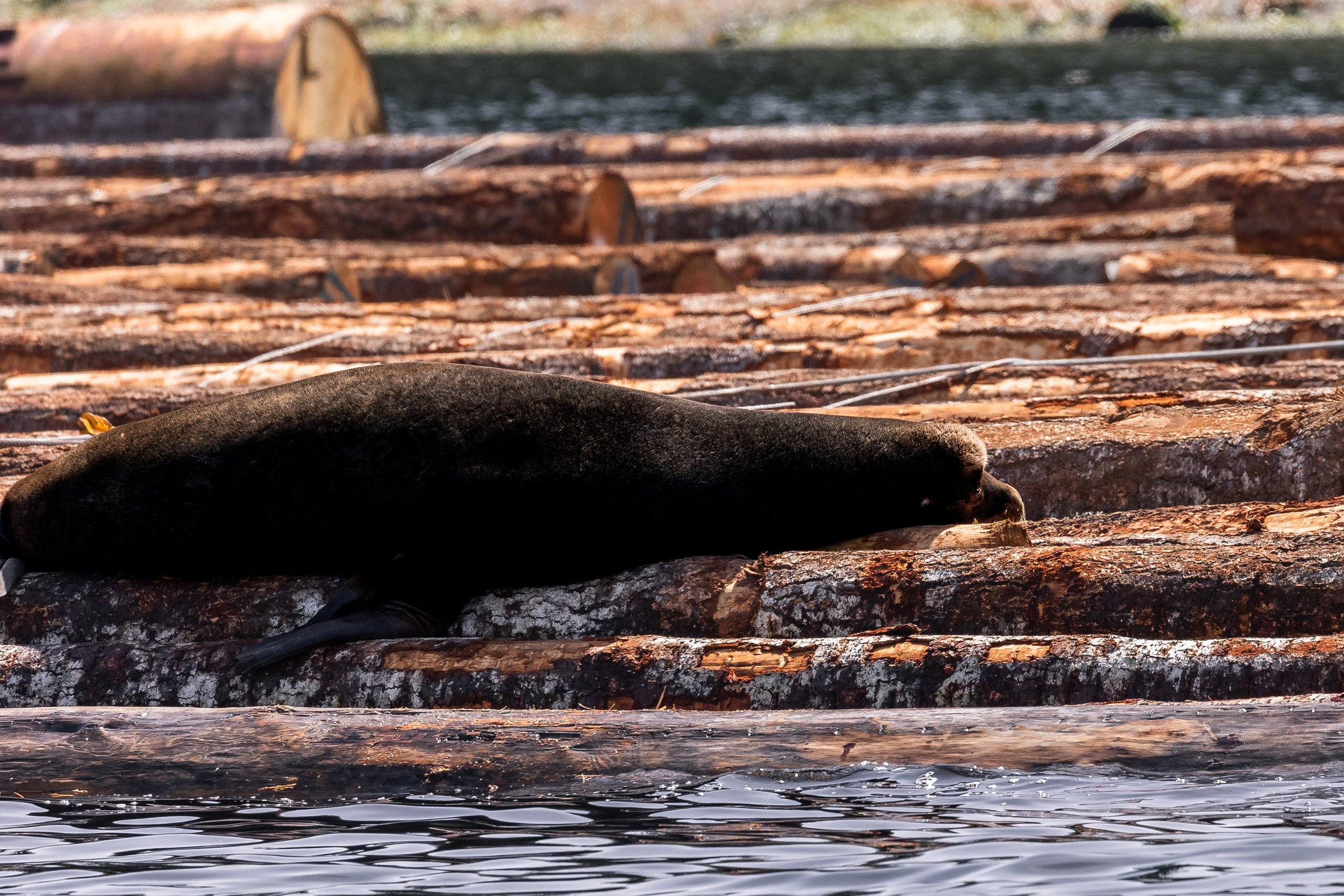 A sleepy California Sealion on the log booms.